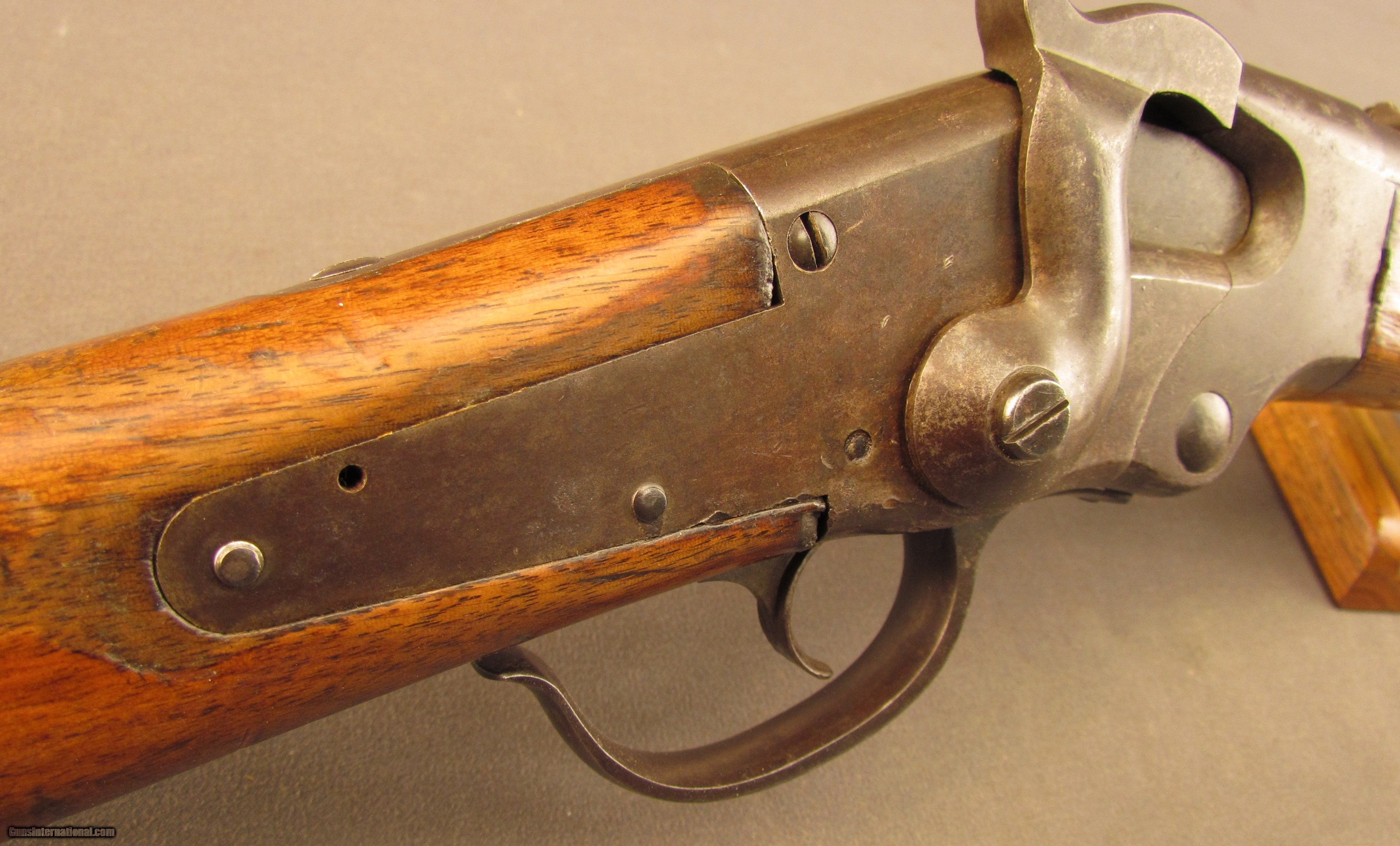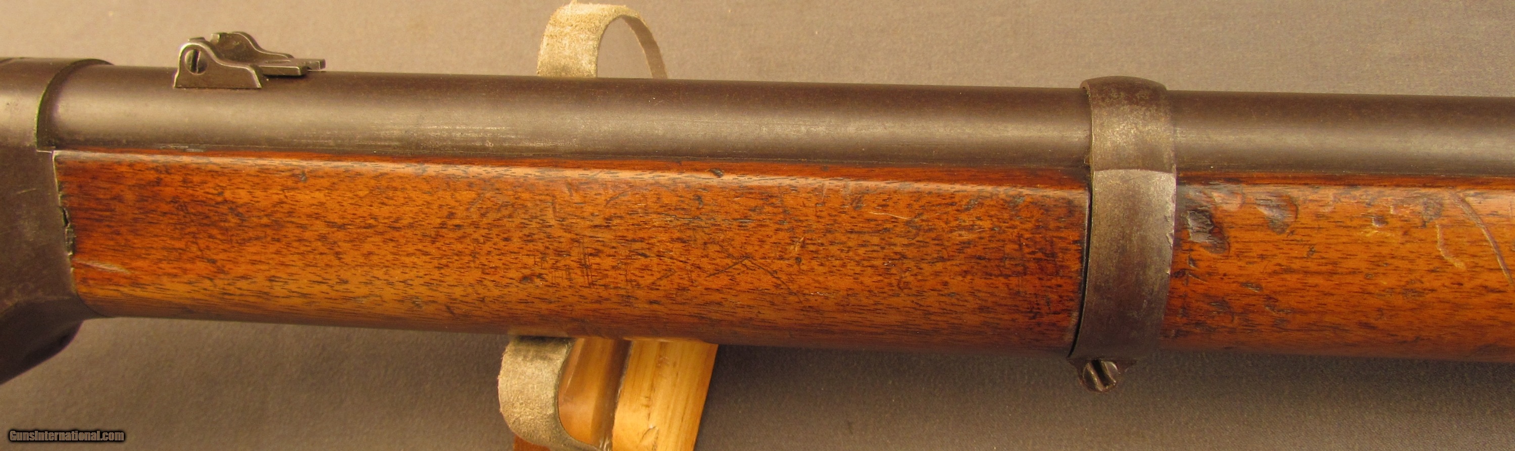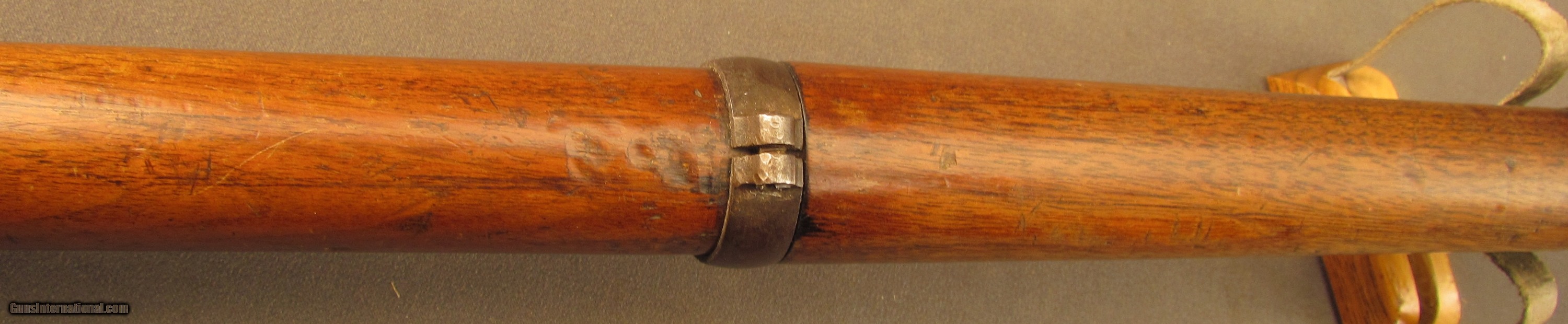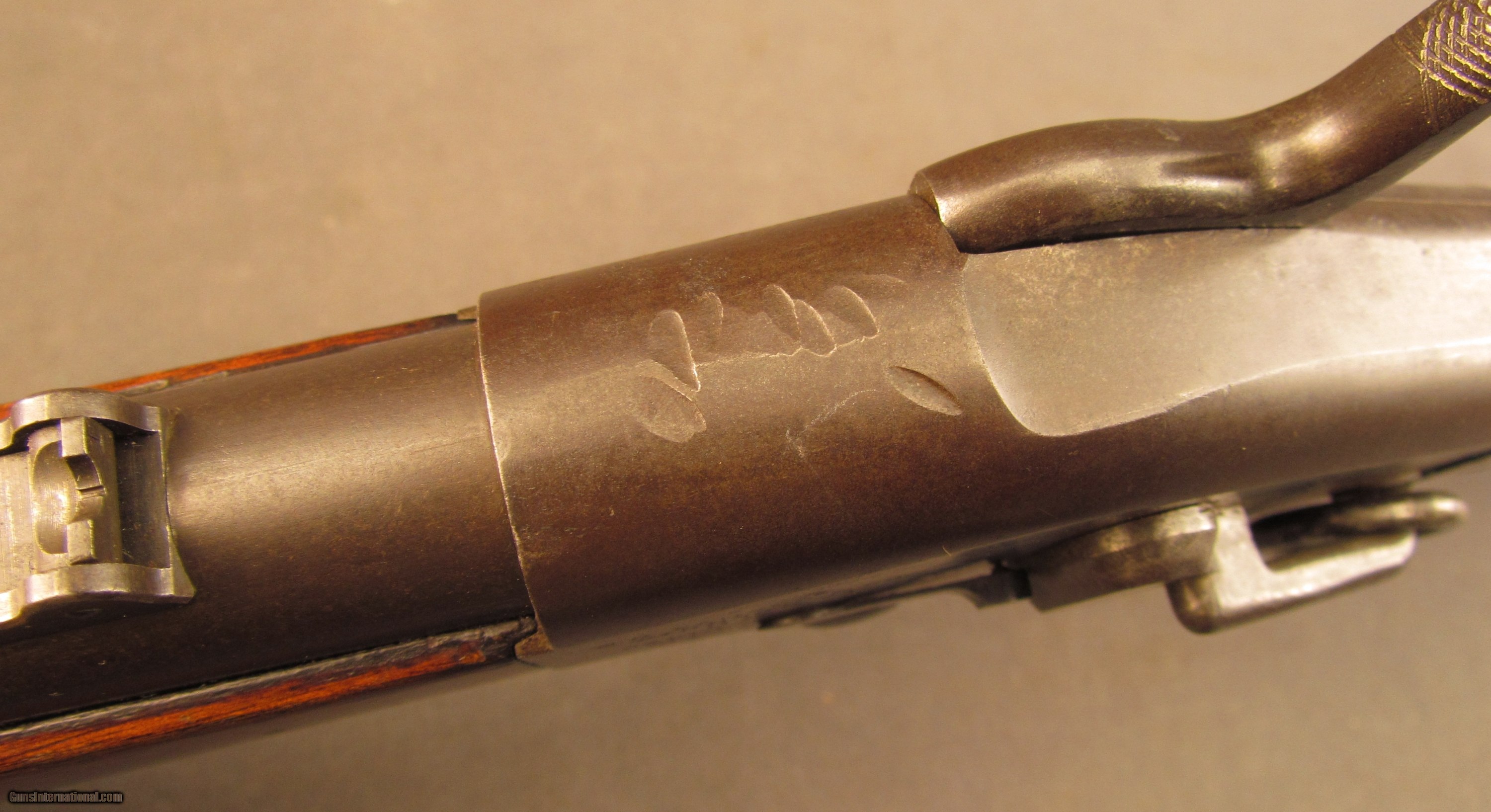 Description: NSN, .50 RF, 20 1/2" barrel with a very good bore that has some light freckling and pitting within the grooves. This is a seldom seen carbine that has an overall dark plum-brown patina with some traces of mild gray on the hammer and right side of the frame and bolt. Additionally, there is a series of peen marks along the top of the receiver and lower edge of the sideplate just behind the hammer. The magazine cut-off on the left side and the triggerguard/lever pin retain about 90% of an added blue finish with mild gray fading on the balance. The "US" and Lamson & Co markings on the left side are still quite clear. The walnut forend and buttstock have an added varnish finish over numerous small handling marks and surface blemishes throughout with a further sizable chip missing from the left side of the wrist. The carbine comes with an original ramrod and the action is fully functional. These carbines were ordered in 1864 but weren't delivered until May of 1865 after hostilities had ceased (1002 produced). Nevertheless, they are considered a secondary Civil War weapon and are seldom seen today. This example is in very good condition and would make a great addition to any collection. Antique SOLD Antique: Yes Manufacturer: Ball Model: Carbine Caliber Info: .50RF Gauge Info: .50RF |