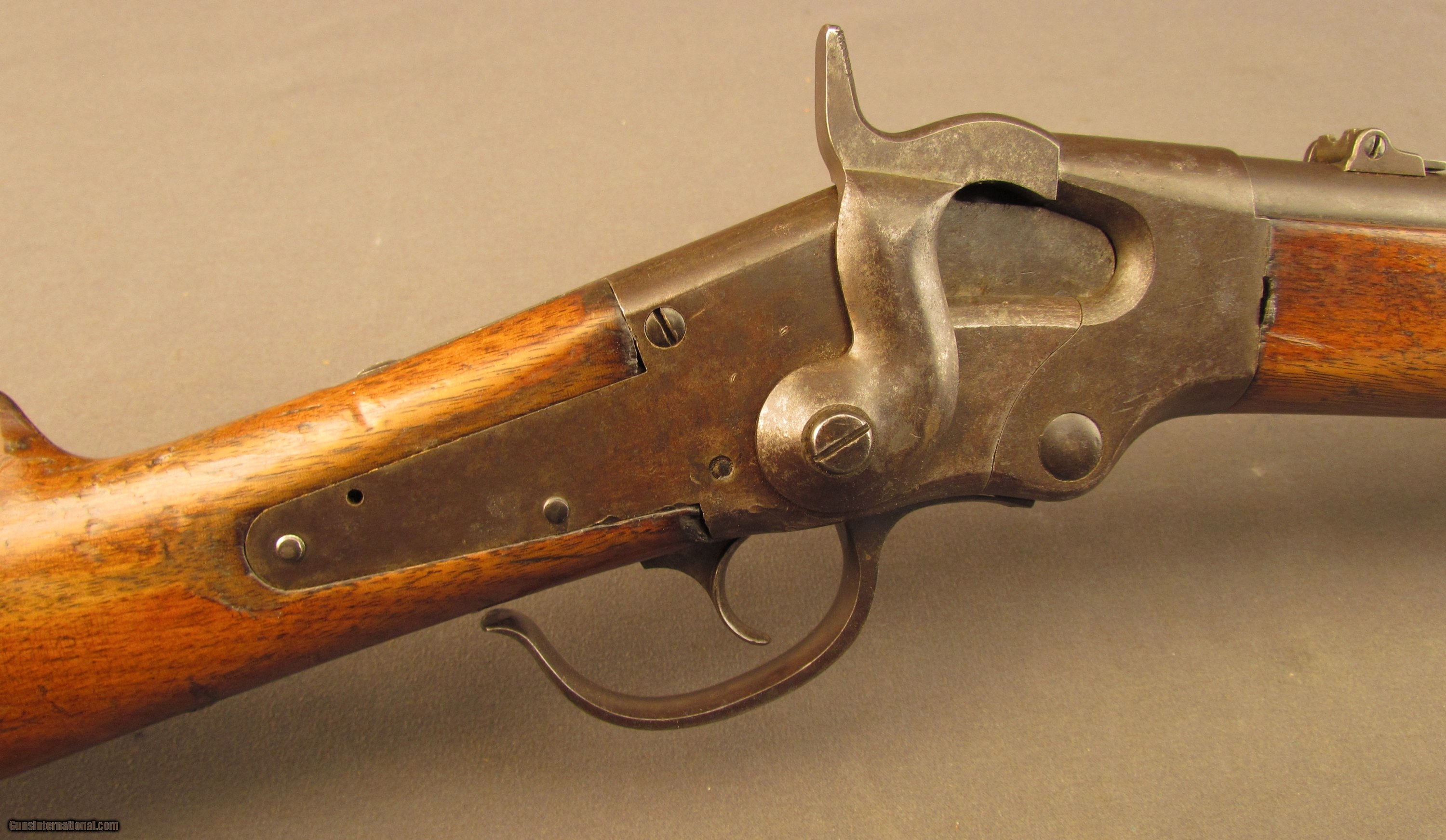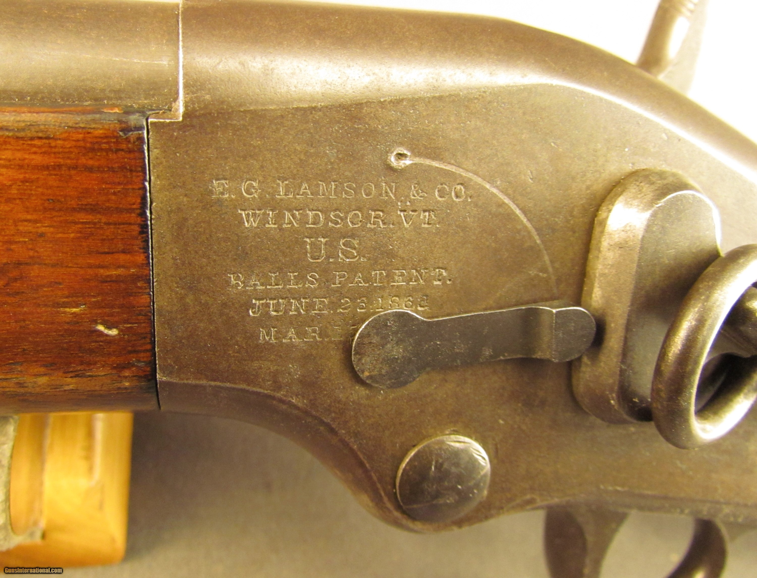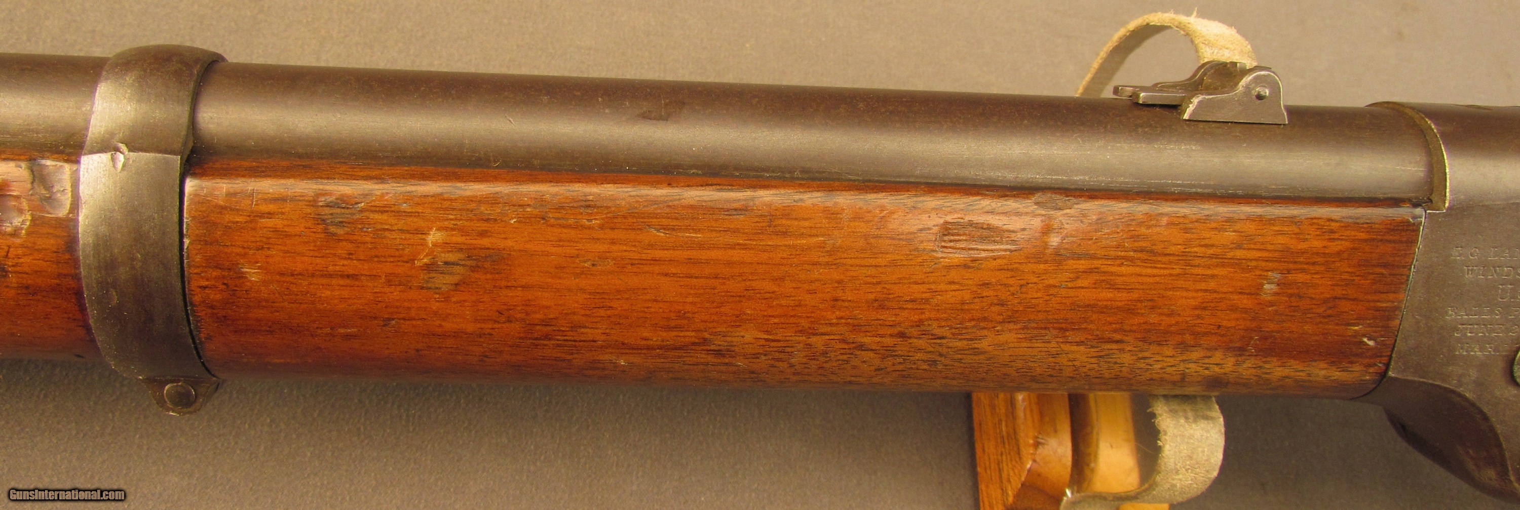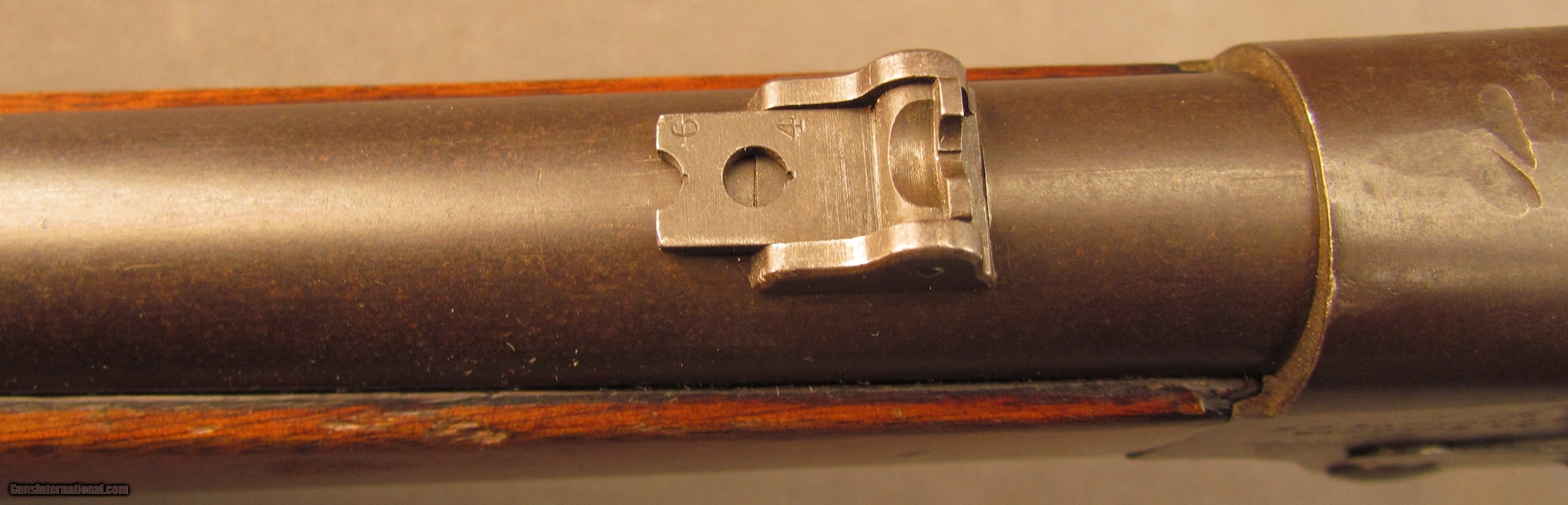 Description: NSN, .50 RF, 20 1/2" barrel with a very good bore that has some light freckling and pitting within the grooves. This is a seldom seen carbine that has an overall dark plum-brown patina with some traces of mild gray on the hammer and right side of the frame and bolt. Additionally, there is a series of peen marks along the top of the receiver and lower edge of the sideplate just behind the hammer. The magazine cut-off on the left side and the triggerguard/lever pin retain about 90% of an added blue finish with mild gray fading on the balance. The "US" and Lamson & Co markings on the left side are still quite clear. The walnut forend and buttstock have an added varnish finish over numerous small handling marks and surface blemishes throughout with a further sizable chip missing from the left side of the wrist. The carbine comes with an original ramrod and the action is fully functional. These carbines were ordered in 1864 but weren't delivered until May of 1865 after hostilities had ceased (1002 produced). Nevertheless, they are considered a secondary Civil War weapon and are seldom seen today. This example is in very good condition and would make a great addition to any collection. Antique SOLD Antique: Yes Manufacturer: Ball Model: Carbine Caliber Info: .50RF Gauge Info: .50RF |