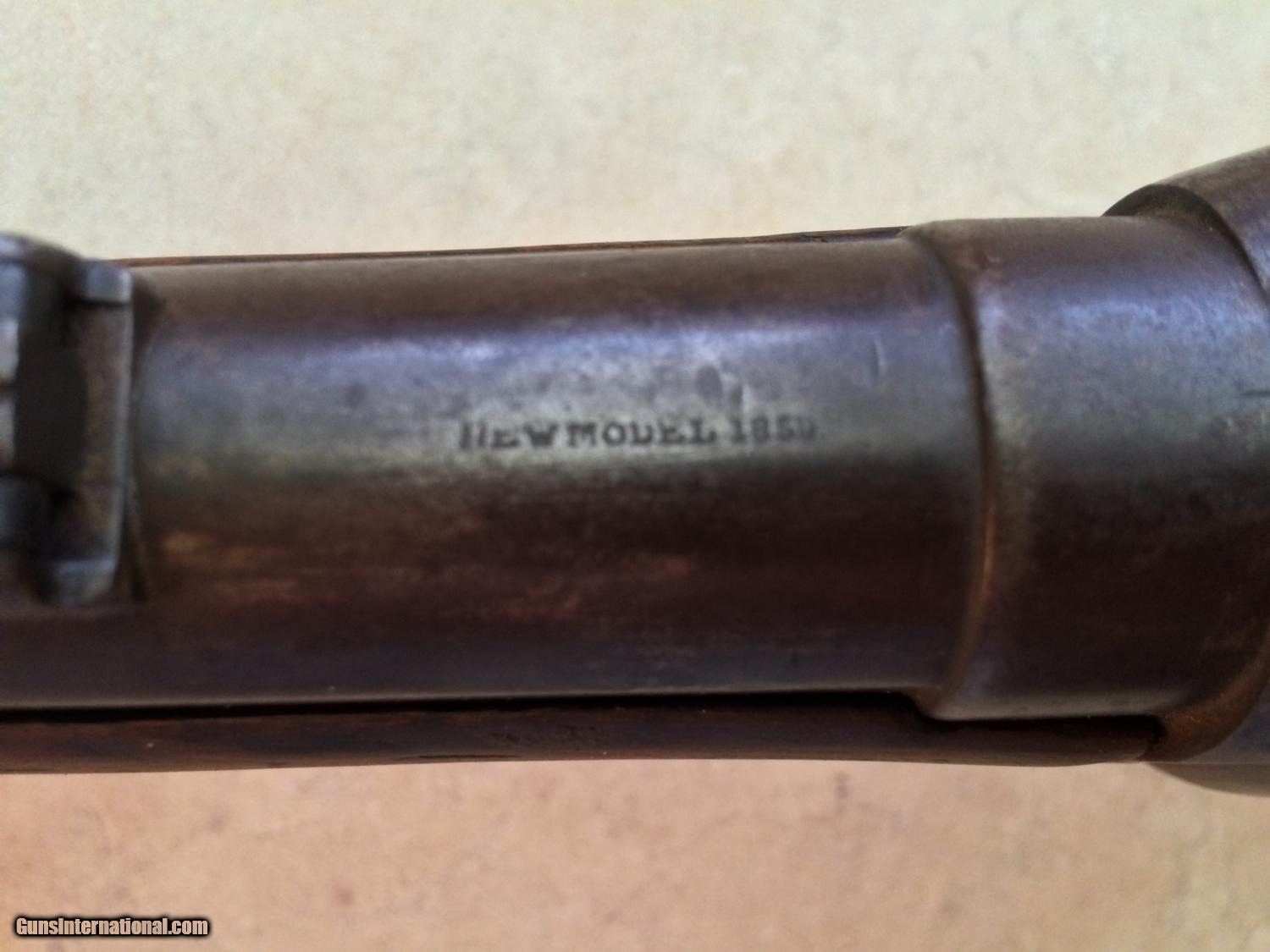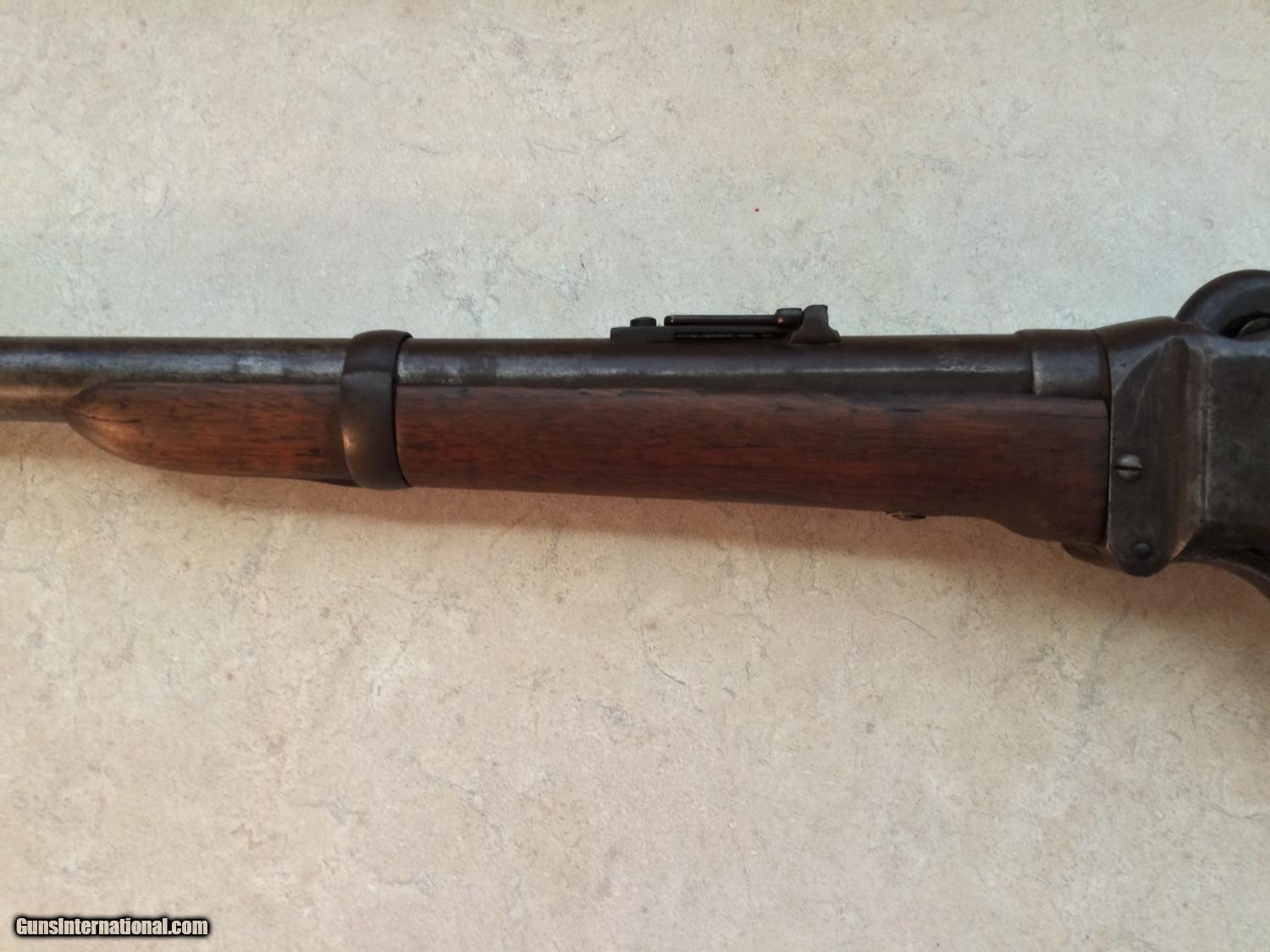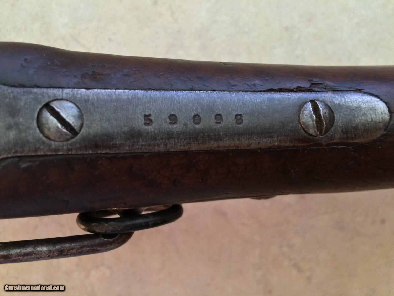 Description: This is a very nice looking desirable Civil War Sharps Model 1859 Carbine with the iron patchbox. This one has matching serial numbers of 59,098 which would put it in the Civil War production time. The barrel and lock have a nice smooth dark gray patina and you can clearly read the Sharps patent marks on the front and backside of the frame and New Model 1859 stamped on the barrel. The action is strong and works well on all positions. The barrel is full length with the original front and rear sights intact. The inside of the barrel still retains a nice amount of the bore with each land and groove being visible. On the back of the frame it has saddle bar and ring. The stock of the gun is solid and in nice shape, no major cracks or repairs. the iron patchbox is in great shape and opens and closes as it should.. The initials DHT, possibly that of a soldier have been carved in the stock. This great Civil War collectable is priced to sell and it is worth much more, then what I'm asking. Shipping is $35.00 tracking number provided. SOLD Antique: Yes |