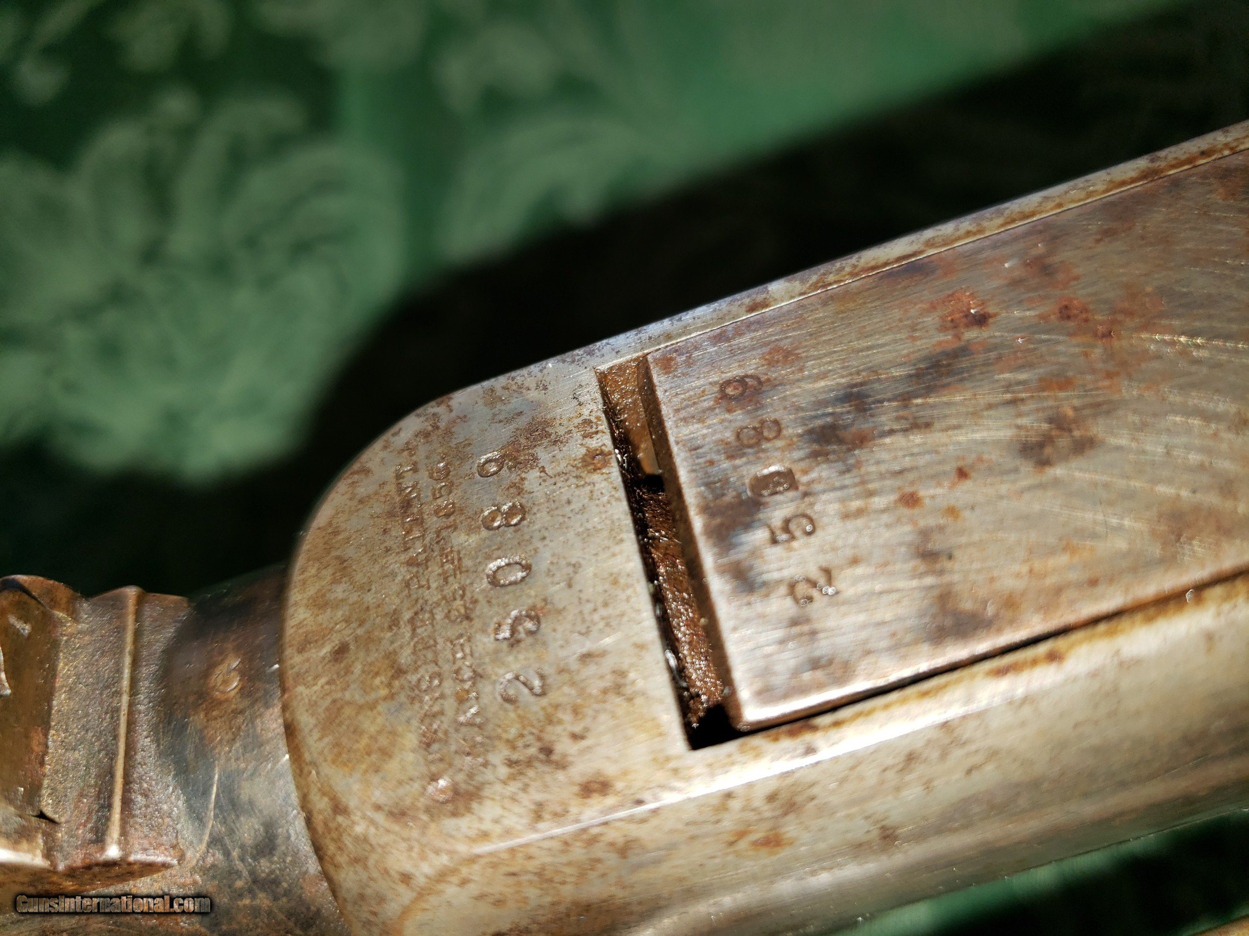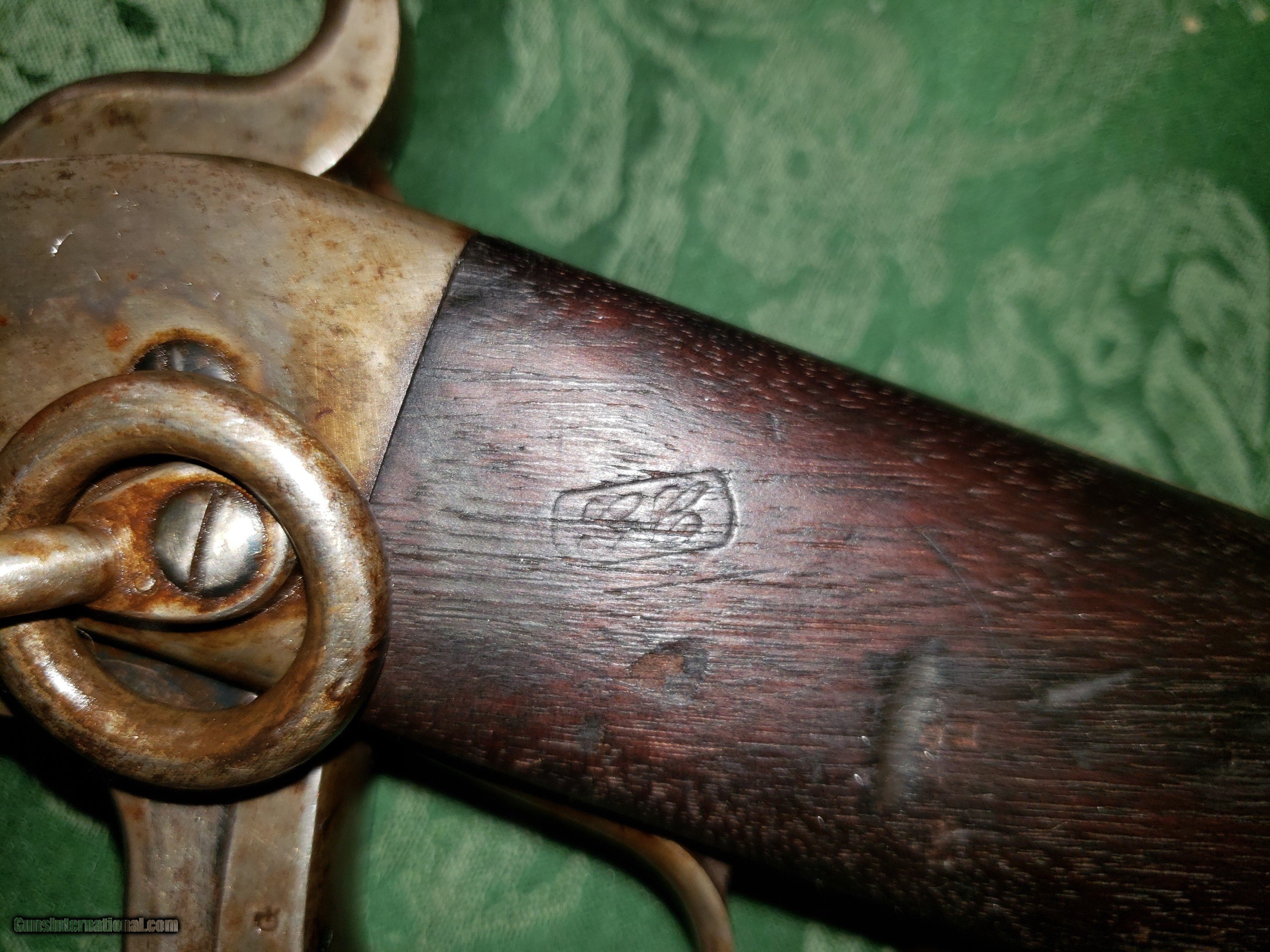 Description: BURNSIDE CIVIL WAR CARBINE, US CAVALRY .54 cal., Serial #25089. Early serial number. Oval cartouche on left side. Length of barrel 21", total length 39.5". Condition: Good, traces of case colors, original finish in protected areas, smooth metal with no rust or pitting. Barrel, block, and plate finish gun metal, minor oxidation in places. Action mechanically very good. Bore shows full lands and grooves, with oxidation. Peak of the stock was rounded in a period user-preference modification as is visible in the photos. Some of the regiments that were issued Burnside carbines were: 1st New Jersey, 1st Michigan, 3rd Indiana, 5th, 6th and 7th Ohio, 3rd West Virgina, 13th, 14th and 18th Pennsylvania, 14th and 21st New York Verteran Cavalry, 2nd, 12th, 14th and 16th Illinois. $68 Shipping. Shipping includes $40 shipping plus 2% of sales-price for insurance. I do not ship without insurance. SOLD |