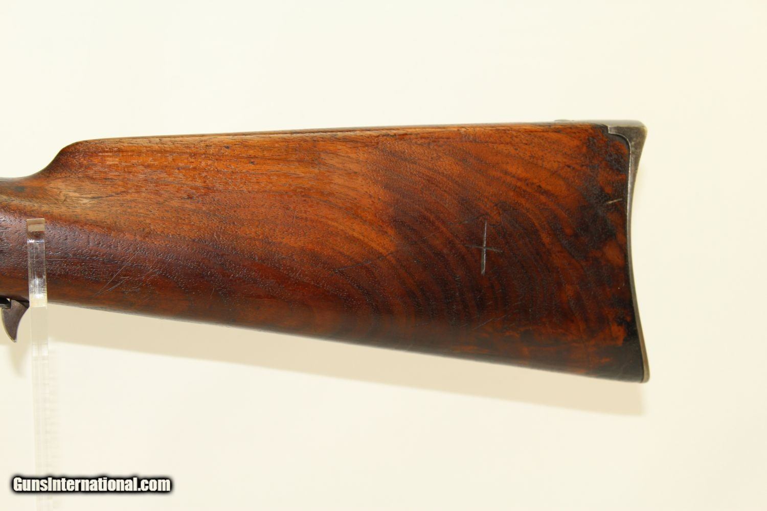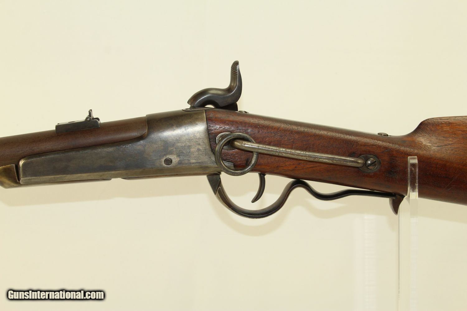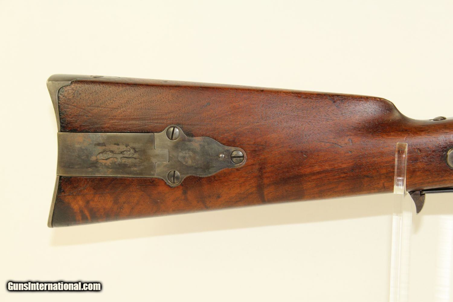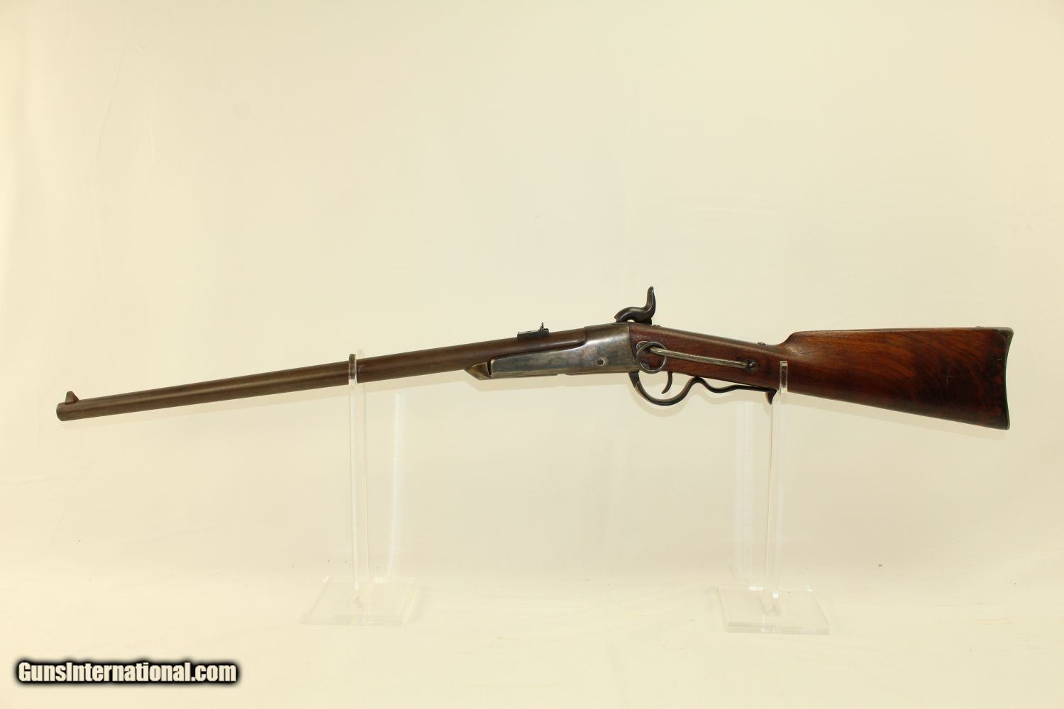 Description: Civil War CAVALRY CARBINE by RICHARDSON & OVERMAN VERY NICE Example of the Gallager Patent Carbine Here we present an antique Civil War Richardson & Overman Gallager Patent Percussion Carbine manufactured in the early 1860s. This carbine was invented by South Carolina native Mahlon Gallager, who licensed the design to Richardson and Overman of Philadelphia for production. On August 31, 1861, the first Gallager was sold to the U.S. Army. 22,728 Gallager carbines were purchased during the Civil War and saw extensive use as a cavalry arm with the Union troops. Both percussion and metallic cartridge versions of the Gallager carbine were manufactured, but extraction problems with both cartridge types made this rifle somewhat unpopular with the troops that used it. This carbine fired an unprimed .50 caliber cartridge with a brass foil and paper-wrapped case. Ignition was provided by the percussion cap. A major fault of these carbines was the absence of a suitable extractor. The case had to be extracted with a knife or some other sharp tool. When the trigger guard lever is lowered, the barrel slides out from the frame and tips downward to receive the cartridge. This cavalry carbine was known to be used by the 2nd, 3rd, 4th and 6th Ohio, the 13th Tennessee and the 3rd West Virginia cavalries. It still bears a clear government inspector cartouche with the initials for William H. Russell. The overall condition is very good plus. The iron parts are smooth and gray. The markings are clear. The walnut stock is in very good condition. The bore is in great shape with sharp rifling. The action is excellent, strong and crisp. Own the original! This is a legitimate antique and not a reproduction. Barrel is 22 ¼ inches. Caliber: .50 Percussion Overall condition as seen in photos. Very Fast. Very Safe. FREE SHIPPING WORLDWIDE. Delivered directly to your door by express mail! Guaranteed AUTHENTIC & Includes CERTIFICATE OF AUTHENTICITY. ancestryguns $2425 #190081 SOLD Antique: Yes |