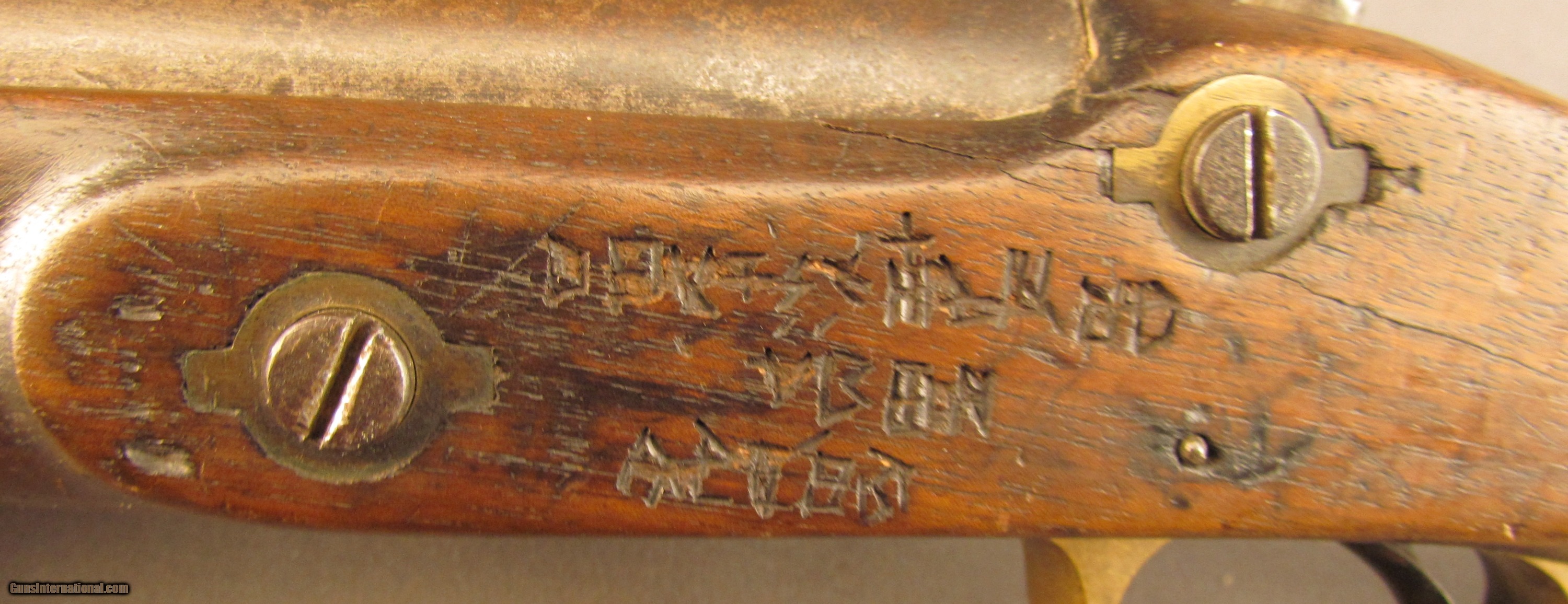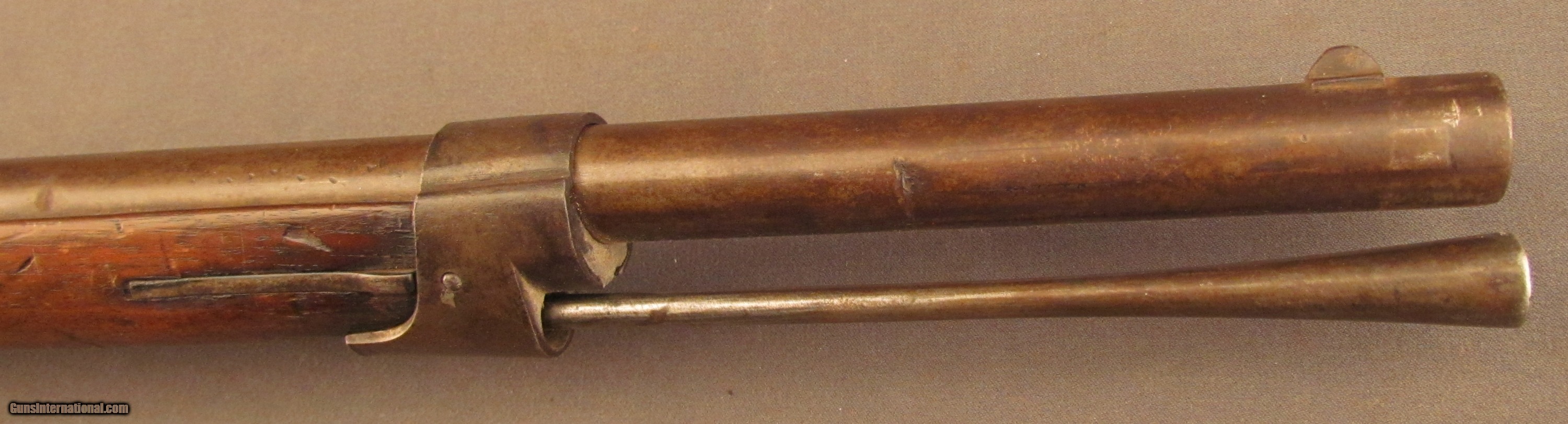 Description: NSN, approx. .61 Caliber, 32" barrel with a fair, lightly pitted bore. This is one of the Belgian-made rifles originally intended for Brazil that made their way to the US during the Civil War. The rifle was made in Liege, Belgium by the O.P. Drissen firm, and their “D (Anchor) C" maker's mark is present on the lockplate and stock furniture. The barrel (which has been bored out from the original rifled .58 to .61 smoothbore), barrel bands, and lock have an overall mottled plum-brown patina, while the brass trigger guard and buttplate have a mellow, ochre-yellow patina. The rear sight and bayonet bar were removed when the rifle was converted into a smoothbore fowler at some point in the past. The walnut stock has numerous handling marks and blemishes with chips missing from the edges of the ramrod channel, a series of with-the-grain cracks at the rear lock screw bolster, some further drying cracks at the butt, and a modern repair at the heel. Some indistinct letters or markings have been carved into the left side of the stock, and the outline for the American Eagle shield added when the guns were shipped to the USA is still visible on the top of the wrist. This is an interesting, and hard to find foreign percussion rifle, originally intended for Brazil, but diverted to America during the Civil War. Antique SOLD Antique: Yes Manufacturer: Brazil Model: Minie Caliber Info: .61 Cal Gauge Info: .61 Cal |
