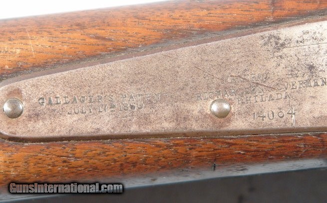 Description: CIVIL WAR GALLAGER OR GALLAGER’S U.S. PATENT .50 CAL. PERCUSSION CAVALRY CARBINE CIRCA 1863. 22 ¼” barrel with the original front and rear sights. Very good plus to fine example with all the original parts including all the screws in nice condition. Excellent lock markings with crisp “GALLAGER’S PATENT/JILY 17TH, 1860” stamp and “MANUFACTURED BY/RICHARDSON & OVERMAN/PHILADA”. Original grey metal patina and stock with all the original finish. Nice patchbox screws. Working order and fine bore. Famously used by four Ohio Volunteer Cavalry Regiments as well as units from Tennessee and West Virginia. SOLD Antique: Yes |