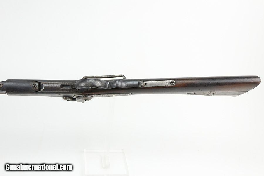 Description: This is a nice example of a Gallagher M1860 Carbine. The rifle's designer, Mahlon J. Gallagher of Savannah, Georgia, leased the pattern to Philadelphia gun makers, Richardson & Overman. The Gallagher carbine was issued to Federal cavalry during the Civil War. This one is fully functional and the action is smooth. There is a "D" proof on the barrel, a "P" proof on the receiver, and "W" proofs on the small parts. No visible marking on the stock. The gun has lost most of its original finish with brown patina, splotchy discoloration, and spotty oxidation throughout. There are some areas of minor pitting along the underside of the gun. Very nice stock with minor scratches here and there. The bore has strong rifling with pin-pricking throughout. SOLD Antique: Yes Rifle Caliber: .52 Manufacturer: Richardson & Overman Model: M1860 Carbine Condition: Nice Bore Condition: 7.5/10 Manufacture Date: Civil War |