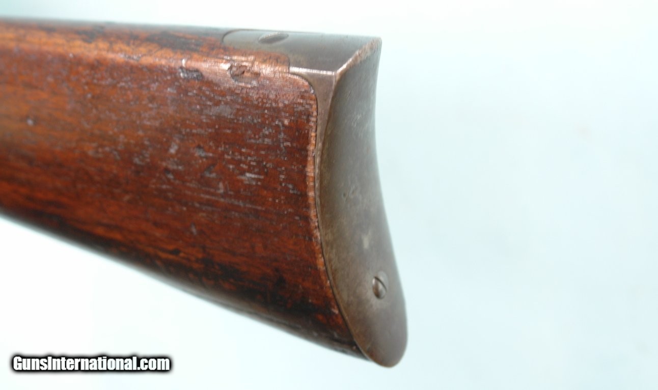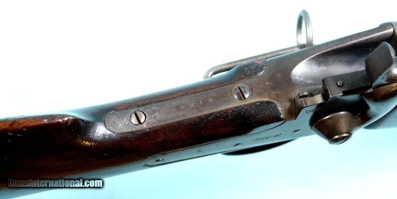 Description: 32319-CIVIL WAR / INDIAN WARS SHARPS U.S. MODEL 1859 CONVERSION .50-70 CAL. SADDLE RING CAVALRY CARBINE. All original with 22” barrel with original front and rear factory sights. Post-Civil War late 1860’s conversion to cartridge for re-issue for service in the Indian Wars. All matching very good to fine with nice blue mixed with patina. Stock and forend with the original finish. Nice “ESA” Ordnance Inspection cartouche on left butt stock. Toe of stock with old solid repairExcellent markings and patent dates on frame. Serial numbered in the Civil War Model 1859 original 61xxx range. Tight working order and excellent bore. $2900. SOLD Antique: Yes |