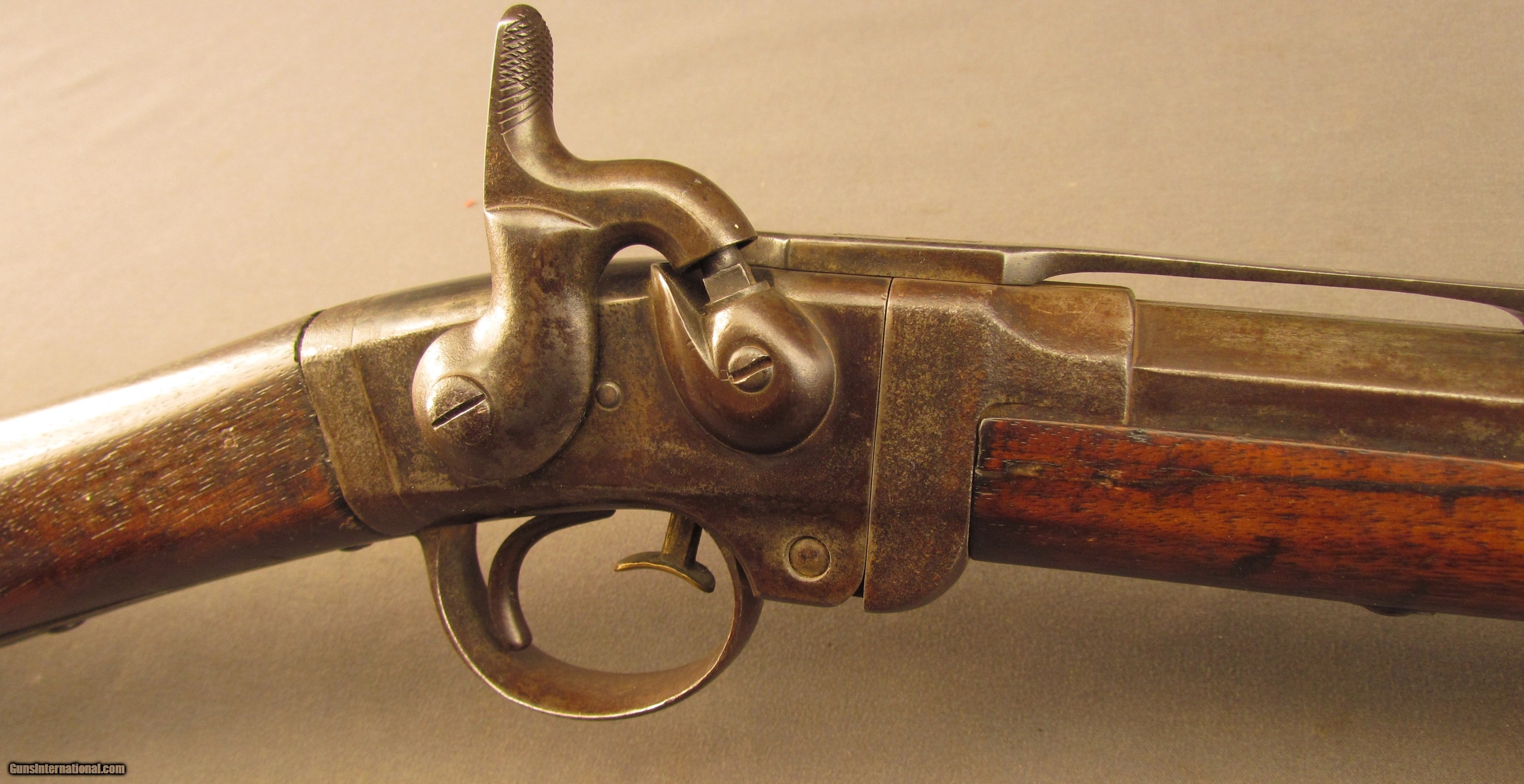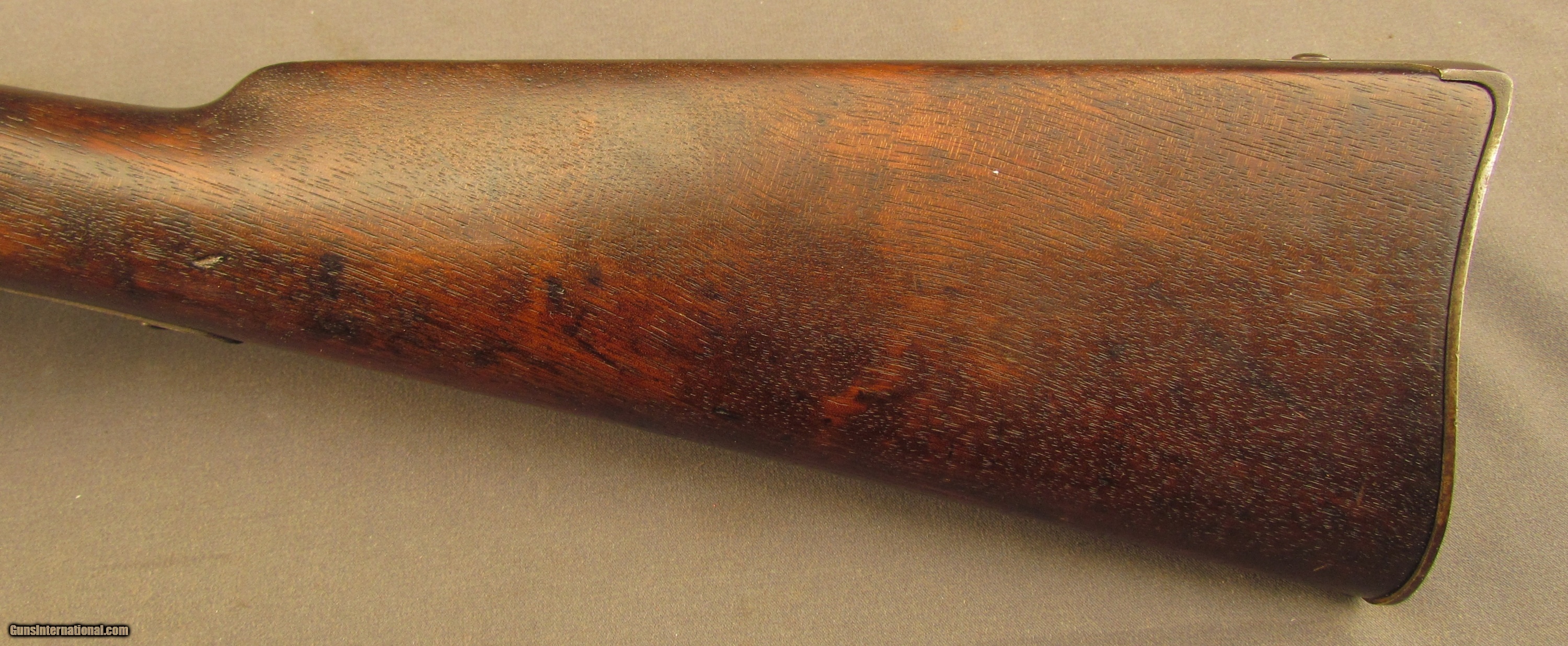 Description: Serial #7519, .50 Caliber, 21 1/2" barrel with a fine, bright bore that has some spots of that start about 4" from the muzzle. The barrel has a smooth plum-brown patina with thin streaks of gray and an old added blue along its length. The frame likewise has a dark brown overall patina mixing with gray and also has areas of pitting on the sides of both barrel breech and frame. There are a few traces of original bright blue remaining on the barrel lock spring and the brass opener has a pale yellow patina. The sling bar has been removed. The walnut stock and forend have a dark added finish with scattered small handling marks and blemishes throughout; heaviest on the forend which has a chip missing from the left side. The buttstock was repaired and has been sanded and re-oiled with a series of small letter stamps on the sides of the wrist: "BM" on the left; "B" on the right. The barrel lock-up has a slight wiggle and the mechanism is fully functional. This is a very good looking Smith and would make a nice representative example for a collection. Antique SOLD Antique: Yes Manufacturer: Smith Model: Carbine Serial Number: 7519 Caliber Info: .50 Cal Gauge Info: .50 Cal |