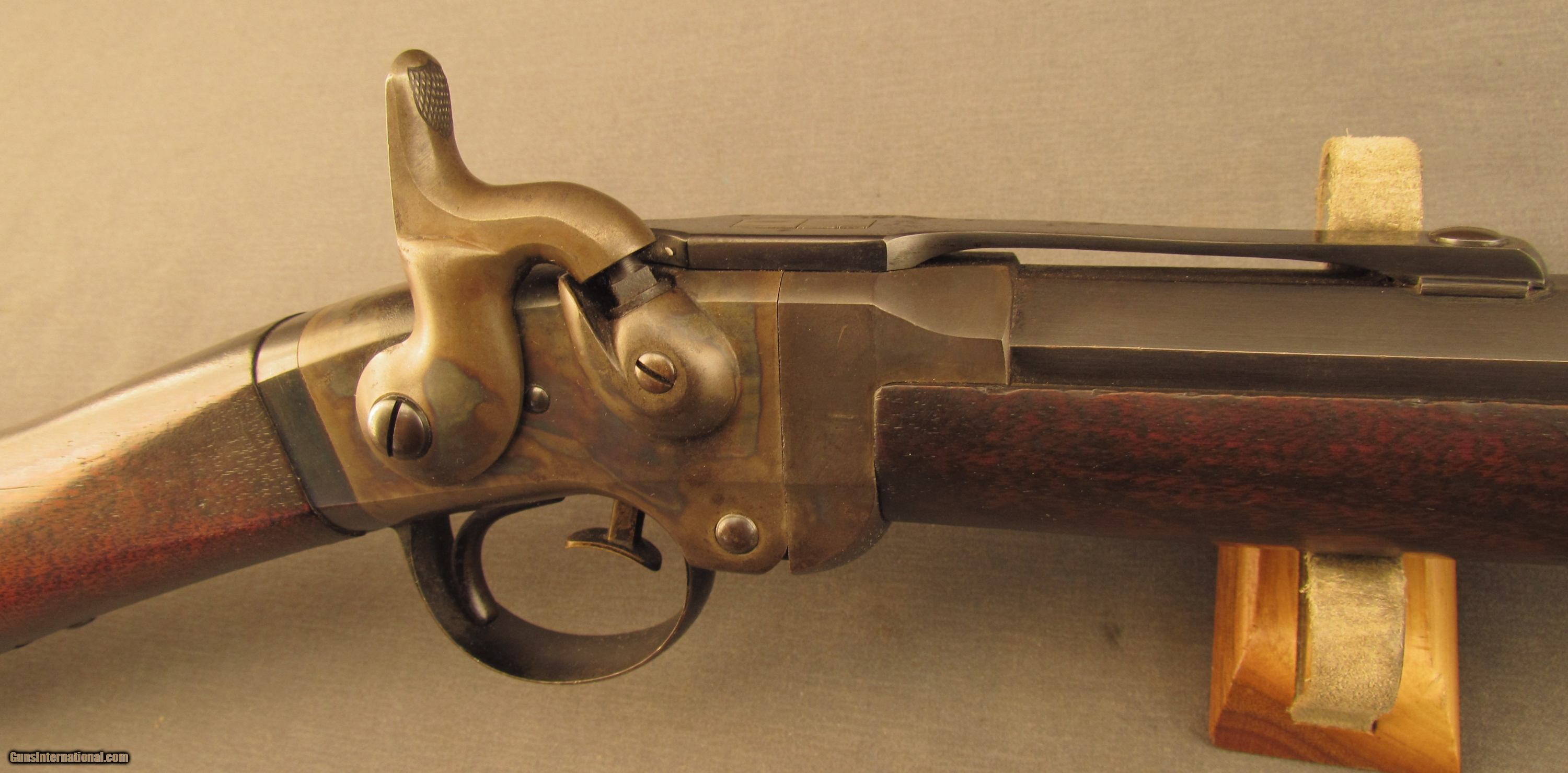 Description: Serial #8896, .50 Caliber, 21 1/2" barrel with an excellent, bright bore. The barrel has retained 95-97% of the original blue with mild plum-brown freckling and some fading at the muzzle. The frame likewise has a commensurate amount of the original bright color case-hardening with some very mild fading in spots and some scattered light freckling. About 50-60% of the original bright nitre blue remains on the barrel lock spring and the brass opener has a dark yellow-ochre patina. The walnut stock and forend have an old coating of protectant over the original military oil finish with scattered small handling marks that has left the inspector cartouche still crisp on the left side of the wrist. The barrel lock-up is still rock solid and the mechanism is tight and fully functional. This is a terrific looking Smith, in excellent condition, and would make a great example for a collection. Antique SOLD Antique: Yes Manufacturer: Smith Model: Carbine Serial Number: 8896 Caliber Info: .50 cal Gauge Info: .50 cal |