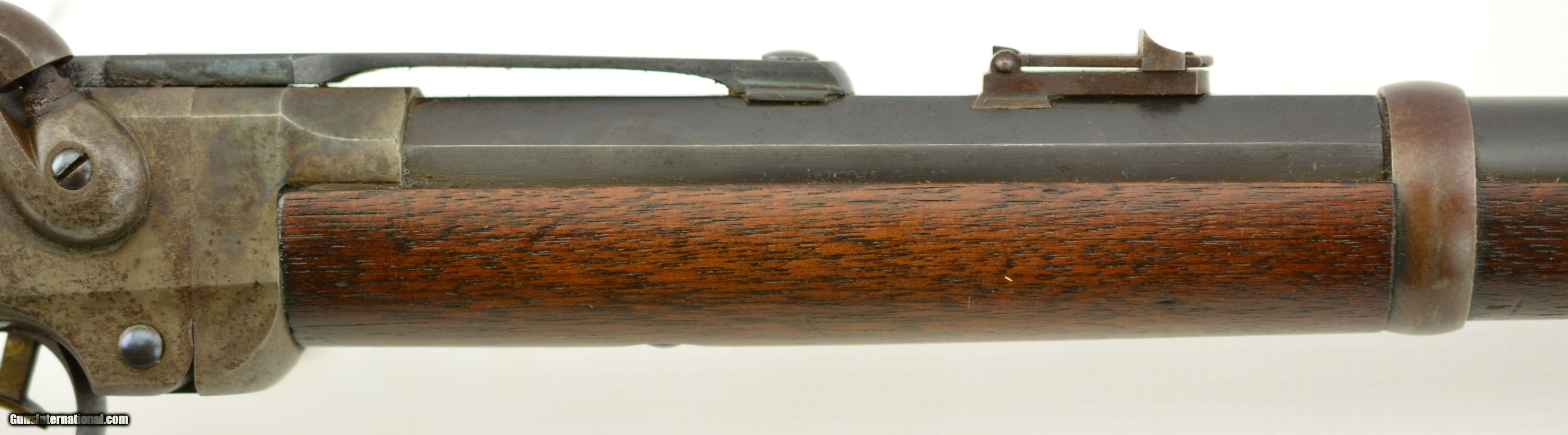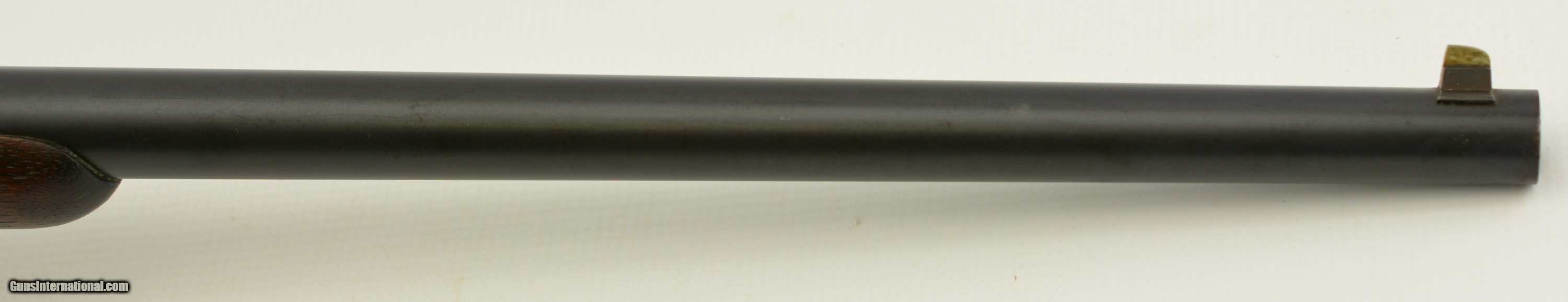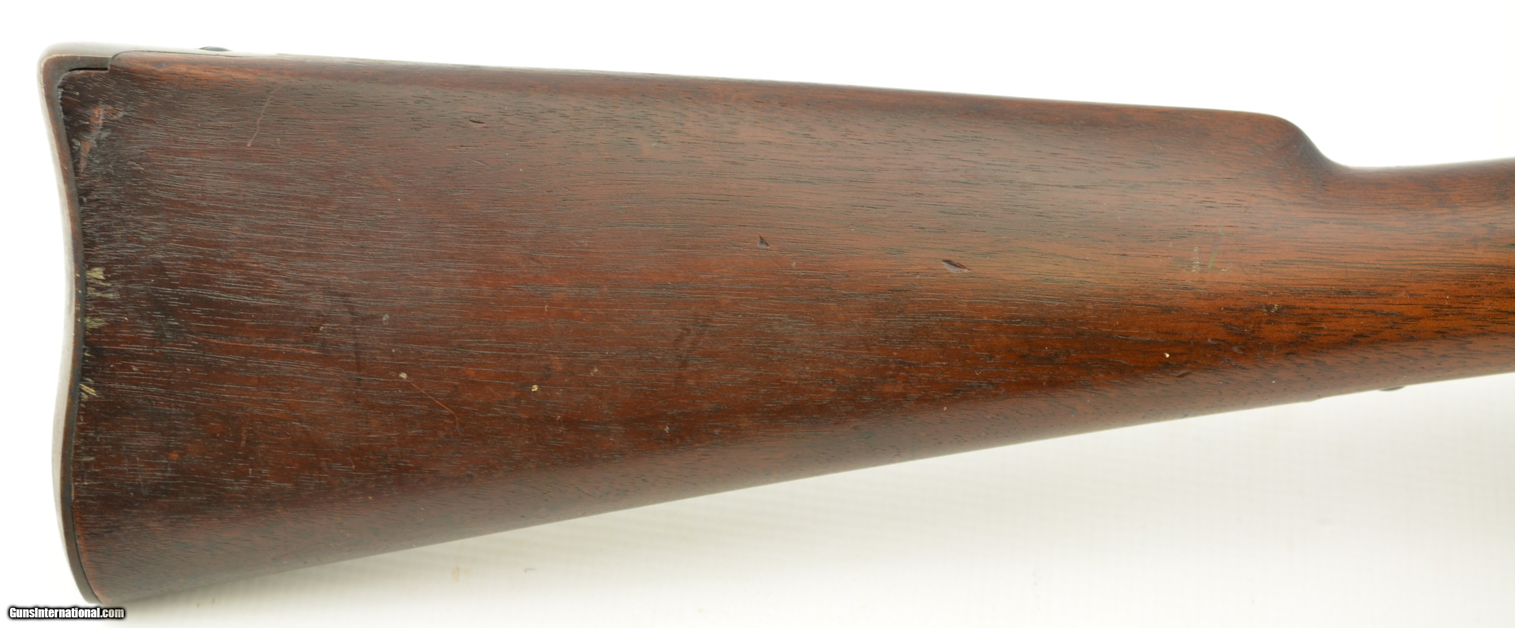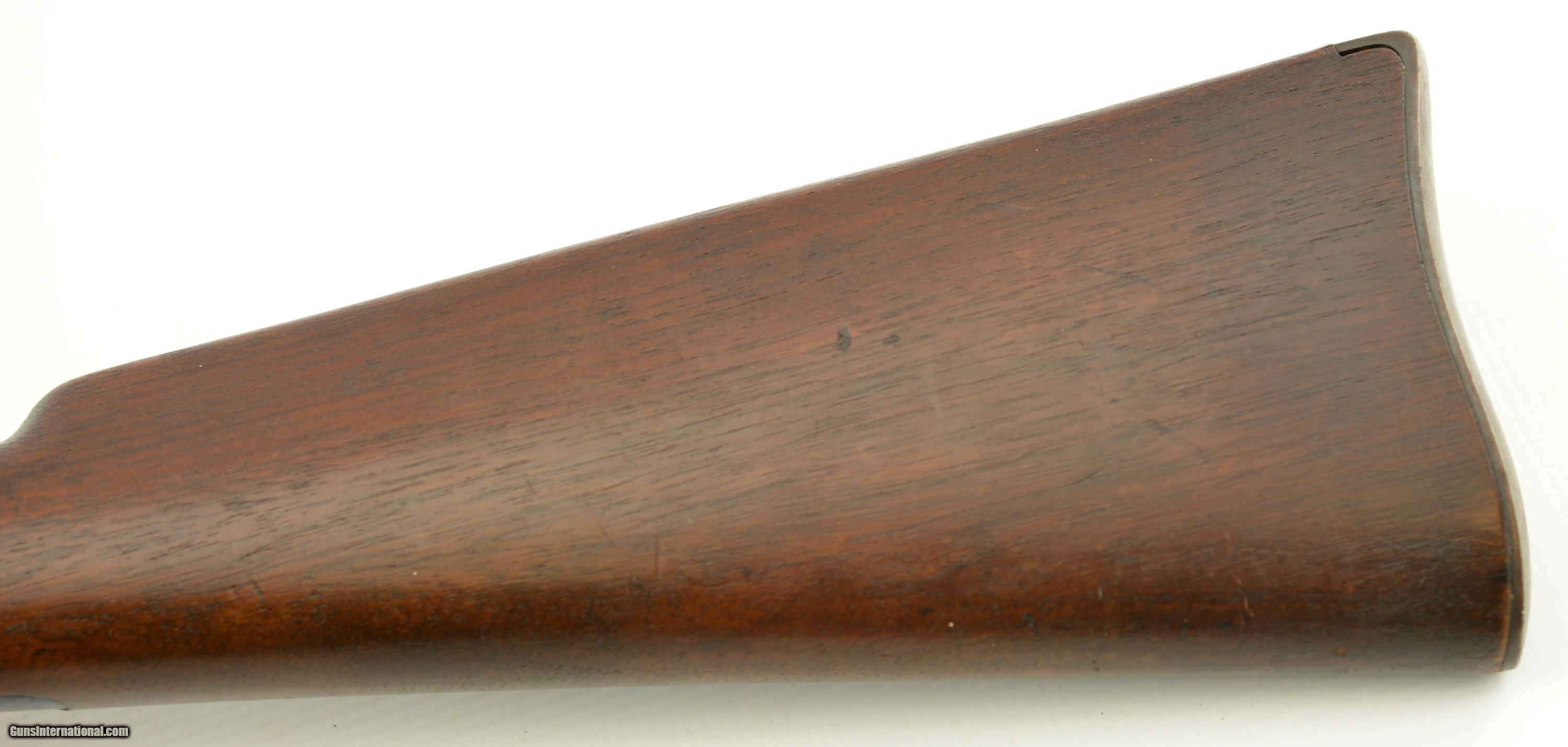 Description: Serial #9432, .50 Caliber, 21 1/2" barrel with an excellent, bright bore. The barrel has most of the original blue remaining that has started to blend with minute specks of plum-brown freckling with some very mild silvering at the muzzle and along the edges of the breech facets. The frame has 60-70% of the original bright color case-hardening remaining, and mottled gray-brown on the balance. The sling bar and ring are mostly a mottled gray-brown color, the barrel lock spring retains most of its original bright blue under thin freckling, and the brass opener has an ochre-yellow patina. The walnut stock and forend have an excellent added oil finish over non-sanded wood with scattered small handling marks and blemishes, as well as crisp inspector cartouches on the left side of the wrist. The barrel lock-up is rock solid and the mechanism is fully functional. This is a fantastic looking Smith and is in excellent condition overall. Antique SOLD Manufacturer: Smith Model: Carbine Serial Number: 9432 Caliber Info: .50 Cal Gauge Info: .50 Cal |