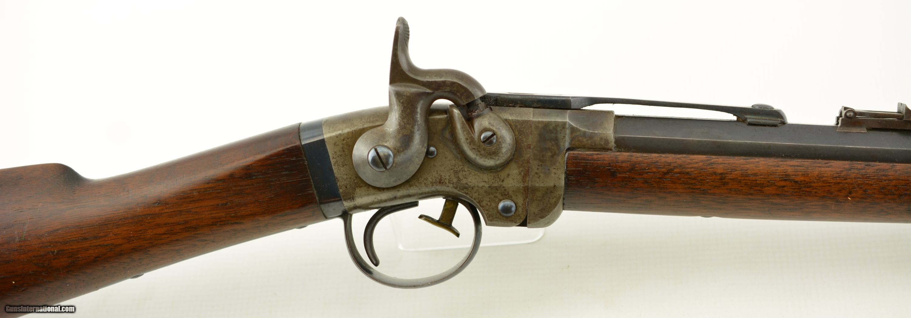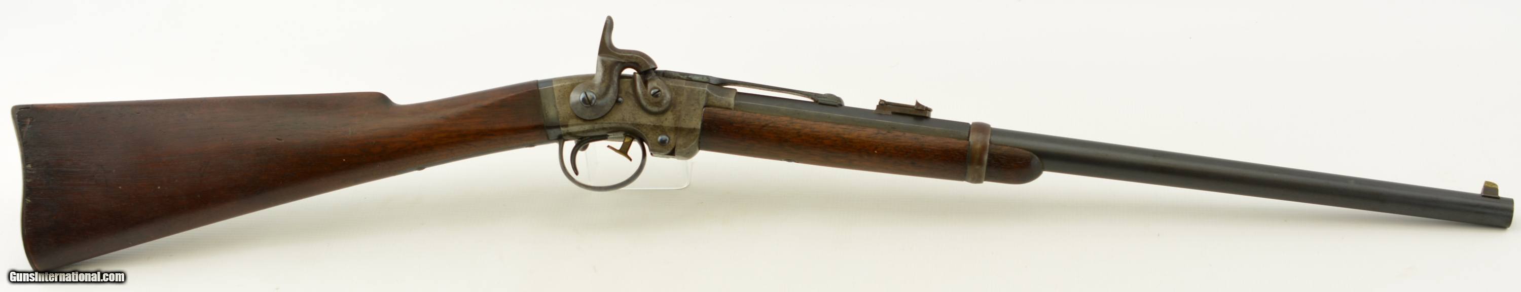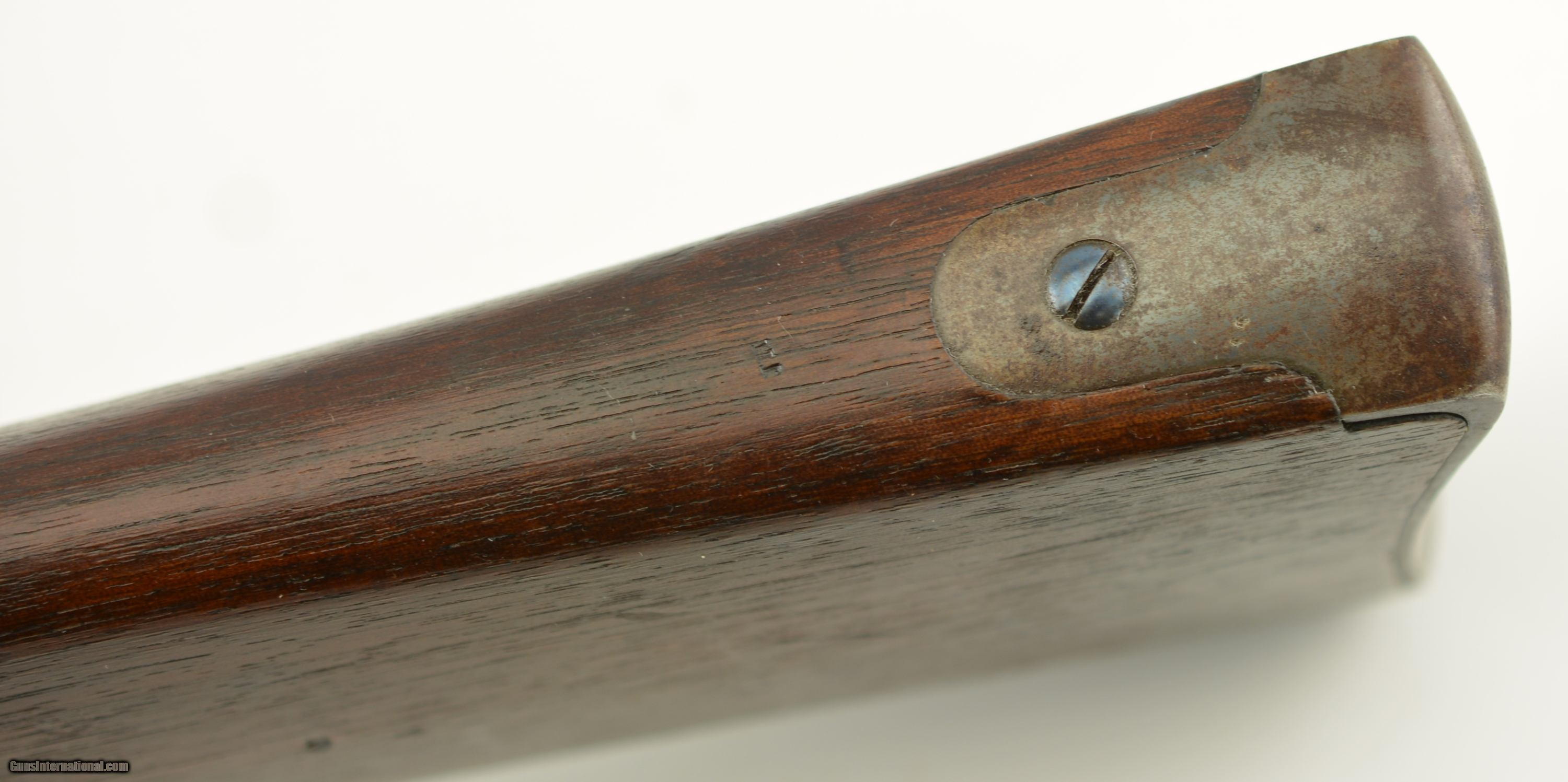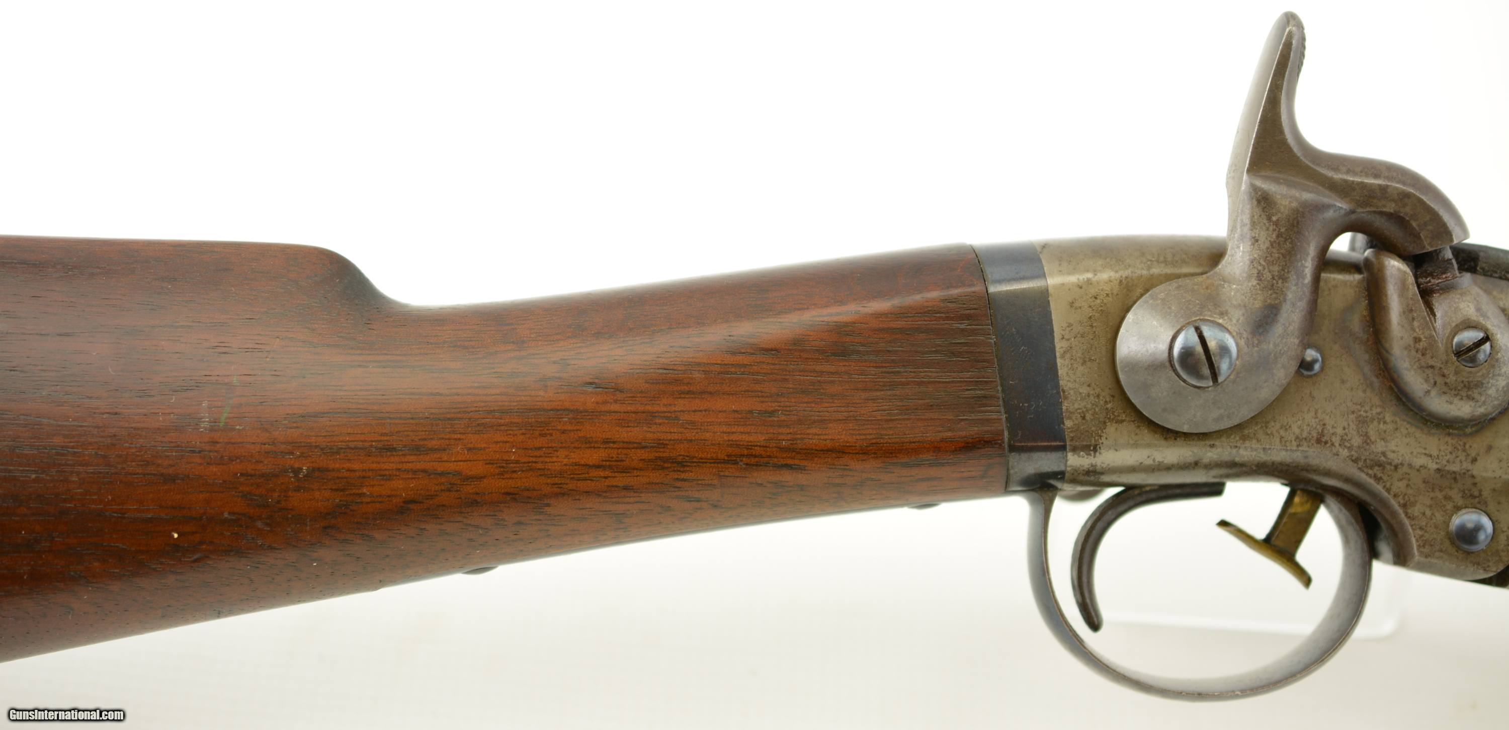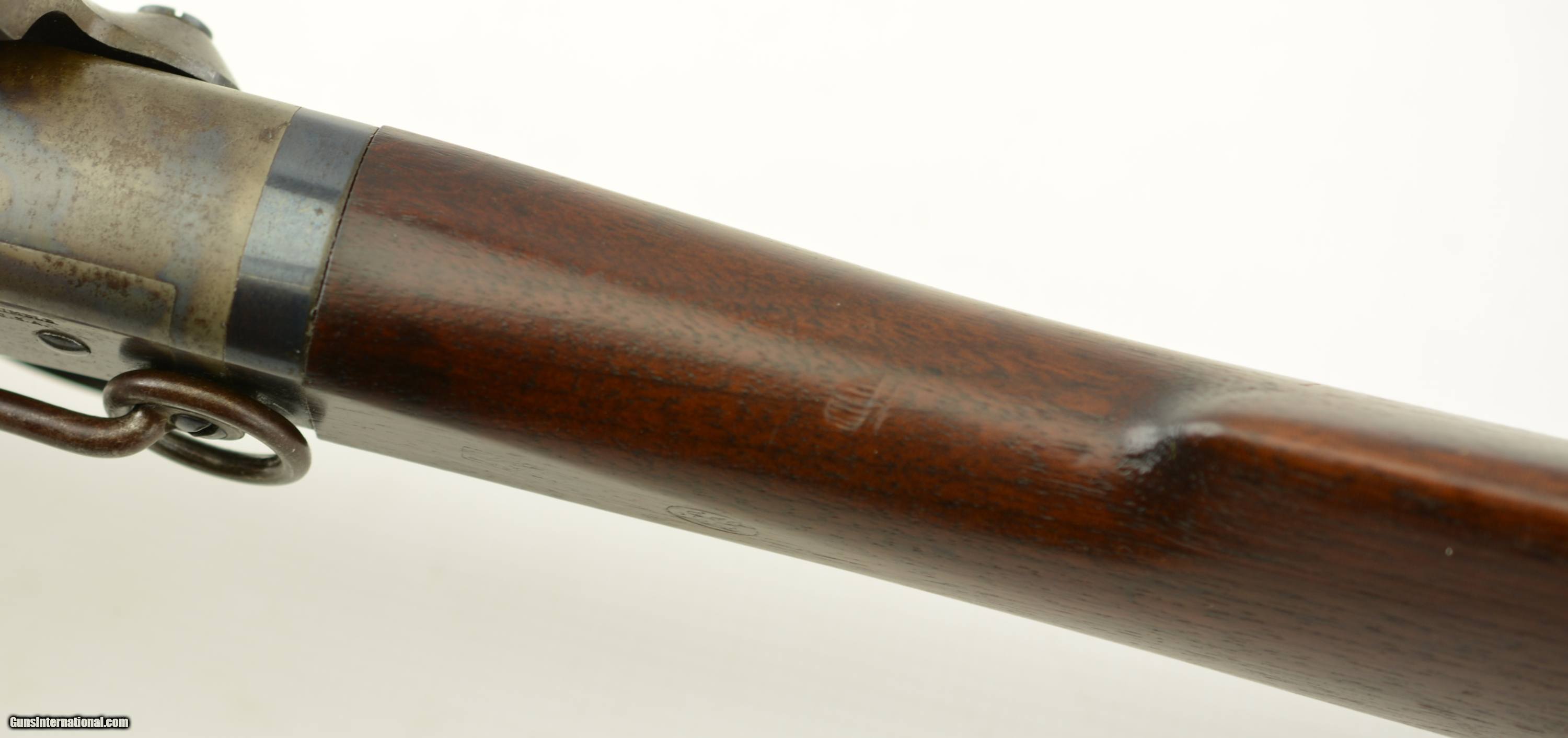 Description: Serial #9432, .50 Caliber, 21 1/2" barrel with an excellent, bright bore. The barrel has most of the original blue remaining that has started to blend with minute specks of plum-brown freckling with some very mild silvering at the muzzle and along the edges of the breech facets. The frame has 60-70% of the original bright color case-hardening remaining, and mottled gray-brown on the balance. The sling bar and ring are mostly a mottled gray-brown color, the barrel lock spring retains most of its original bright blue under thin freckling, and the brass opener has an ochre-yellow patina. The walnut stock and forend have an excellent added oil finish over non-sanded wood with scattered small handling marks and blemishes, as well as crisp inspector cartouches on the left side of the wrist. The barrel lock-up is rock solid and the mechanism is fully functional. This is a fantastic looking Smith and is in excellent condition overall. Antique SOLD Manufacturer: Smith Model: Carbine Serial Number: 9432 Caliber Info: .50 Cal Gauge Info: .50 Cal |