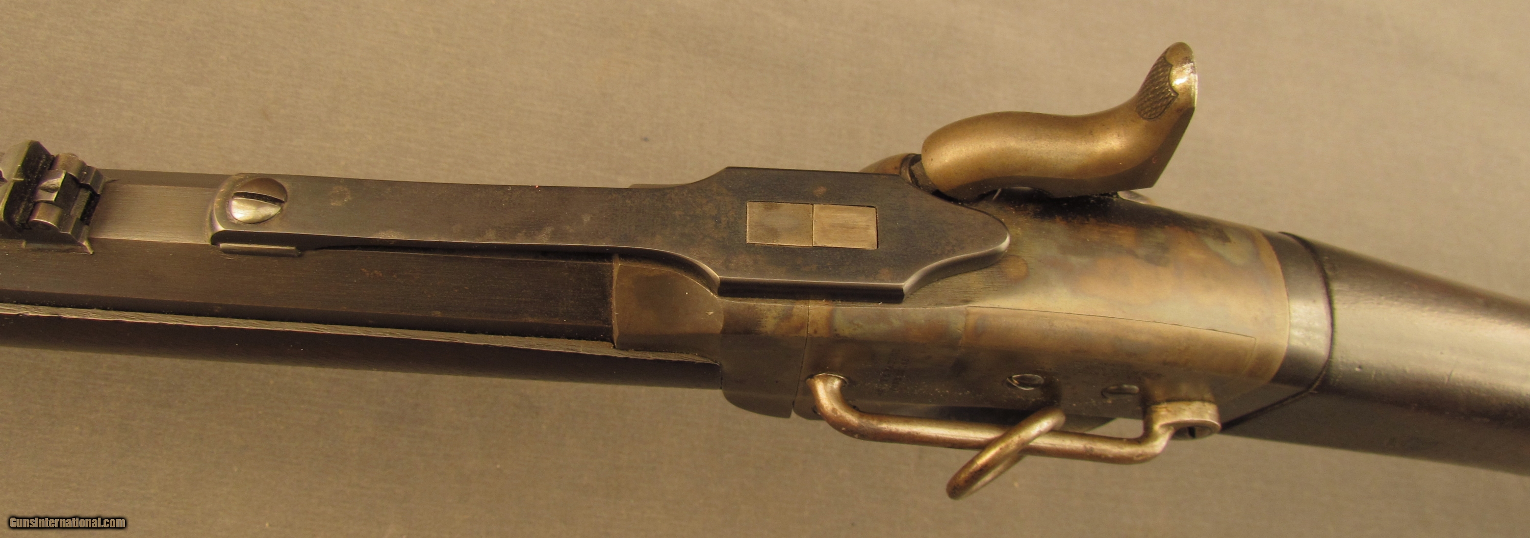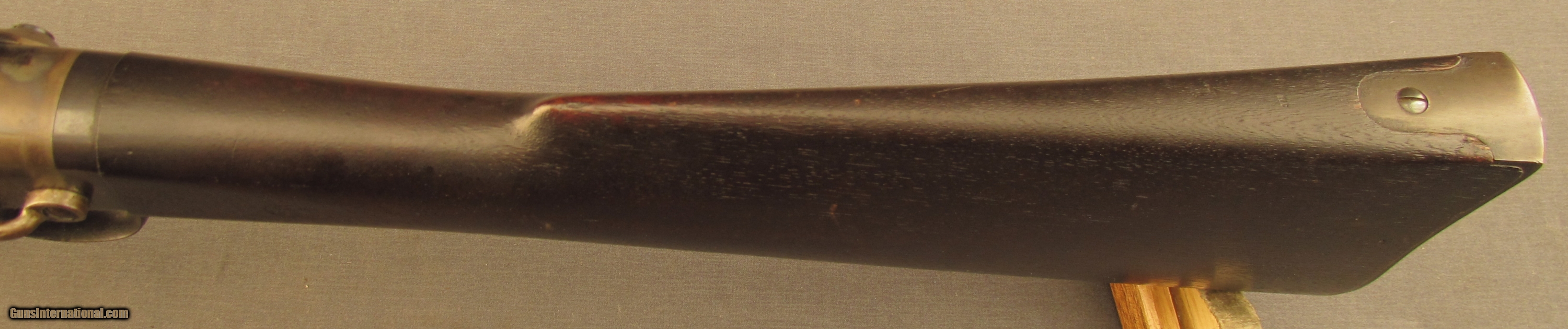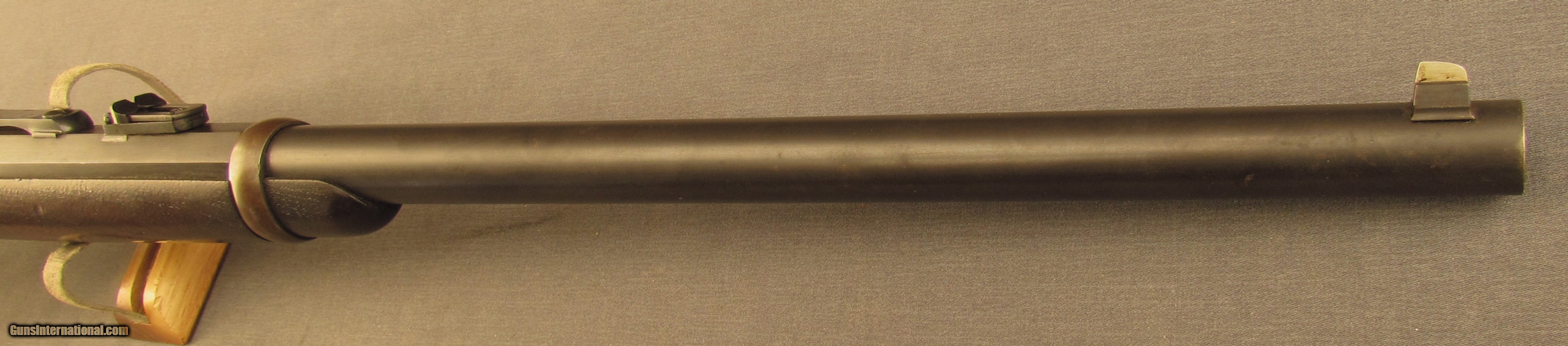 Description: Serial #8896, .50 Caliber, 21 1/2” barrel with an excellent, bright bore. The barrel has retained 95-97% of the original blue with mild plum-brown freckling and some fading at the muzzle. The frame likewise has a commensurate amount of the original bright color case-hardening with some very mild fading in spots and some scattered light freckling. About 50-60% of the original bright nitre blue remains on the barrel lock spring and the brass opener has a dark yellow-ochre patina. The walnut stock and forend have an old coating of protectant over the original military oil finish with scattered small handling marks that has left the inspector cartouche still crisp on the left side of the wrist. The barrel lock-up is still rock solid and the mechanism is tight and fully functional. This is a terrific looking Smith, in excellent condition, and would make a great example for a collection. Antique SOLD Antique: Yes Manufacturer: Smith Model: Carbine Serial Number: 8896 Caliber Info: .50 cal Gauge Info: .50 cal |