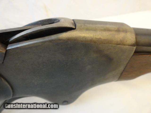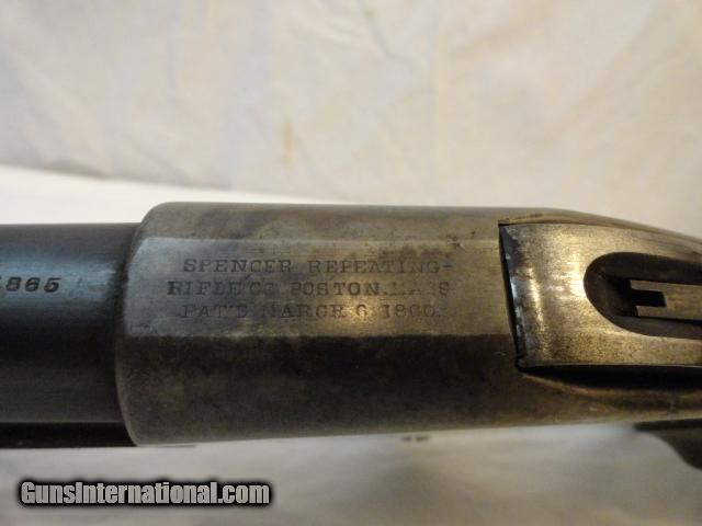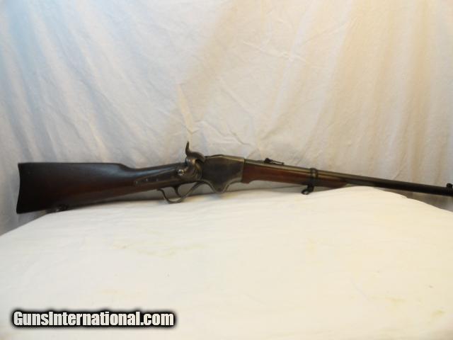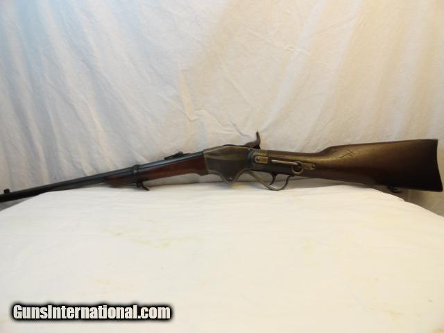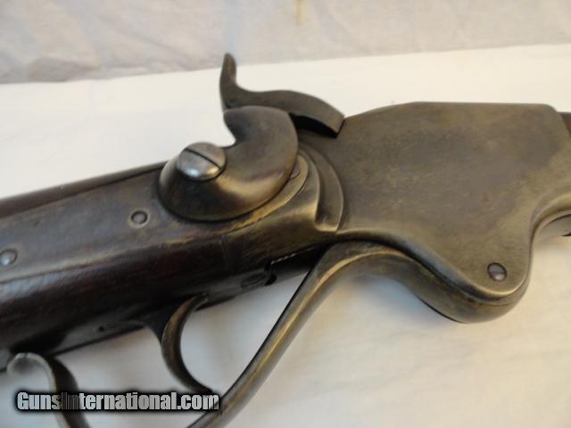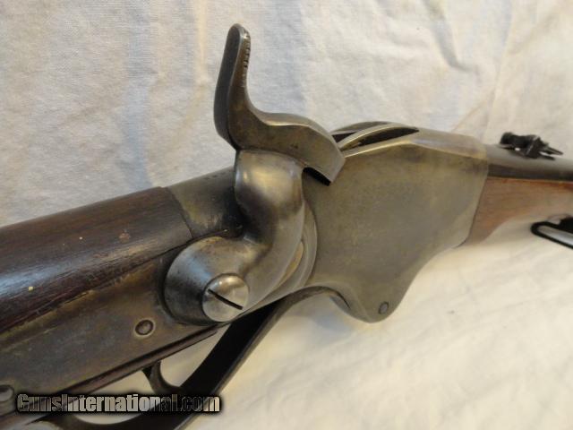 Description: 24,000 of these carbines were made with first shipments being delivers in April of 1865 at wars end. It featured a .50 inch bore, 20" barrel, factory sling swivels and a Stabler cut off. It has perfect DAP and EAW cartouches in the beautiful wood stock with no cracks or chips and never cleaned or sanded. Barrel retains almost 100% of the factory blue finish. The case colored receiver is basically patterened with some nice soft colors with brilliant colors on saddle ring attachment bar as well as the lever and the bottom tang, hammer and side plate. Bore is gem mint. All the screws have almost 100% of their original fire blue finish. At least half the brilliant colors remain on butt plate as well. This is a fairly early four digit serial number (5662) It does not look like it has ever seen any use. One of the finer examples extant. SOLD Antique: Yes |