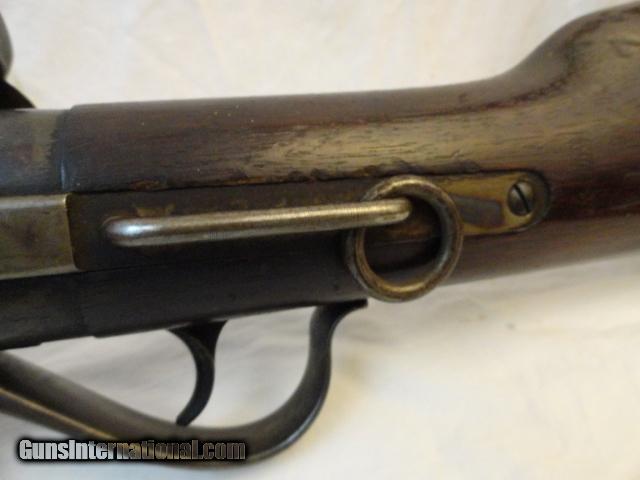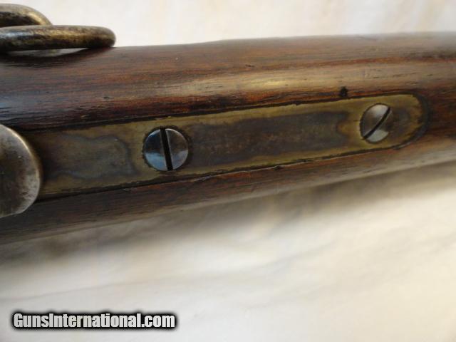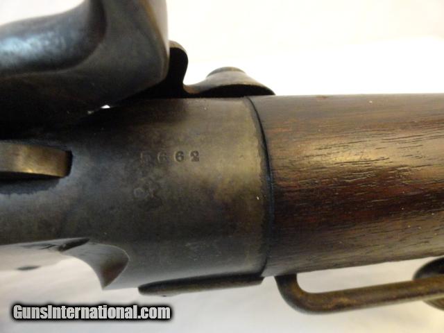 24,000 of these carbines were made with first shipments being delivers in April of 1865 at wars end. It featured a .50 inch bore, 20" barrel, factory sling swivels and a Stabler cut off. It has perfect DAP and EAW cartouches in the beautiful wood stock with no cracks or chips and never cleaned or sanded. Barrel retains almost 100% of the factory blue finish. The case colored receiver is basically patterened with some nice soft colors with brilliant colors on saddle ring attachment bar as well as the lever and the bottom tang, hammer and side plate. Bore is gem mint. All the screws have almost 100% of their original fire blue finish. At least half the brilliant colors remain on butt plate as well. This is a fairly early four digit serial number (5662) It does not look like it has ever seen any use. One of the finer examples extant.