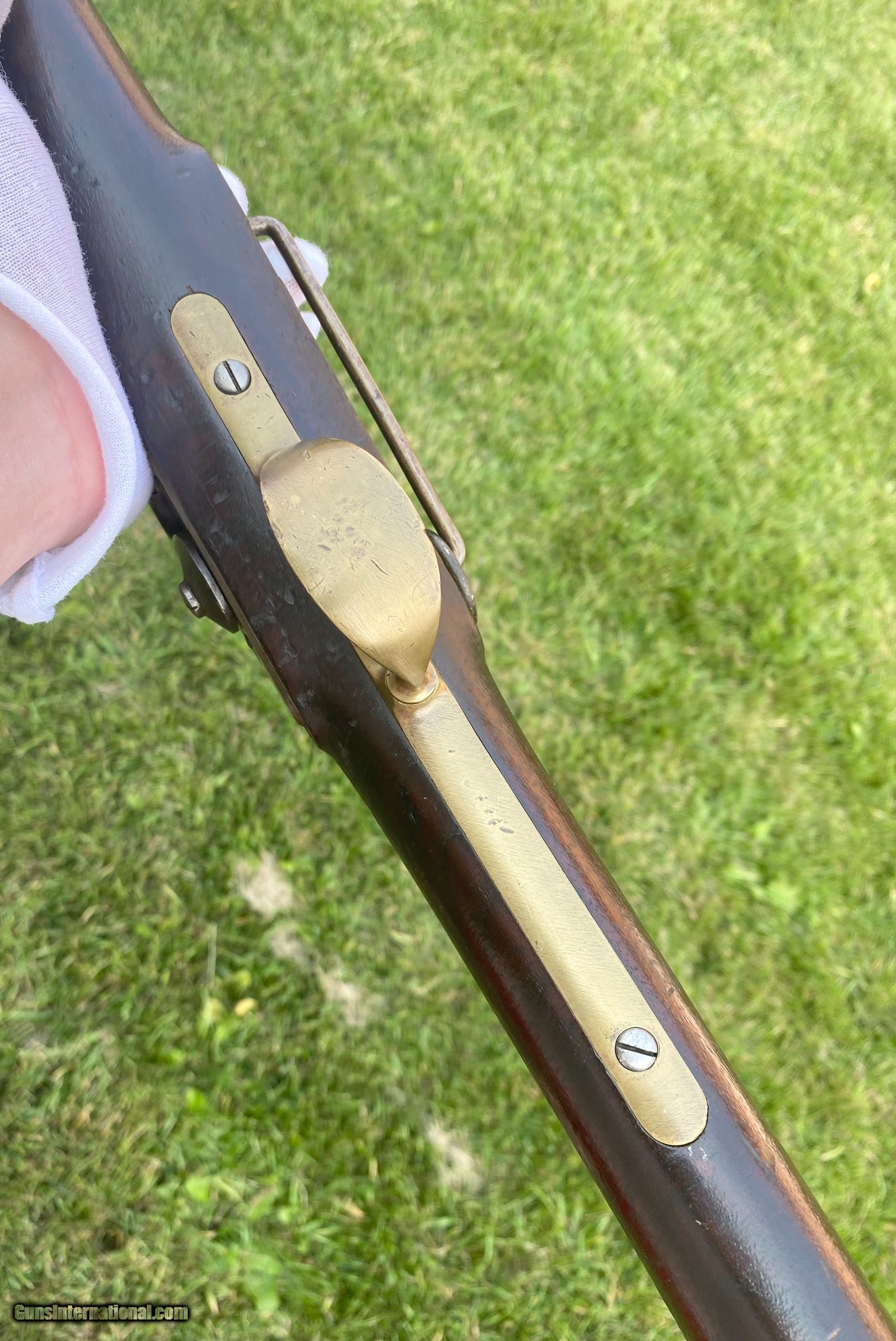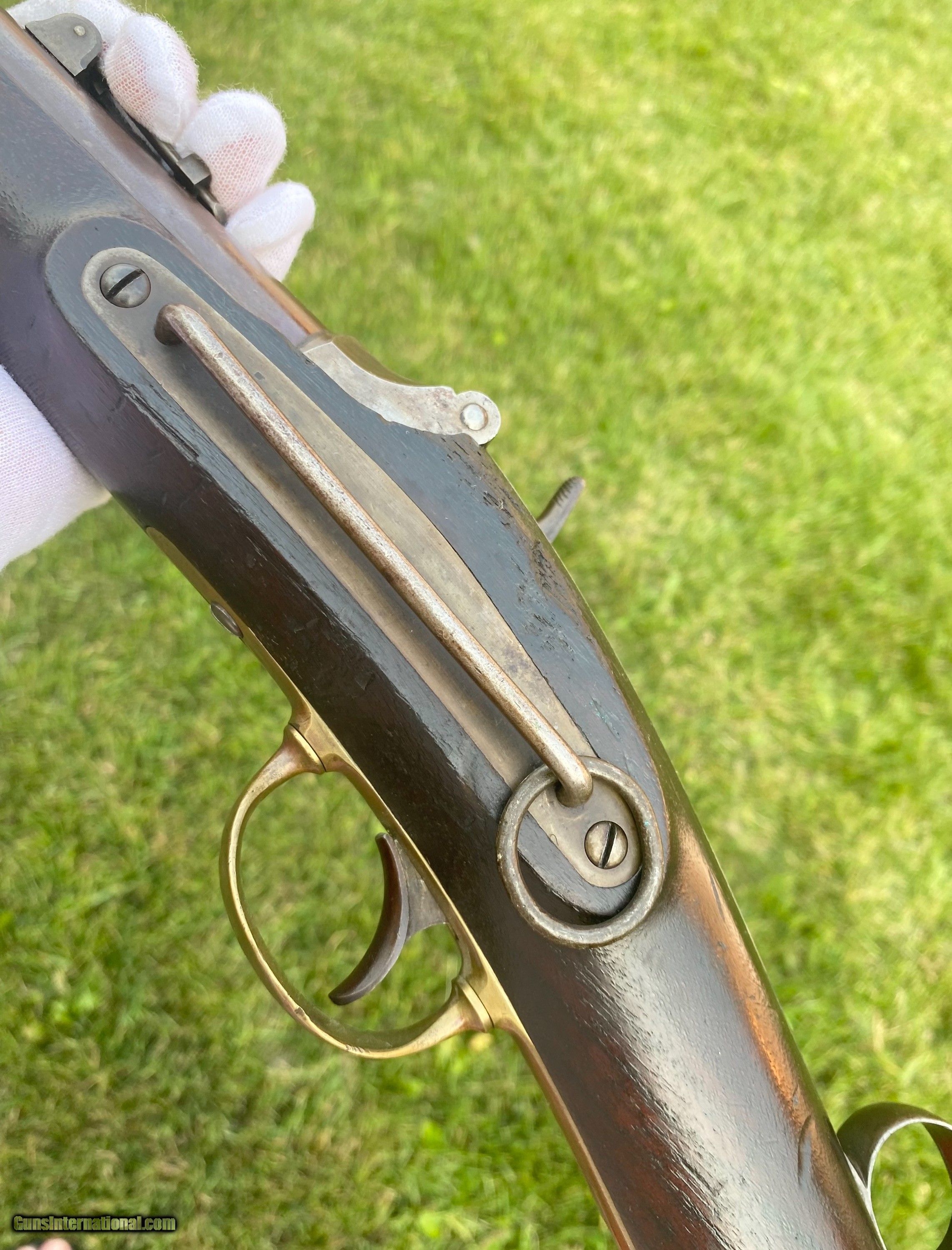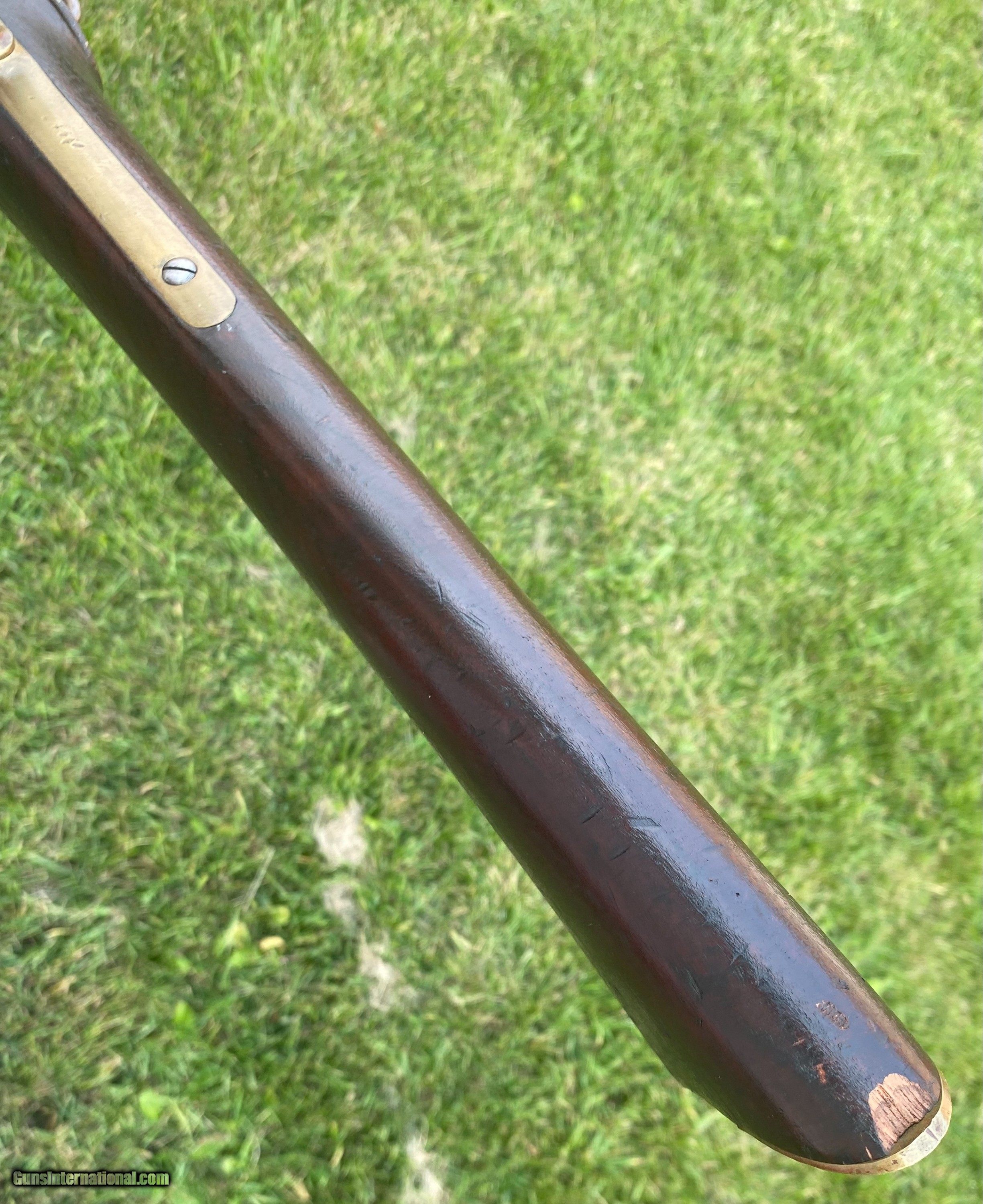 Description: This is an excellent example of the incredibly scarce Joslyn Monkey Tail Carbine. This example is better then most collectors will see. This example shows approximately 65-70% original brown on the barrel. The lock shows approximately 30-40% silvered out case colors and is marked properly “A.H. Waters & Co”. The monkey tail design exhibits approximately 60-70% of its original color case hardened finish. The stock is very good to fine overall showing feathering remaining and visible. There is a small chip out of the toe of the stock and a small chip out of the left top buttplate tang of the stock also. Mechanically appears to function as it should. Good bore overall. .54caliber. The brass shows a nice aged mustard patina appearance. Only approximately 1,500 of these were manufactured between 1855 and 1856 making this one of the scarcer carbine variations. Out of the few I’ve seen, this is certainly one of the finest! Shipping is $50 plus actual insurance. Insurance cost can be chosen by the buyer! Thanks! Asking $6,500.00 sale pending SOLD Antique: Yes |