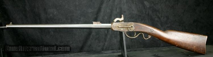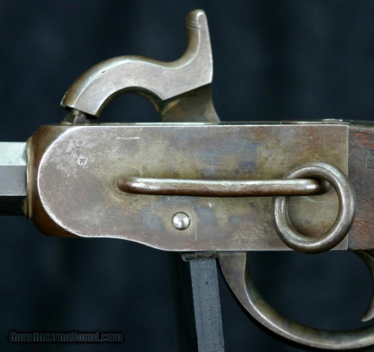 Description: .52 caliber, 20 inch barrel, excellent bright bore, 95% barrel blue with use dings, 80% case colors on frame and hammer starting to fade, excellent wood with use dings, original sights, excellent markings including inspector's cartouches, all numbers match, excellent in and out, circa 1864. SOLD Antique: Yes |