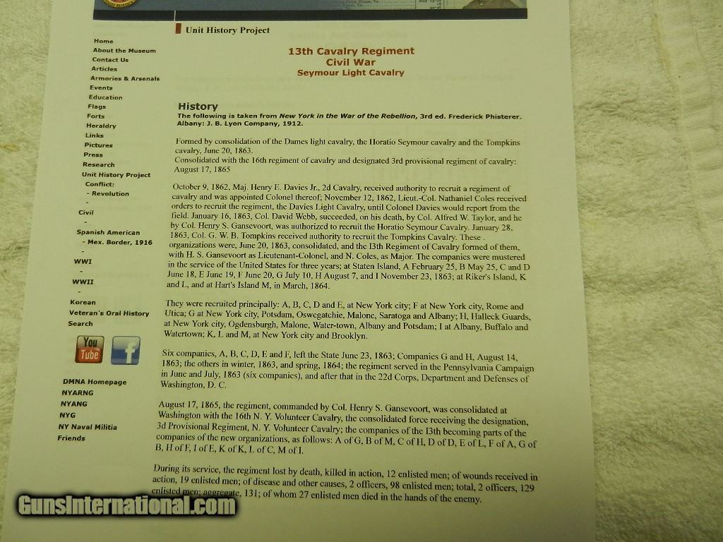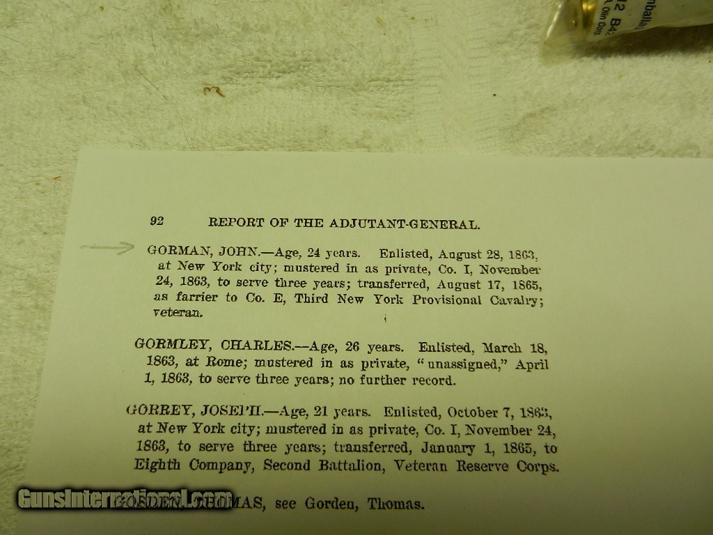 Description: Original 1863 Sharps SRC, .50/70, matching serial numbers, bright shiny bore, Lawrence sight, nice wood, tight action. This carbine was Issued to Pvt. John Gorman, Company "I", 13th New York Cavalry. Pvt. Gorman enlisted August 28th, 1863 for a 3 year term and survived the Civil War. The 13th New York served in Virginia and around Washington D.C. and often clashed with Confederate cavalry under the famous "Gray Ghost", Col. John Singleton Mosby. In fact,it was a soldier of the 13th New York that shot and wounded Col. Mosby on Dec. 21st, 1864. The wound was pronounced mortal but Mosby survived, and lived until 1916. Money order or cashier's check + $ 40 shipping. SOLD Antique: Yes Manufacturer: Sharps Rifle Co. Model: New Model 1863 Sharps SRC, .50/70 conversion. Serial Number: 92029 Caliber Info: .50/70 Bore: Nice Condition: Very good. Bore Condition: Bright & Shiny Action: Sharps falling block Triggers: single Sights: Original Lawrence |