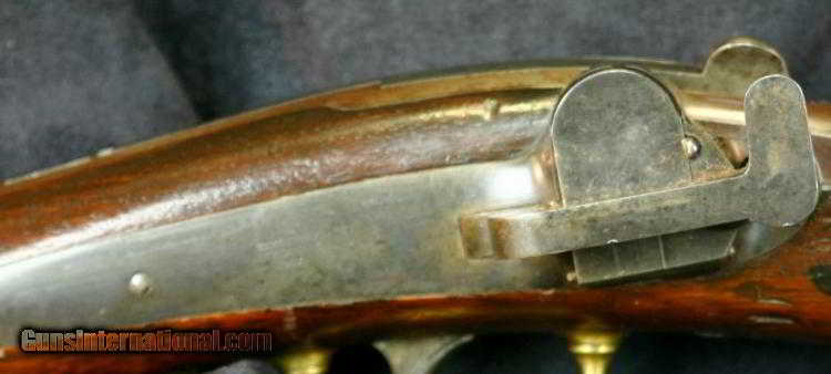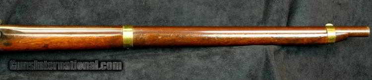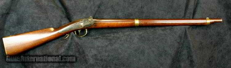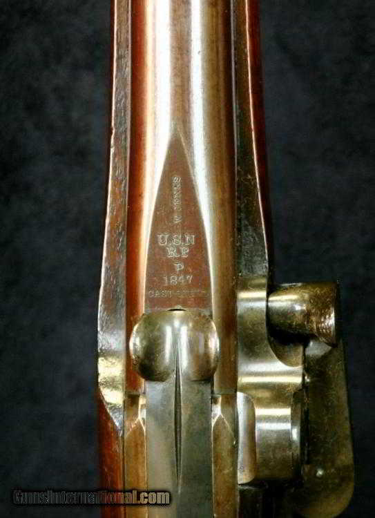 Description: .54 caliber, excellent bright bore, 98% original laquered brown finish on barrel, solid case colors on lock, tape primer and breech mechanism... brass mounts, stock has original finish with handling and storage dings, sharp cartouche, excellent markings, less than 1000 of these tape primed Jenks carbines were manufactured, all by E. Remington and Sons, an exceptional example of a U.S. Navy Civil War firearm. SOLD Antique: Yes |