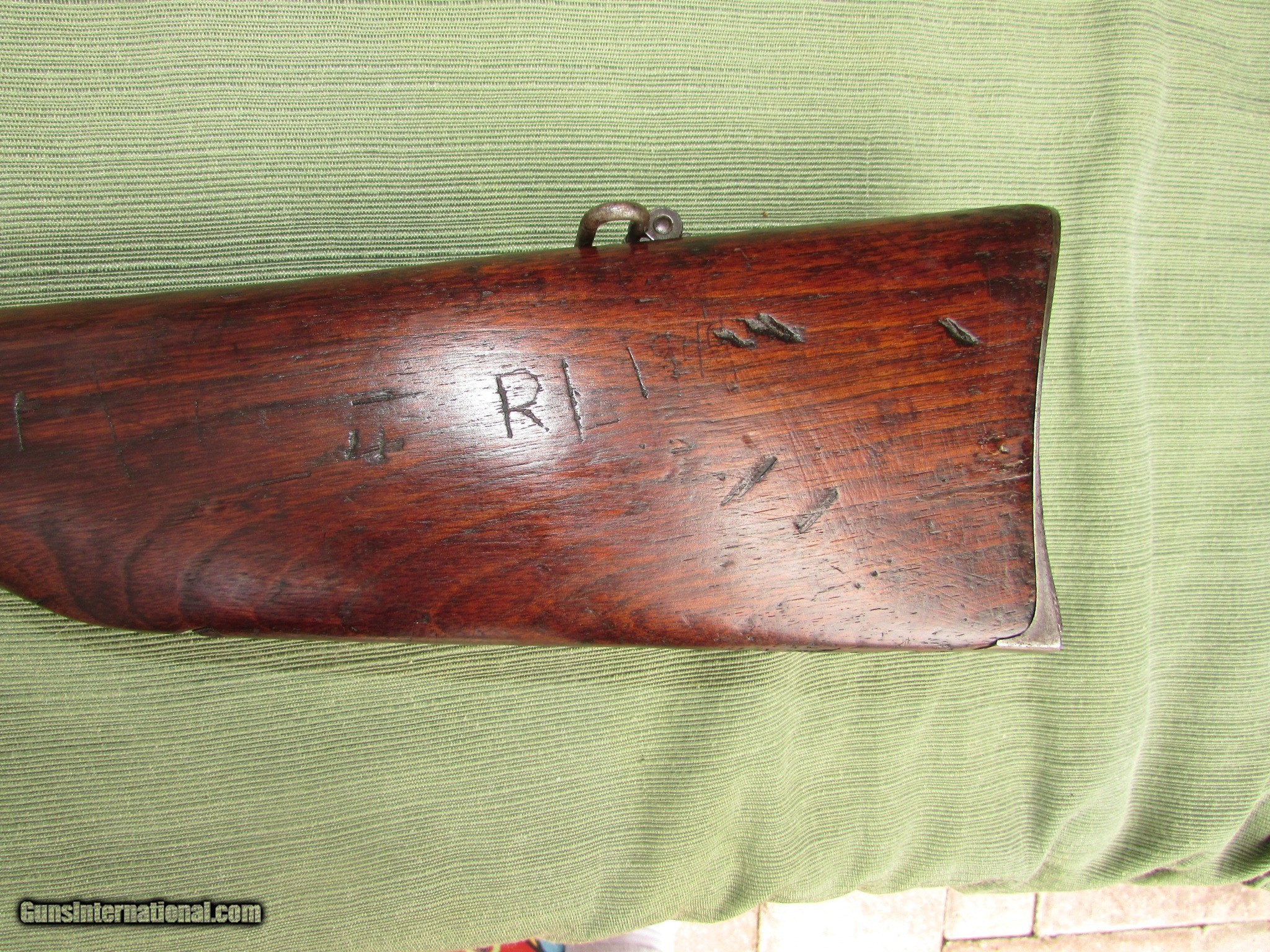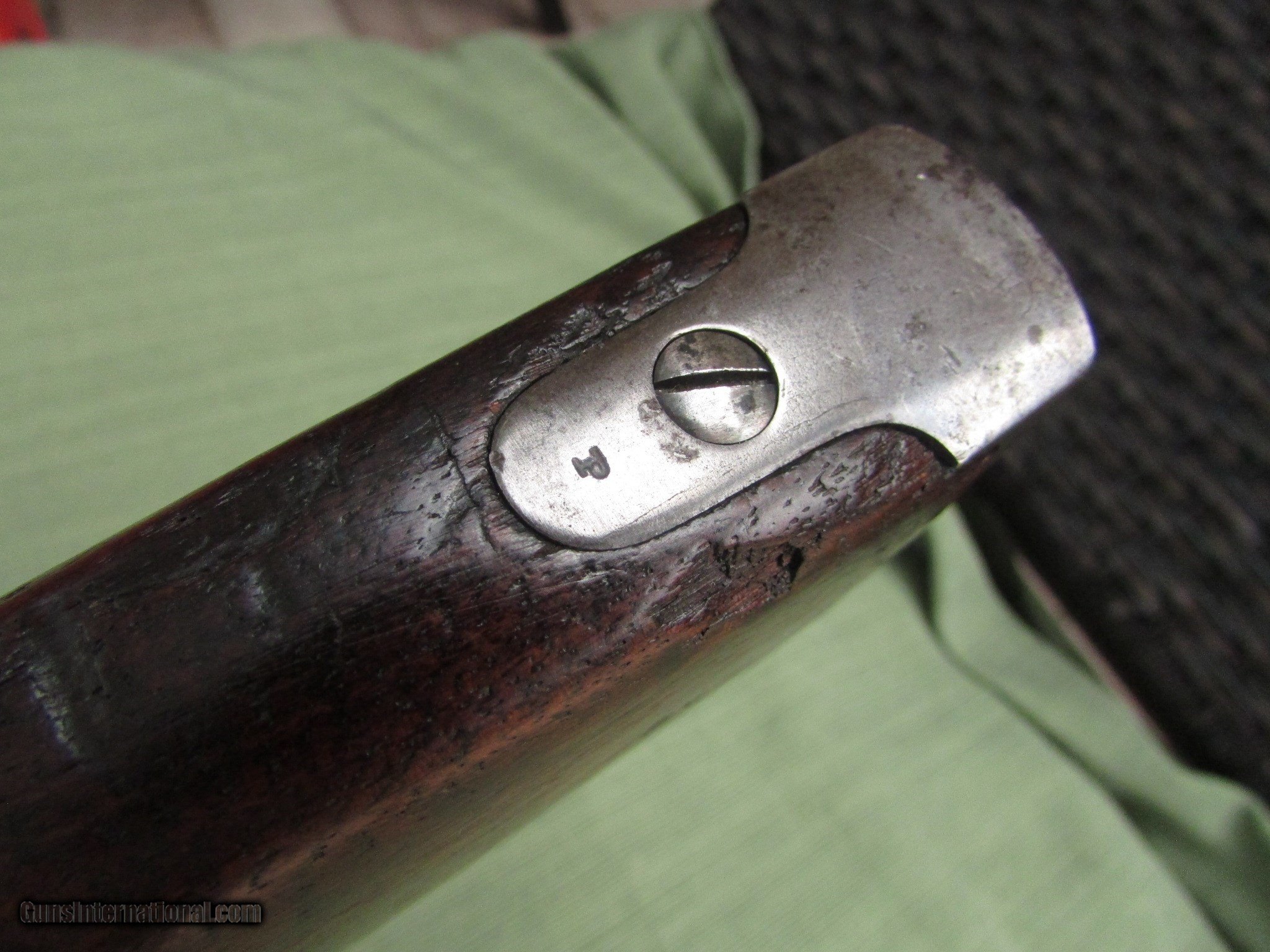 Description: Price reduced to $1995 to get her sold. M1860 Spencer Carbine Original Civil War issue 22" barrel Good bore. Tight action. The barrel ranges from brown to faded blue patina towar reciever and sight . The Spencer markings are abou 60% clear. Serial number is 40098 which I believe is 1863 production. Loading tube functions anf fits tight. Mechanically it all works fine and could be shot today, although I wouldn' do it.. There are various Inspector initials on the metal. No cartouches left. There are different initials scratched into the butt stock on each side with six notches under the handguard which probably mean six kills. Looks like something a Reb might have done, had he captured this gun. . But thats just conjecture. Stock shows a lot of use but is sturdy and no repairs. Fairly priced at $2195. Less than just about any other one on this sight. USA sales only. SOLD Antique: Yes Manufacturer: Spencer Model: SR Carbine Serial Number: 5-9 Caliber Info: 56 Metal Condition: Brown/blue mix Wood Condition: Good |