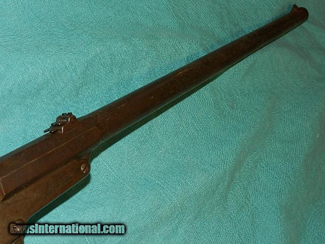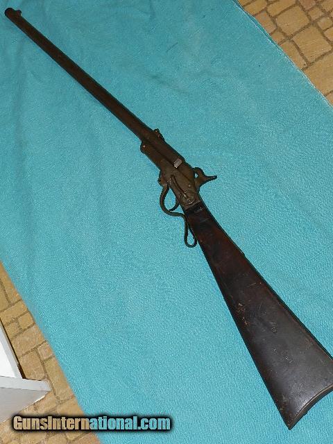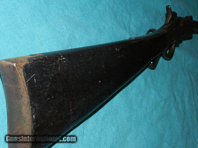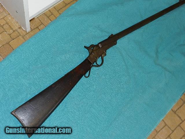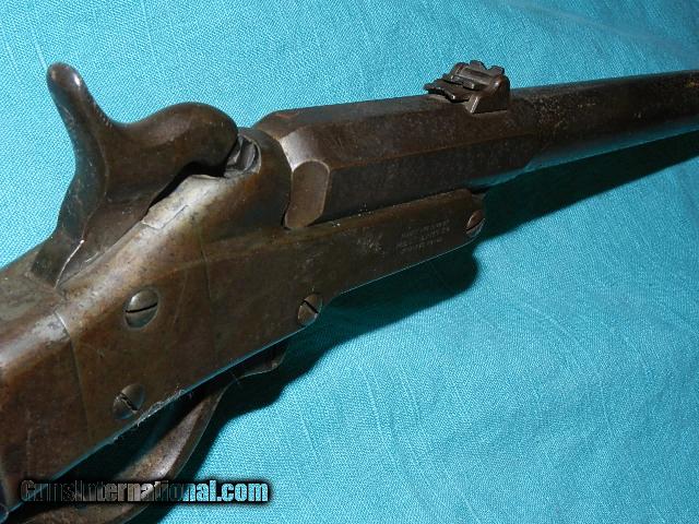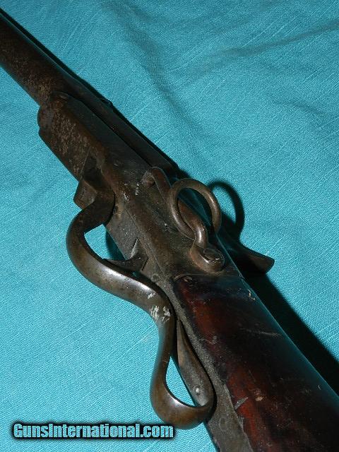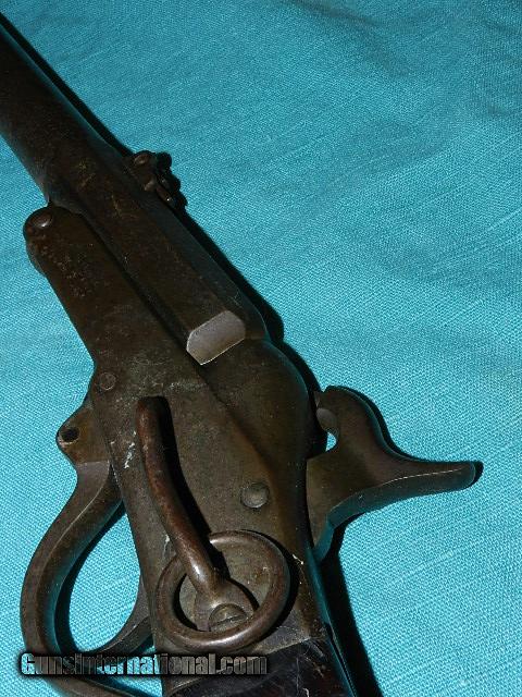 Description: An un touched Maynard 2nd model carbine.Bore has strong rifling with moderate pits nearr the breech but not a rust bucket! Metal is smooth grey with some raised frost, but not rusty. Came from a new England attic. Wood is good some field dings and the saddle bar has a dent long time ago.SN 7599.This is a good representative example of a Second Model Maynard carbine, (also known as the Model 1863), manufactured from 1863 to 1865, with approximately 20,000 total production. Three line "MASS. ARMS CO." address on the right front of the frame and four line "1851/1859" Maynard patent marking on the left side. 3 3/4 inches of the breech end of the barrel is octagon and the left side flat is marked with the inspectors mark "G.W.S.". The barrel is grey and the remaining parts casehardened faded to grey. It is equipped with a pinched blade dovetail front sight and a three leaf folding rear sight . Saddle ring and bar mounted on the left side of the receiver. The serial number is stamped on the lower tang. The stock is a straight grip with no forearm and the left side wrist is marked with one boxed cartouche "JM". Among the Union cavalry regiments armed with these Maynards were the 9th and 11th Indiana and the 11th Tennessee. SOLD Antique: Yes |