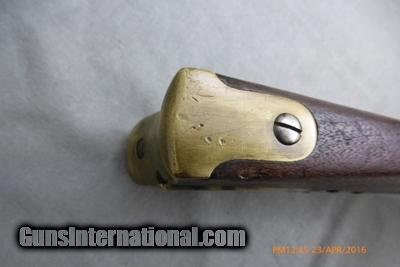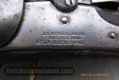 Description: Merrill Carbines 16-28 Condition: Metal pretty much very clean, a little minor corrosion at breach end of barrel, lock is very clean, markings sharp, brass furniture clean and not dinged. Study has normal dings, scratches initials, “JWB, CH. Co. A.” carved in stick. Maybe identifiable-authentic marking serial # 7488. $1,800.00 Merrill Carbine “Made by H. Merrill, Baltimore. Total quantity about 14,495. 54 caliber, percussion, breechloader. Single shot, loaded by lifting up, and pulling back of the breech lever. 22-1/8” round barrel, with one barrel band. Brass mountings; finished bright. Iron parts blued, or maybe finished bright; excepting the casehardened lock, breech, and breech lever. Walnut stock. Sling ring mounted on left side of the stock, opposite the lock. Serial numbered from 1 to up, Breech lever marked: J.H. Merrill Balto. /Pat. July 1858.Merrills were known issued to the following union cavalry regimens: N.Y. 1st, 5th, 18th; Penna. 11th, 17th, 18th; N.J. 1st Indiana 7th; Wisc. 1st, 3rd; ky.27th; Del. 1st. marked on lockplate forward of hammer: J.H. Merrill Balto./Pat.July 1858/Apl. 9 May 21-28-61, and (rear of hammer) the serial number. Stock fitted with brass patchbox, and the forend tip has sharply tapered contour. Breech lever is secured by latch of flat, knurled type. (16-28) $1,800.00 I take Visa/MasterCard, add 3%. Allow two weeks for all checks, whether bank, personal or certified to clear. It is also possible to wire funds to my account for instant credit for a $20.00 wire charge. 3 day- no questions asked return period for refund of price paid for gun. (Not including shipping or credit card charges.) All sales subject to prior sale at other sites or from shop. Call or email with any questions or for more pictures. Guns are antique and should not be fired without examination by gunsmith. $50 shipping for long guns, $30 for hand guns to lower 48 states, about $50-$75 to most European countries and $70-$80 to Australia for antique handguns, carbines $75-$125. We can generally get insurance if you want through shipper but coverage is very limited. Notify me if you want it. You can send 20% down- balance in 90 days for installment payment plan. No refunds on installment plans. I have shipped to Norway (long gun w/fragile stock) see feedback, England (Winchester1876, Rem. Dbl. Derr.), Northern Ireland, Austria, France, Netherlands, Holland, Australia, and Sweden. Email if you are not U.S. for estimated shipping costs, payment methods, etc. I am always buying and trading for antique and collectible guns, Indian items, rare ammo, etc. Email what you have got for sale or trade. SOLD Antique: Yes Serial Number: 7488 |