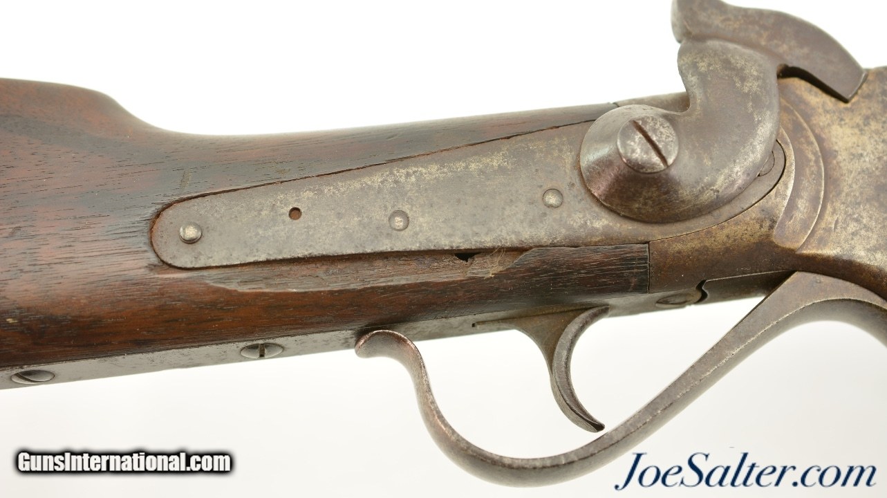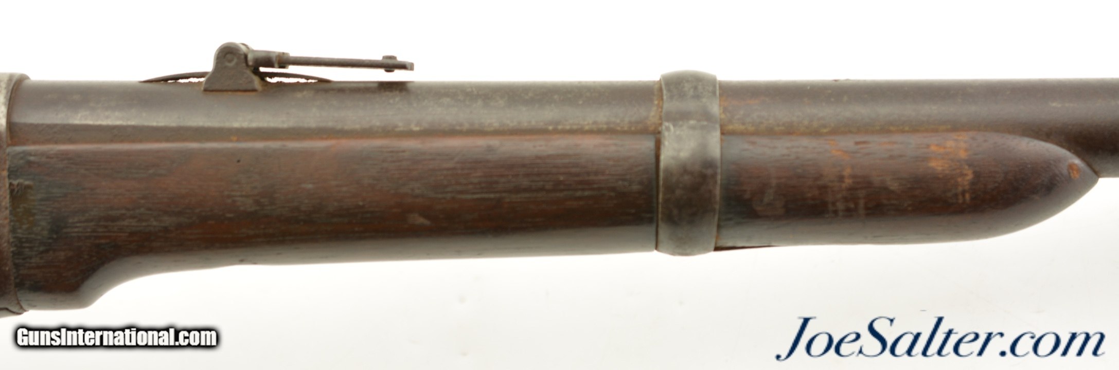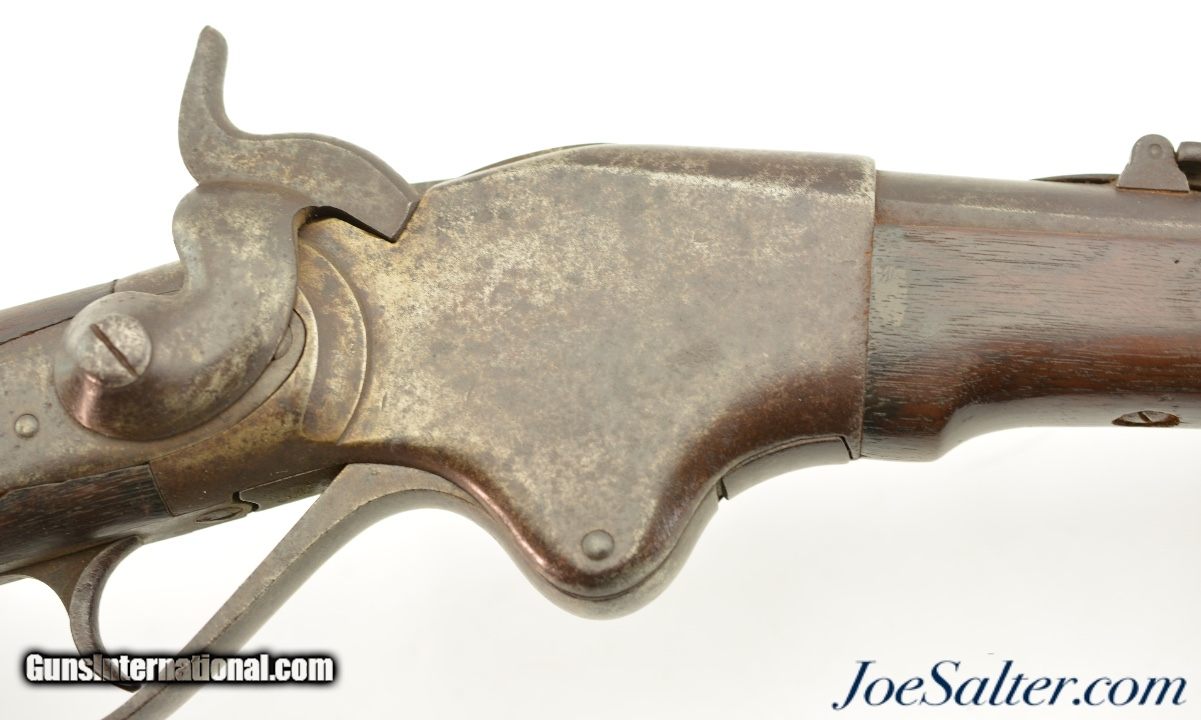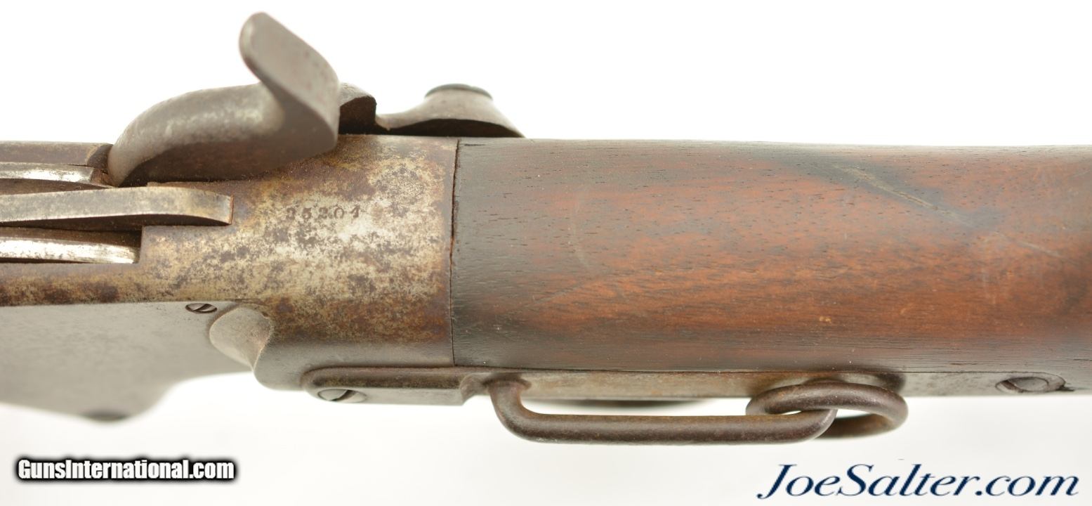 Description: Serial #25204, .56-56 Spencer RF, 22" barrel with a fair bore that has dark spots of pitting along its length. This is a good looking carbine that has matching numbers on the frame and barrel. The barrel itself has an overall dark brown patina with areas of mild pinprick pitting along its length, and a more mottled gray-brown appearance on portions of the receiver. The markings on the metal are slightly obscured, but still legible. The walnut forend has a thick added varnish over numerous small handling marks and blemishes. The buttstock has less obvious wear marks, but is missing a linear chip along the bottom edge of the lockplate. No inspector cartouches are present, and there is some mild surface oxidation on the ring, bar, and plate on the left side of the wrist. The action is fully functional, and a single, functional tubular magazine is included. This is a handsome Civil War Spencer, and rates good overall. Antique; SOLD Antique: Yes |