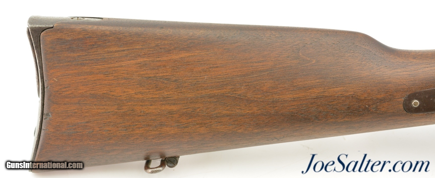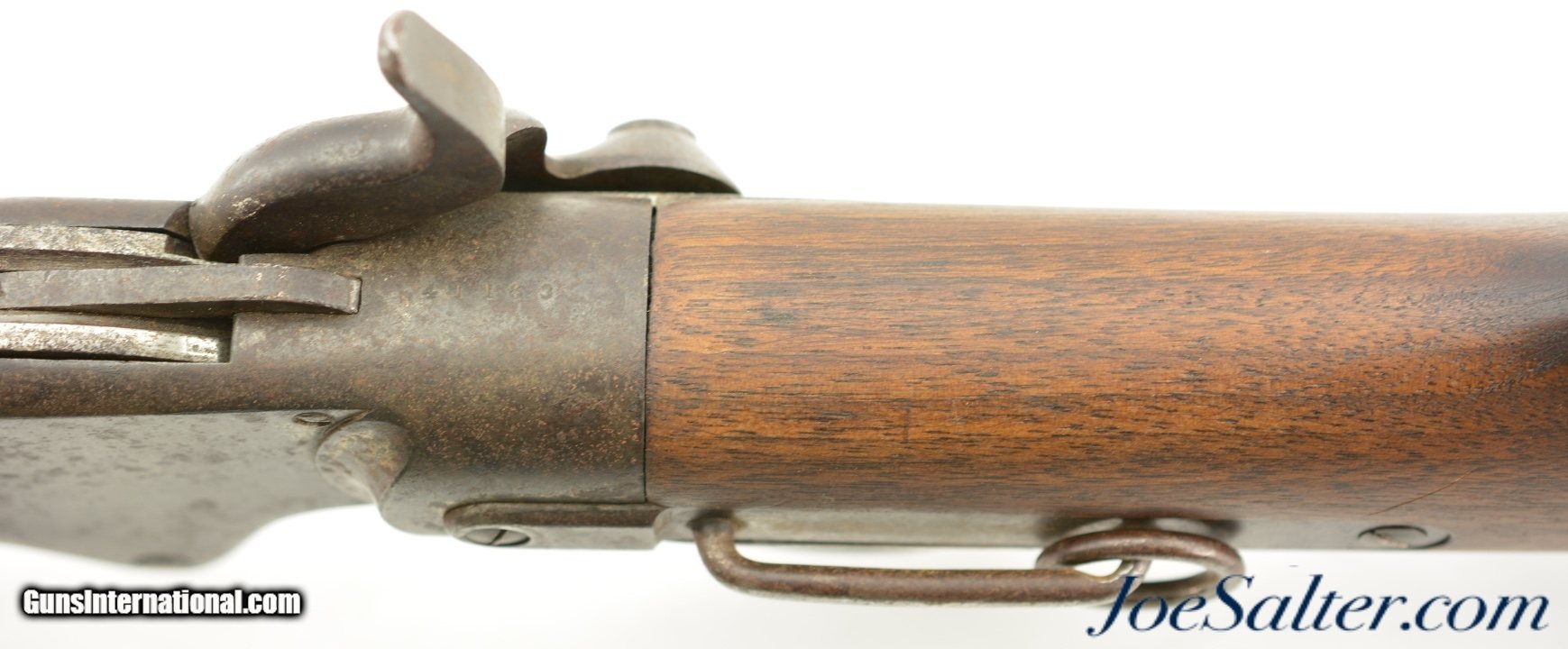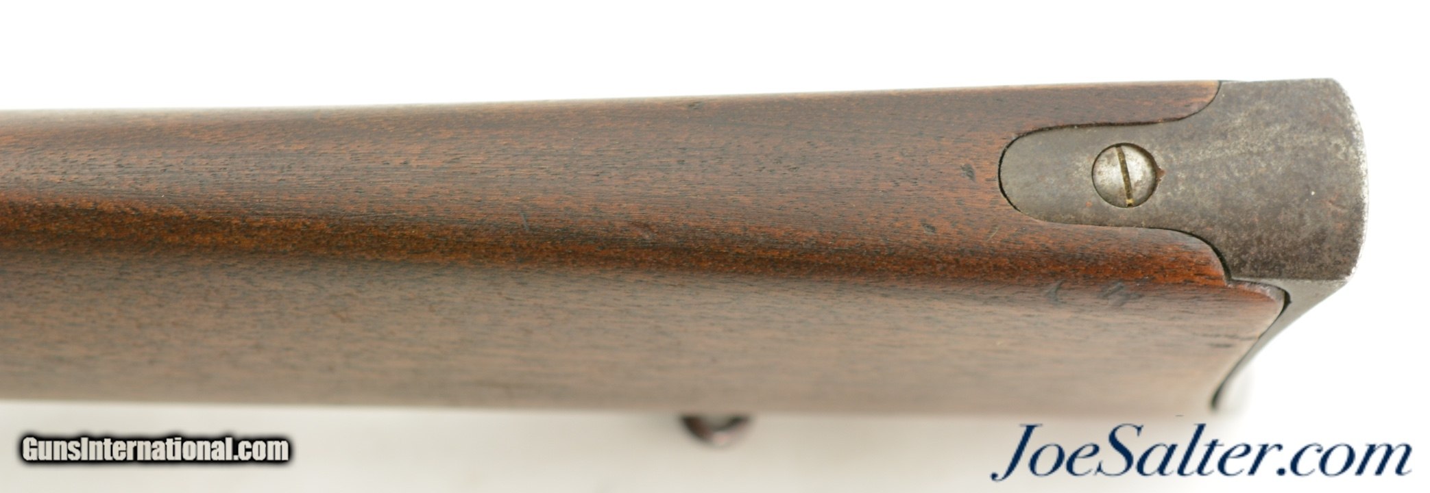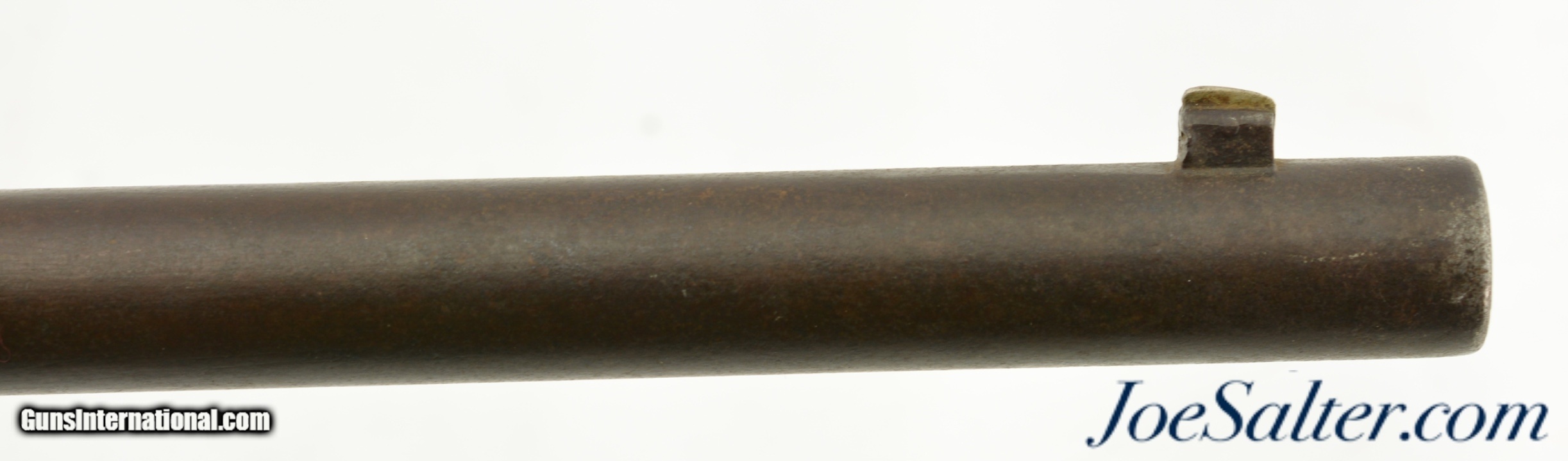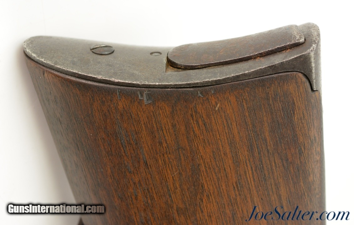 Description: Serial #41163, .52 Spencer RF, 22" barrel with a good bore that has dark spots of pitting along its length. The metal has an overall dark brown patina with patches of mild pinprick pitting along its length, with areas of thin surface oxidation scattered throughout as well. The Boston receiver markings are still clear and legible, and the sides of the breechblock have an overall mottled gray-brown patina. The walnut forend and buttstock have been sanded and refinished, with few handling marks or blemishes in the reapplied oil finish. No inspector cartouches are present, and there is some mild surface oxidation on the ring, bar, and plate on the left side of the wrist. The action is fully functional, and a single, functional tubular magazine is included. This is a good looking, "attic" condition Civil War Spencer, and rates fair-good overall. Antique Antique: Yes Price: $2,495.00 Contact Seller |