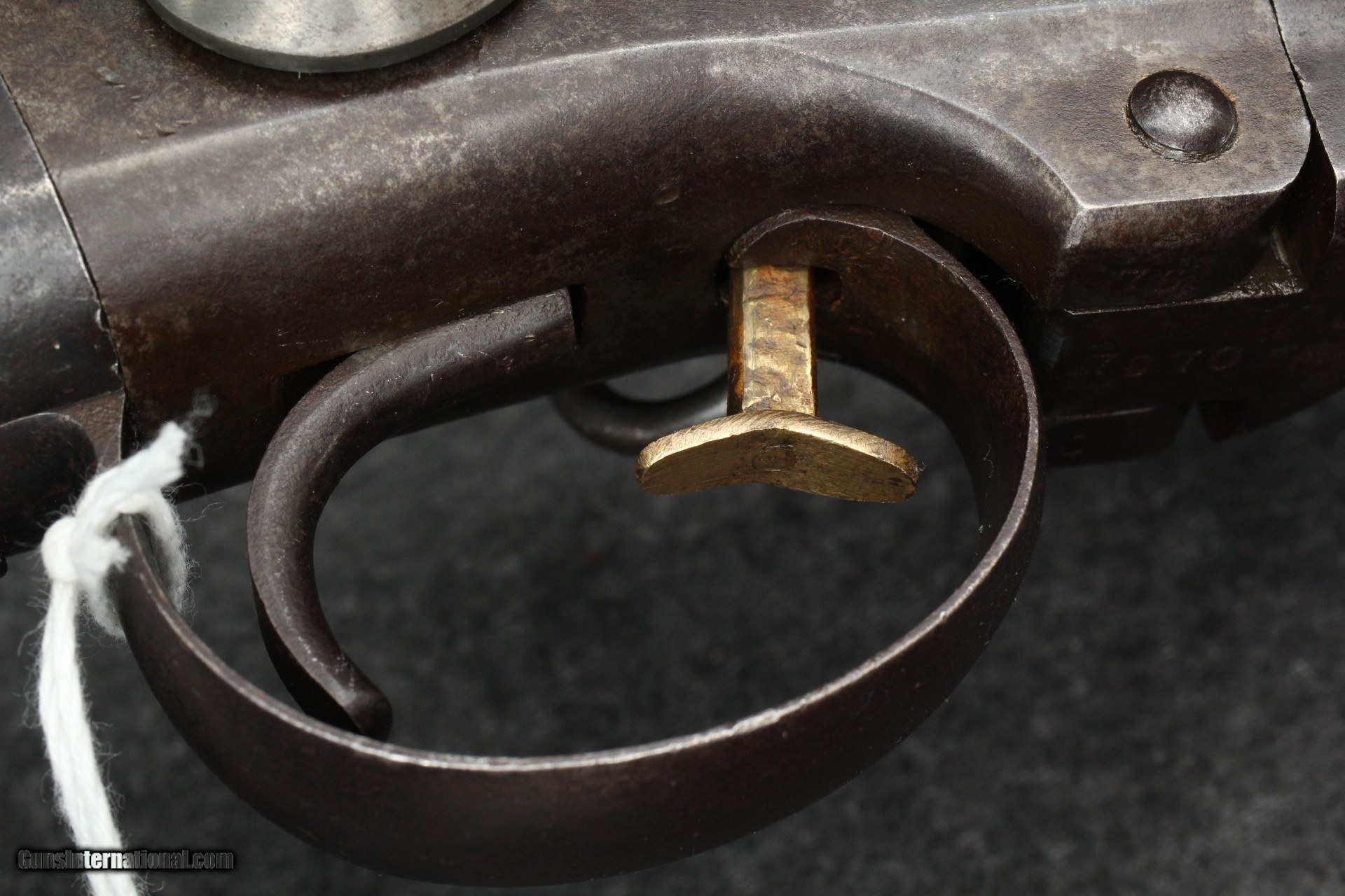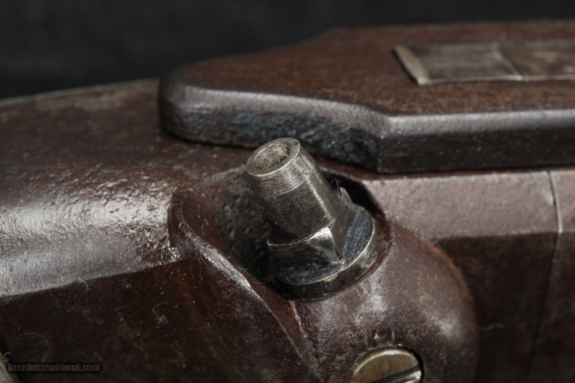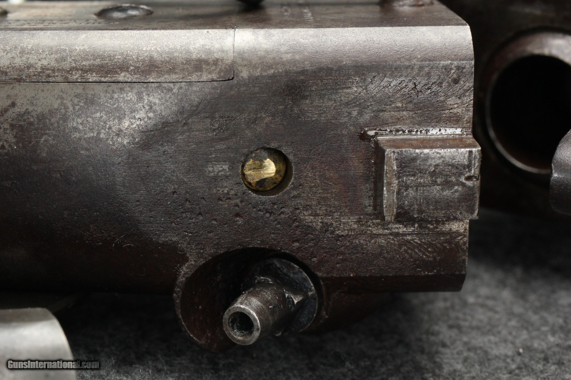Description: 50cal, serial number 76XX. Appears all original except for sights. Rear sight replaced with modern reproduction sight, front sight possibly altered with German silver insert. External metal shows uniform patina with minor pitting. Buttstock retains majority original varnish, crisp cartouche on left pistol grip. Apprears to be "J H". Scratch on left side of stock, not a crack. One minor crack on bottom left side of head, approx 1/2". Forend wood possibly cleaned and finish added. Epoxy around forend screw. Bore is primarily bright with one spot of heavy pitting, mid-forward portion of barrel. More photos on request. Please add $55.00 for shipping and insurance. SOLD Antique: Yes |