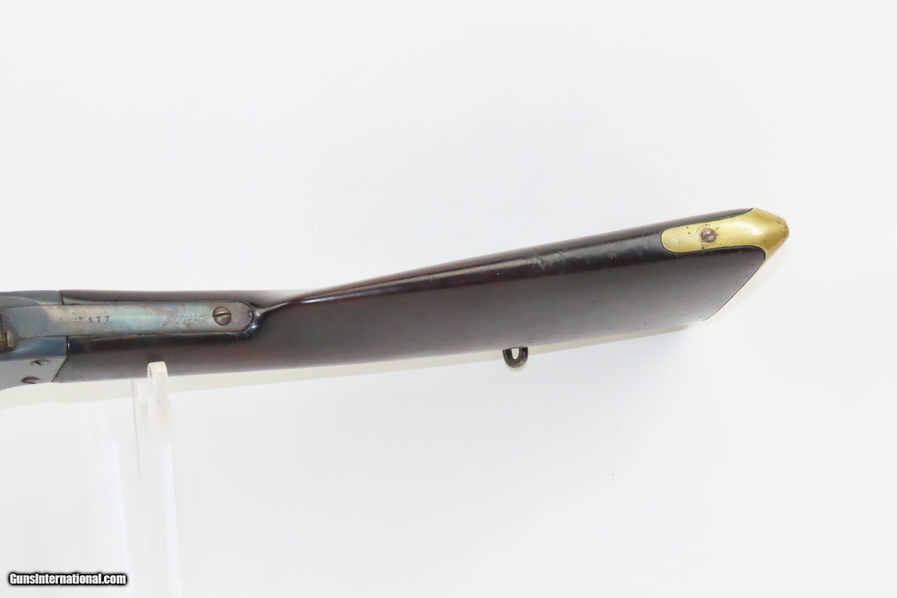 Description: RARE 1 of 500 CIVIL WAR Antique SHARPS & HANKINS M1862 ARMY .52 RF Carbine One of the MOST SCARCE CIVIL WAR CARBINES Here we present an antique Sharps and Hankins Model 1862 Army Carbine manufactured circa 1864 in Philadelphia, Pennsylvania. This is an extremely scarce carbine with only 500 of the “Army” variants produced. Sharps & Hankins produced three variants of their carbine, those being the Navy (6686 produced), the Army (500 produced), and the Short Cavalry (1000 produced). Made from 1862-65, the bulk of production was the more numerous Navy Carbine was still only just over 8,000 were produced. The Sharps & Hankins 1862 Army Carbine is one of the scarcest Civil War carbines encountered. The shape of the carbine is distinctly Sharps and operates a bit differently than other carbines of the era. The trigger guard doubles as a lever, which is opened by pressing a small tab inside the smaller loop of the lever. Opening the lever slides the barrel away from the recoil shield for loading and unloading. It has a great elevating rear sight and brass butt-plate. The Army and Navy versions both had a 24-inch barrel with the Navy coming with a leather cover to protect the barrel from salt water. The Army version's barrel was blued. The Short Cavalry version had a 19-inch blued barrel. The overall condition is very good. Nicely refinished. The action is excellent. The bore is fine: shiny bright with sharp rifling. The walnut stock is solid throughout. The serial number is on the top tang and is 2577; the number on the lower tang “101” may be some reference to the 101 Ranch that was an enormous ranch located in what is modern day northern Oklahoma but was then Indian Territory. Own the original! This is a legitimate antique and not a reproduction. Barrel is 24 inches. Caliber: .52 Rimfire Overall condition as seen in photos. Very Fast. Very Safe. FREE SHIPPING WORLDWIDE. Delivered directly to your door by express mail! Guaranteed AUTHENTIC & Includes CERTIFICATE OF AUTHENTICITY. ancestryguns $2800 #233516 SOLD Antique: Yes |