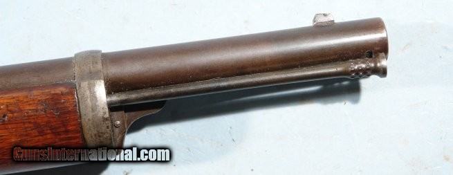 Description: RARE CIVIL WAR U.S. BALL U.S. CONTRACT .50 RF CAL. REPEATING CARBINE CA. 1865. 7 shot repeating carbine with 20 ½” barrel and fully U.S. Government Ordnance inspected including a very crisp stock cartouche on the left wrist behind the saddle ring bar. Original front and rear sights. Frame stamped “E.G. LAMSON & CO./WINDSOR, VT./U.S./BALL’S PATENT/JUNE 23, 1863/MAR.15, 1864”. Only 1002 manufactured. 100% original and fine overall. Barrel with most of the original blue and frame with greying original case hardening. Excellent screws. Stock and forend with the original finish. Extra nice legible cartouche. Excellent bore and perfect working order. SOLD Antique: Yes Rifle Caliber: .50 |