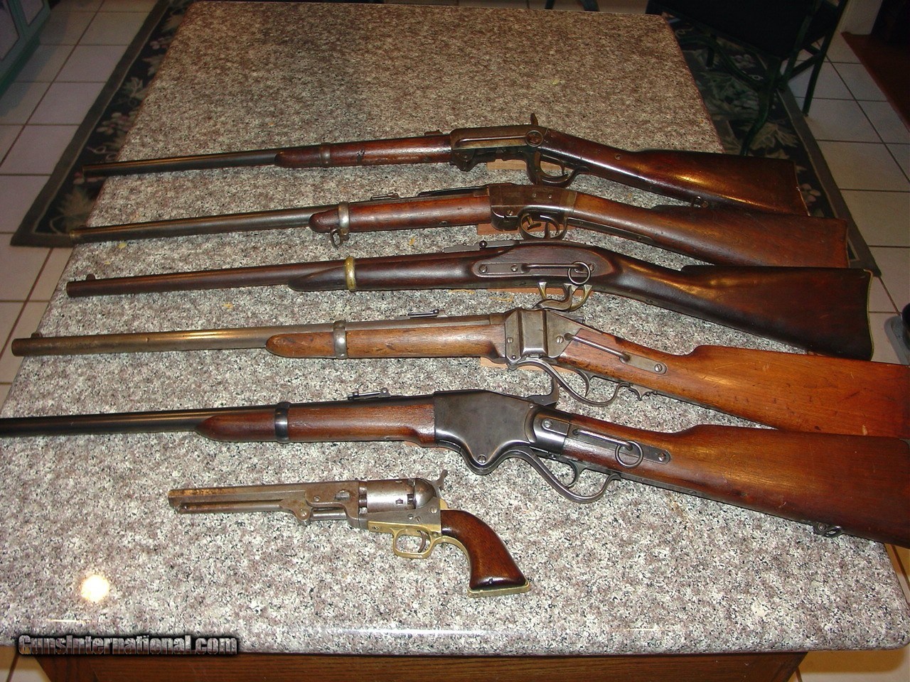 Description: ***** SOLD AS ONE LOT ONLY **** Civil War Carbines and Colt pistol. Everything pictured included. Can deliver to Tulsa. Spencer, Smith Merrill Burnside Sharps SOLD Antique: Yes |