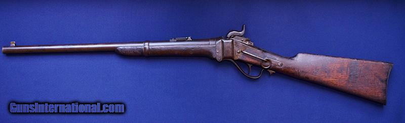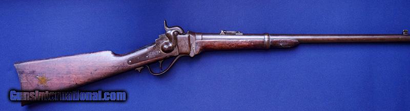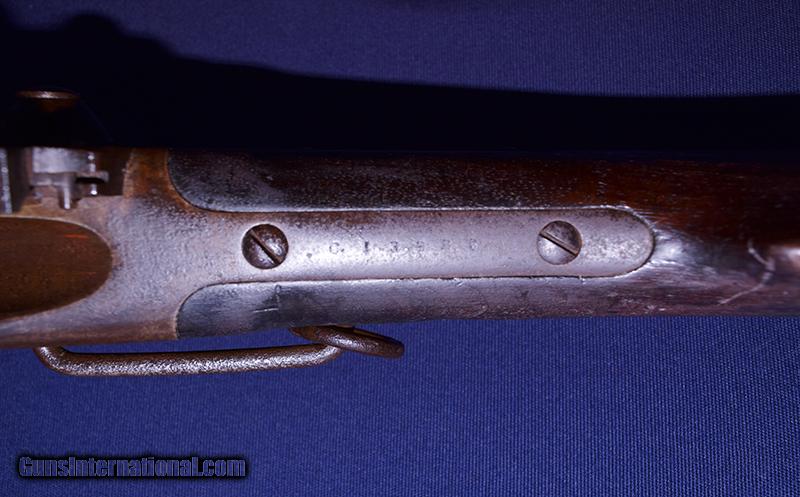 Description: Sharps New Model 1863 Saddle Ring Carbine, .52 caliber percussion, serial number C13XXX, 22” barrel with a good bore, silver blade front sight & elevation adjustable ladder rear sight. Markings are visible throughout including “SHARPS RIFLE/MANUFG CO./HARTFORD,CONN” address stamp on top of barrel with “NEW MODEL 1863” stamped behind rear sight, both sharps & Lawrence patents on lock & receiver, Inspector marks E.A.W. stamped on left rear barrel flat as well as saddle bar mount. Stock has brass star inlaid on the right side; left side of stock has 2 cartouches below the saddle bar with bottom cartouche remaining highly visible, top cartouche still remains but is faint. Initials “ML” are also carved into the left side of the buttstock towards the buttplate. Metal carries an even plum brown patina throughout, wood is well fitted showing some wear & handling marks. The bottom of the forend has a repaired crack where the wood meets the receiver to just before the barrel band. Nice example of a Civil War period carbine. SOLD Antique: Yes |