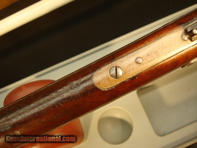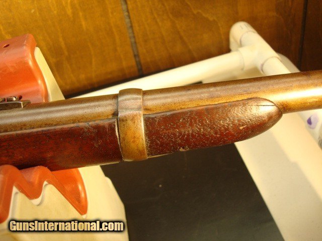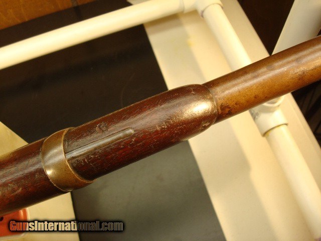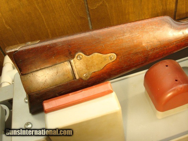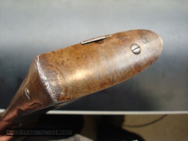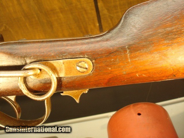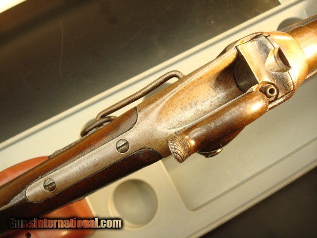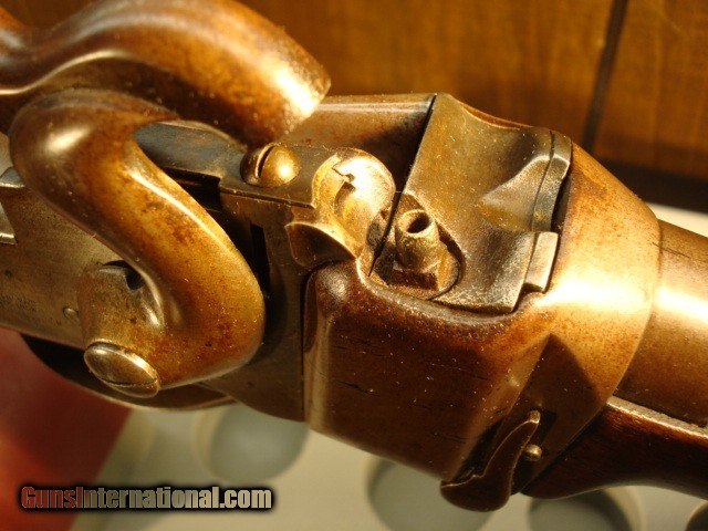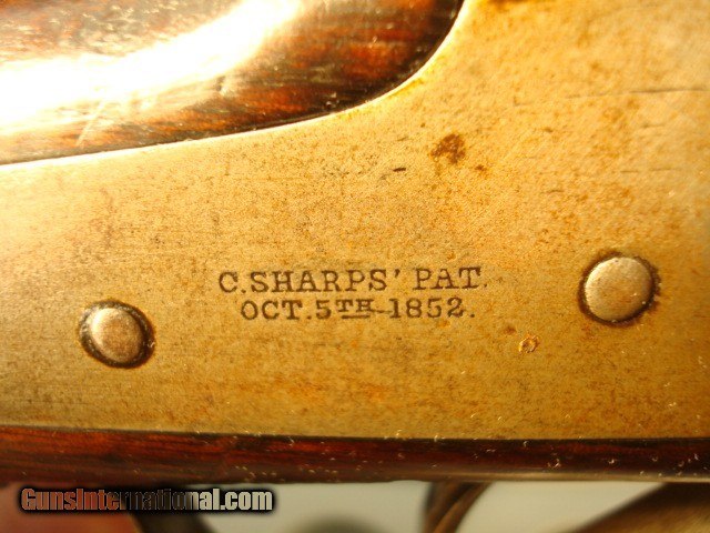Description: Sharps New model 1859, serial #32664 in original configuration. The carbine is .52 cal with a combination pellet priming or percussion priming system. Early in serial number range of 30,000-80,000. Right side of receiver is stamped C SHARPS’ PAT/OCT.5th 1852. This would have place manufacturing around 1858 or 1859. The following is lightly stamped on the rear sight base, “RS LAWERENCE/PATENED/ Feb. 15th 1859”. On the back end of the barrel there is a very light, partial stamp, “NEW MODEL 1859”. Front of rear sight has a partial, very light stamping. You can just see some of the letter Co/Conn which originally would have been “Sharps Rifle/ Manufg. Co/ Hartford Conn.” On the receiver just in front of saddle bar appears to be “PATD. 1848”. Again, a very light stamp. The rear of the trigger bar has inspector letters AHF. The carbine is .52 cal with a combination pellet priming or percussion priming system. Straight breech falling block. 22in. browned barrel. All iron furniture including stock patch box. Saddle ring and bar are present. Finish on all the metal has patinaed to an overall brown color with some light surface spotting on the bullet feed groove. See pictures. The wood is in good condition with some dings and dents but remarkably good for the age. There is an aging cracks in the wood radiating from the left front of the forend but it dies in the wood. Original wood finish. See pictures for most severe dings, three on butt stock and one on for end. The bore has sharp lands and grooves and some shine but has some scattered light pitting. Action is tight with precise clicks and trigger release. In summary, this is just a nice old carbine in original configuration that escaped being re-arsenaled and displays itself well as an honest civil war survivor. Shipping charge $50 shipped direct to address of buyer. Antique, no license required. Bank or certified check or money order. Private individual so cannot accept credit cards. Sharps New model 1859, serial #32664 in original configuration. The carbine is .52 cal with a combination pellet priming or percussion priming system. Early in serial number range of 30,000-80,000. Right side of receiver is stamped C SHARPS’ PAT/OCT.5th 1852. This would have place manufacturing around 1858 or 1859. The following is lightly stamped on the rear sight base, “RS LAWERENCE/PATENED/ Feb. 15th 1859”. On the back end of the barrel there is a very light, partial stamp, “NEW MODEL 1859”. Front of rear sight has a partial, very light stamping. You can just see some of the letter Co/Conn which originally would have been “Sharps Rifle/ Manufg. Co/ Hartford Conn.” On the receiver just in front of saddle bar appears to be “PATD. 1848”. Again, a very light stamp. The rear of the trigger bar has inspector letters AHF. The carbine is .52 cal with a combination pellet priming or percussion priming system. Straight breech falling block. 22in. browned barrel. All iron furniture including stock patch box. Saddle ring and bar are present. Finish on all the metal has patinaed to an overall brown color with some light surface spotting on the bullet feed groove. See pictures. There is no pitting on the carbine just consistent honest wear. The wood is in good condition with some dings and dents but remarkably good for the age. There is an aging cracks in the wood radiating from the left front of the forend but it dies in the wood. Original wood finish. See pictures for most severe dings, three on butt stock and one on for end. The bore has sharp lands and grooves and some shine but has some scattered light pitting. Action is tight with precise clicks and trigger release. In summary, this is just a nice old carbine in original configuration that escaped being re-arsenaled and displays itself well as an honest civil war survivor. Shipping charge $50 shipped direct to address of buyer. Antique, no license required. Bank or certified check or money order. Private individual so cannot accept credit cards. Sharps New model 1859, serial #32664 in original configuration. The carbine is .52 cal with a combination pellet priming or percussion priming system. Early in serial number range of 30,000-80,000. Right side of receiver is stamped C SHARPS’ PAT/OCT.5th 1852. This would have place manufacturing around 1858 or 1859. The following is lightly stamped on the rear sight base, “RS LAWERENCE/PATENED/ Feb. 15th 1859”. On the back end of the barrel there is a very light, partial stamp, “NEW MODEL 1859”. Front of rear sight has a partial, very light stamping. You can just see some of the letter Co/Conn which originally would have been “Sharps Rifle/ Manufg. Co/ Hartford Conn.” On the receiver just in front of saddle bar appears to be “PATD. 1848”. Again, a very light stamp. The rear of the trigger bar has inspector letters AHF. The carbine is .52 cal with a combination pellet priming or percussion priming system. Straight breech falling block. 22in. browned barrel. All iron furniture including stock patch box. Saddle ring and bar are present. Finish on all the metal has patinaed to an overall brown color with some light surface spotting on the bullet feed groove. See pictures. There is no pitting on the carbine just consistent honest wear. The wood is in good condition with some dings and dents but remarkably good for the age. There is an aging cracks in the wood radiating from the left front of the forend but it dies in the wood. Original wood finish. See pictures for most severe dings, three on butt stock and one on for end. The bore has sharp lands and grooves and some shine but has some scattered light pitting. Action is tight with precise clicks and trigger release. In summary, this is just a nice old carbine in original configuration that escaped being re-arsenaled and displays itself well as an honest civil war survivor. Shipping charge $50 shipped direct to address of buyer. Antique, no license required. Bank or c