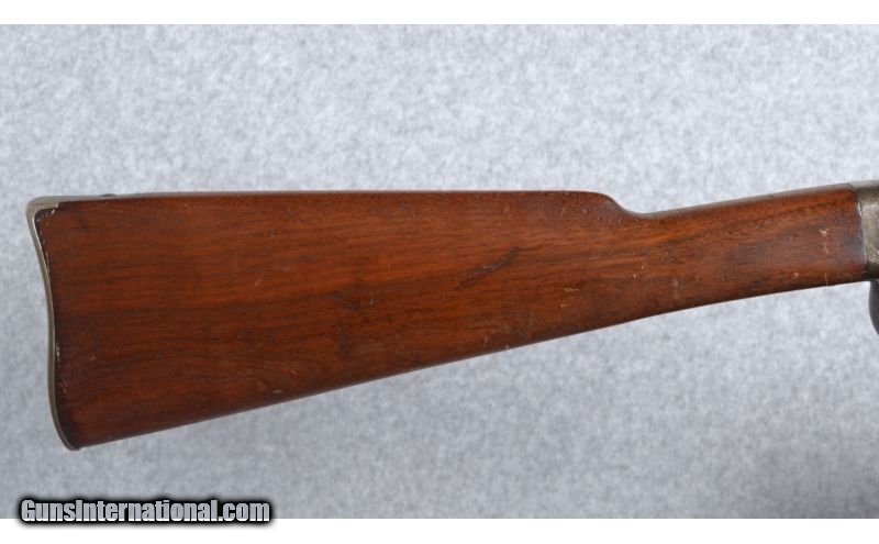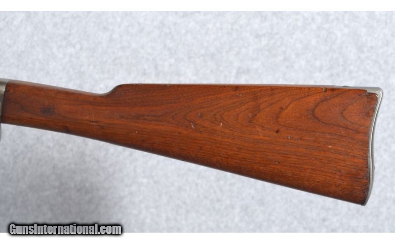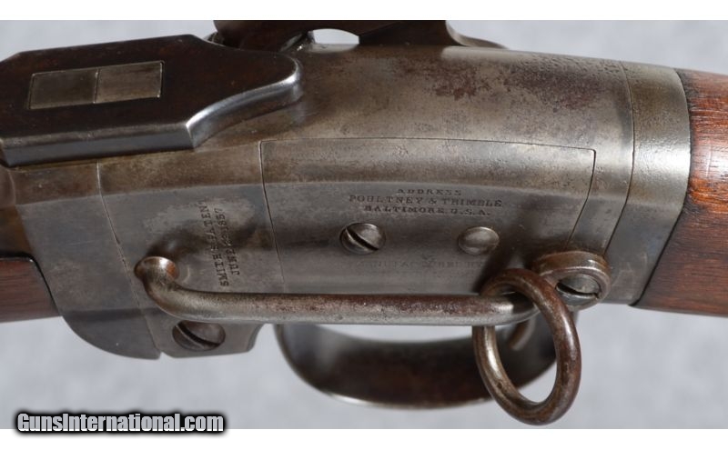 Description: Smith Carbine ~ Civil War ~ .50 Caliber BP. Manufactured by American Machine Works and agents, Thomas Poultry & D.B. Trimble, Baltimore. The left side of receiver is marked, ADDRESS/POLTNEY & TRIMBLE/BALTIMORE, U.S.A" and "SMITH'S PATENT/JUNE 23 1857" which are still showing stong numbers and letters. Under the two cross-bolts of the receiver the first line is faint but appears to be MANUFACTURED BY/AM'N M'CH'N WKS" the last line is significantly worn but there is enough to be "SPRINGFILED MASS". SOLD Antique: Yes Manufacturer: 1861-1865. S#8309 Caliber Info: .50 Caliber, percussion, breechloader. Chambers: Single shot. Metal Condition: Mostly all patina, slight hint of faded case color remaining on receiver. Wood Condition: Fair with numerous scratches and two short age cracks in the butt where wood joins the receiver near the bottom. Bore Condition: Still has rifling but numerous shallow pitts yet has decent shine remaining. Barrels: 21 5/8 Triggers: Single. Stock: Walnut with cartouche in the wrist of the left side of the butt-stock. Stock Dimensions: 14 1/2" length of pull. Butt Pad: Steel plate. Sights: Silver blade front sight and flip up rear. Item Location: Boise, ID |