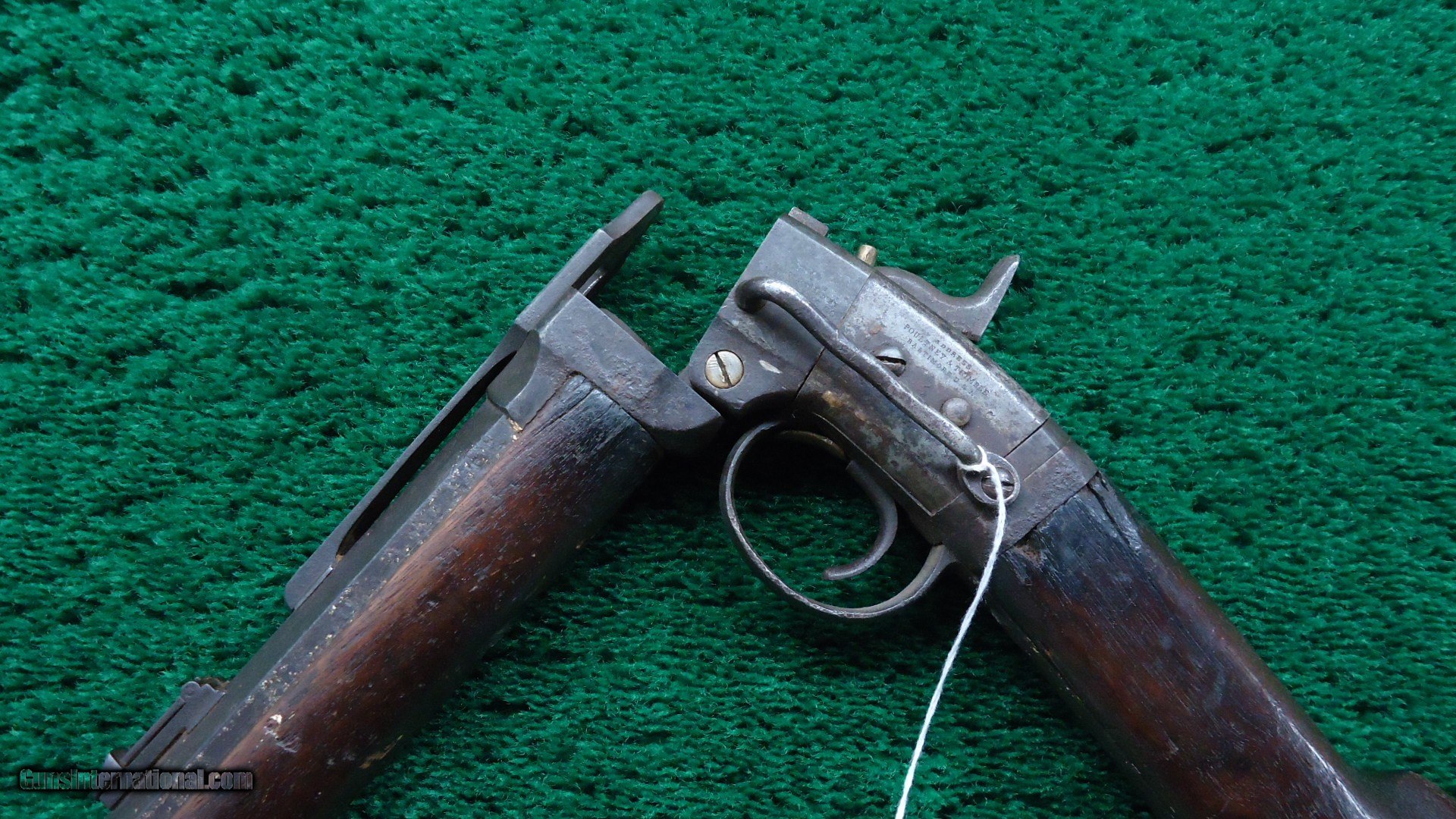 Description: This is the Poultney & Trimble percussion breech loading carbine. This old gun has seen some use. A deep brown patina covers most of the gun with the balance being a grey color. It is lightly cleaned where the Poultney & Trimble markings are. Bore is very dark but rifling is visible. There is some play in the lock up mechanism. This old Civil War gun was used for a long time after the war for hunting or protection. It shows the wear. Butt stock isn’t too bad but there is a few small pieces missing on the left hand side towards the frame. A chip out on the bottom towards the lower tang on the right side. Suprisingly the toe and bottom of the stock is pretty good. The forearm has seen some use and abuse with a couple of chips out and several dings. The wood is solid though. Saddle ring is missing. This gun is very old and it looks it! A good wall hanger. Leroy Merz Antique Firearms specializes in antique and vintage Winchesters and other fine American firearms. Since 1965 Mr. Merz has taken part in the world of firearms and has been a contributor to many well known reference books. Just recently we mailed the 129th edition of our privately-published catalog. We have hundreds of additional guns in every price range at our home online. Search for Merz Antiques in google. SOLD Antique: Yes |