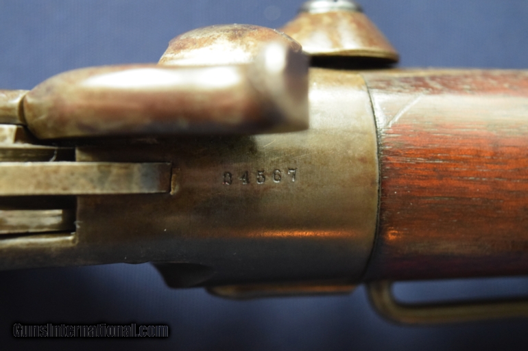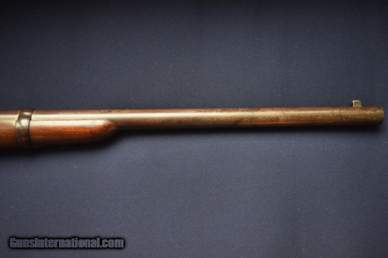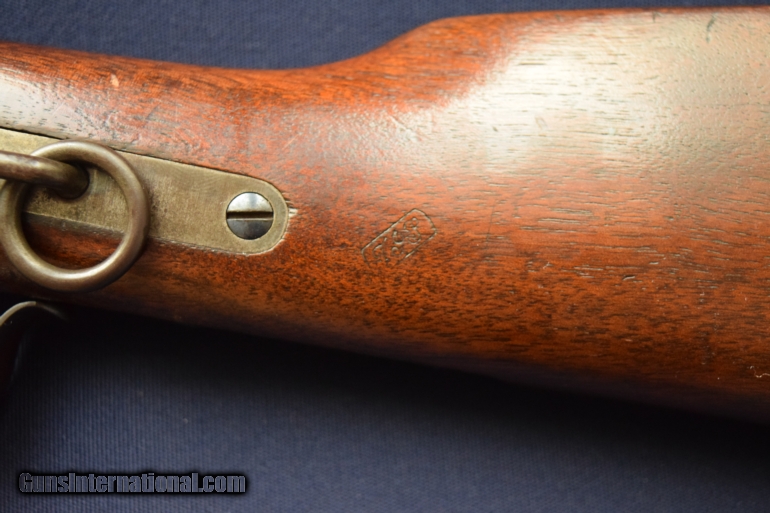 Description: Spencer Model 1860 Repeating Carbine serial number, 34,XXX, 7 shot magazine fed, .52 caliber, 22" barrel with saddle ring. Original walnut shoulder stock and forearm in good condition with visible Inspector Cartouche on left side of rear stock. Possible Cavalry unit identification stamp behind trigger plate. Top of barrel stamped, "SPENCER REPEATING/RIFLE CO. BOSTON. MASS./PAT'D MARCH 6. 1860." Other various inspector marks are visible on the breech as well as the frame. After the Civil War this Spencer was sent back to the Armory and received the "Stabler Cut-Off" which allows for the use of a single shot and keeps the breech from opening completely. The carbine also received the, "TJS" Cartouche on the left side of the stock which are the initials of T.J. Shepard who was an inspector for Springfield Armory. Has original brass blade front sight with folding rear sight, "V" notch elevation bar in increments up to 800 yards. Bore is in excellent condition. Overall a good example of a Civil War & Indian War Spencer Model 1860. SOLD Antique: Yes |