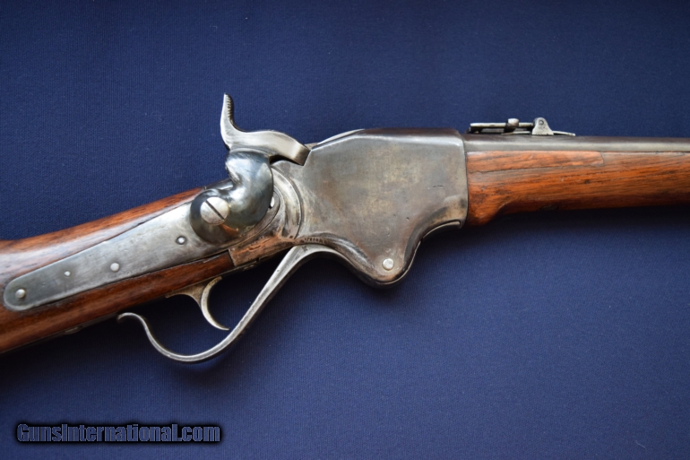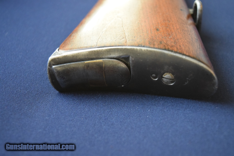 Description: Spencer Model 1860 Carbine serial number 59,XXX, .52 caliber, 7 shot magazine fed, 22" barrel with saddle ring. Top of barrel stamped, "SPENCER REPEATING/RIFLE CO. BOSTON. MASS./PAT'D MARCH 6. 1860." Inspector marks are visible on various parts of the gun including breech lever, frame, hammer and towards the rear of the hammer plate. The stock has two repairs on the forearm, one on each side as well as one repair to the right side of the shoulder stock. The carbine retains original sights including folding rear sight with "V" notch elevation bar in increments up to 800 yards. Finish is a light to dark grey with original blue mixed in. The carbine does show some scratches on frame due to use. The bore is excellent. This is a good example of a Spencer Model 1860. SOLD Antique: Yes |