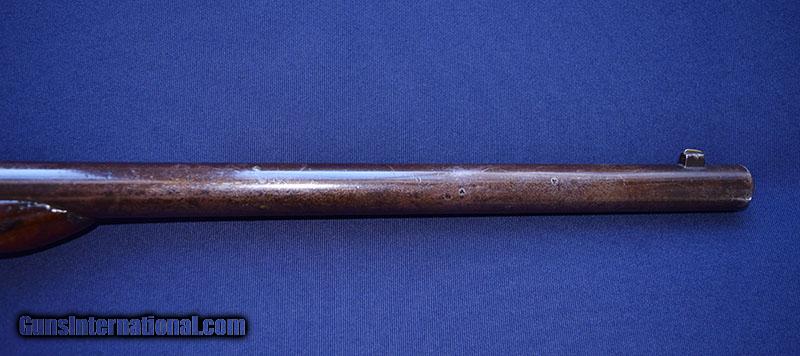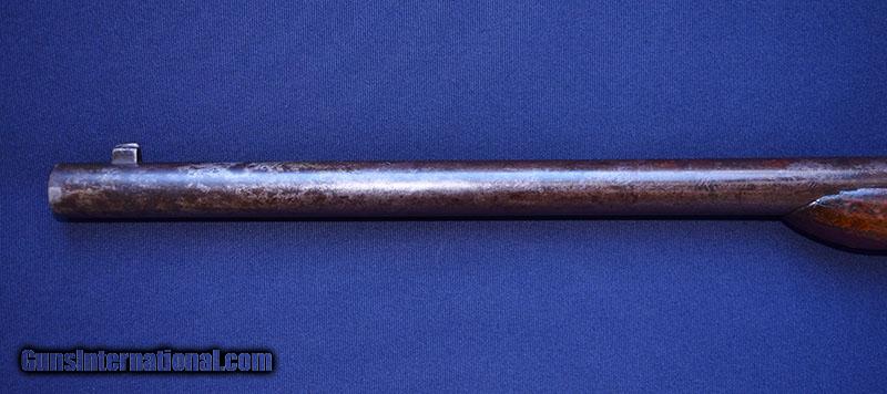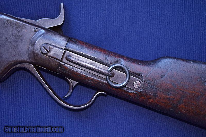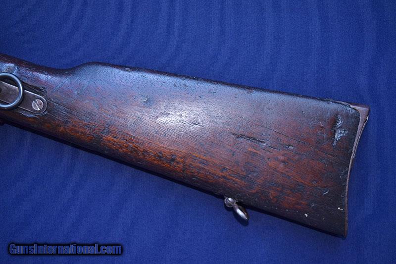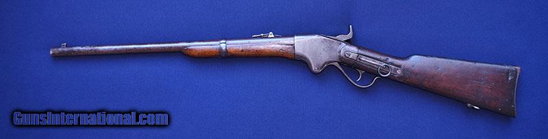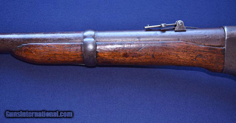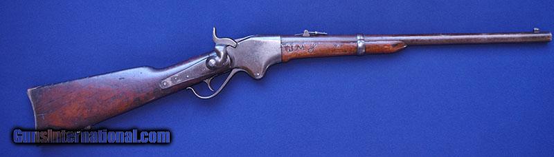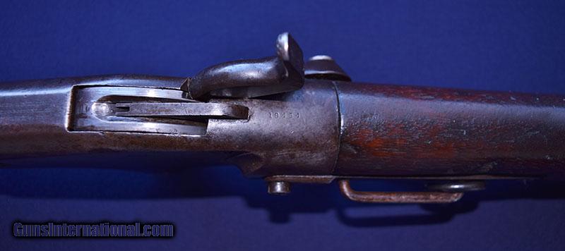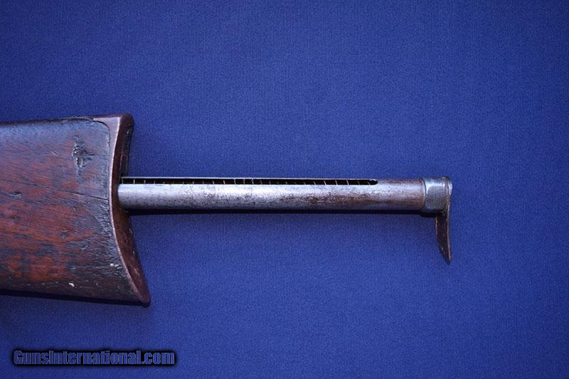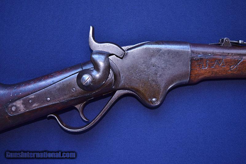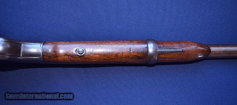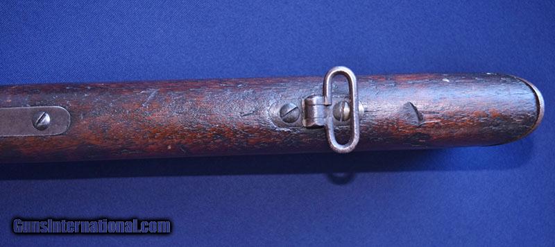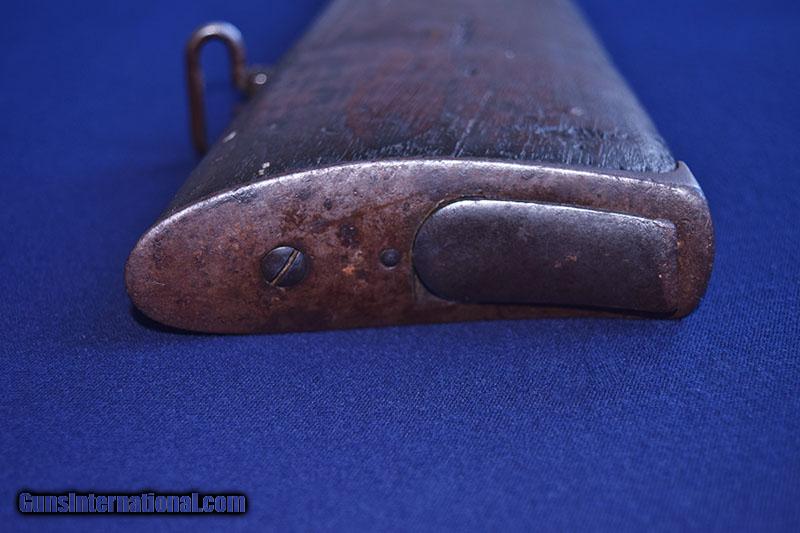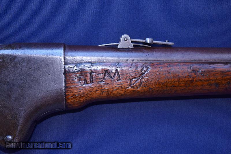 Description: Spencer Model 1860 Repeating Carbine, Civil War serial number range 19XXX, .52 Spencer, 7 shot magazine fed with 22” round barrel with saddle ring, military rear sight. Features standard markings with Spencer address & patent date on top of barrel. In good plus condition overall, metal surfaces show a grey & brown patina with stocks showing typical use marks throughout with the initials “J.M.S” carved into the right side of the forearm & a couple light cracks in the buttstock & a chip just above saddle ring bar. Mechanically sound with good bore. Good example of the Civil War Model 1860 Spencer Carbine. SOLD Antique: Yes |
