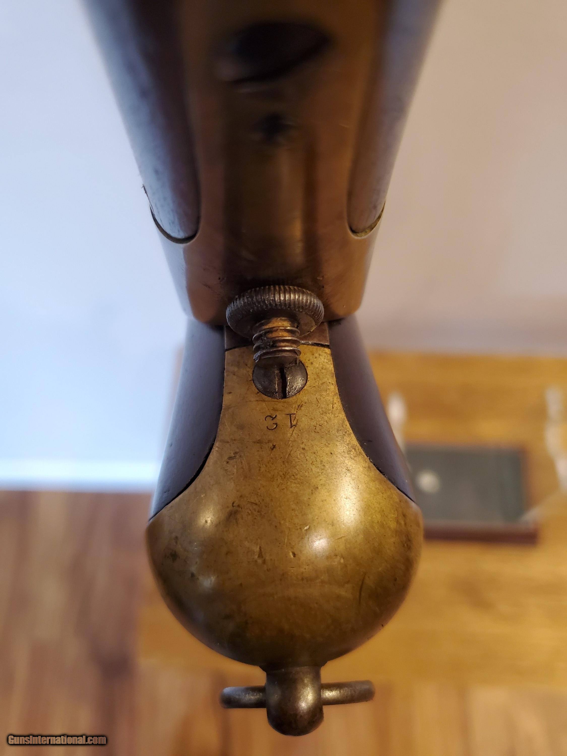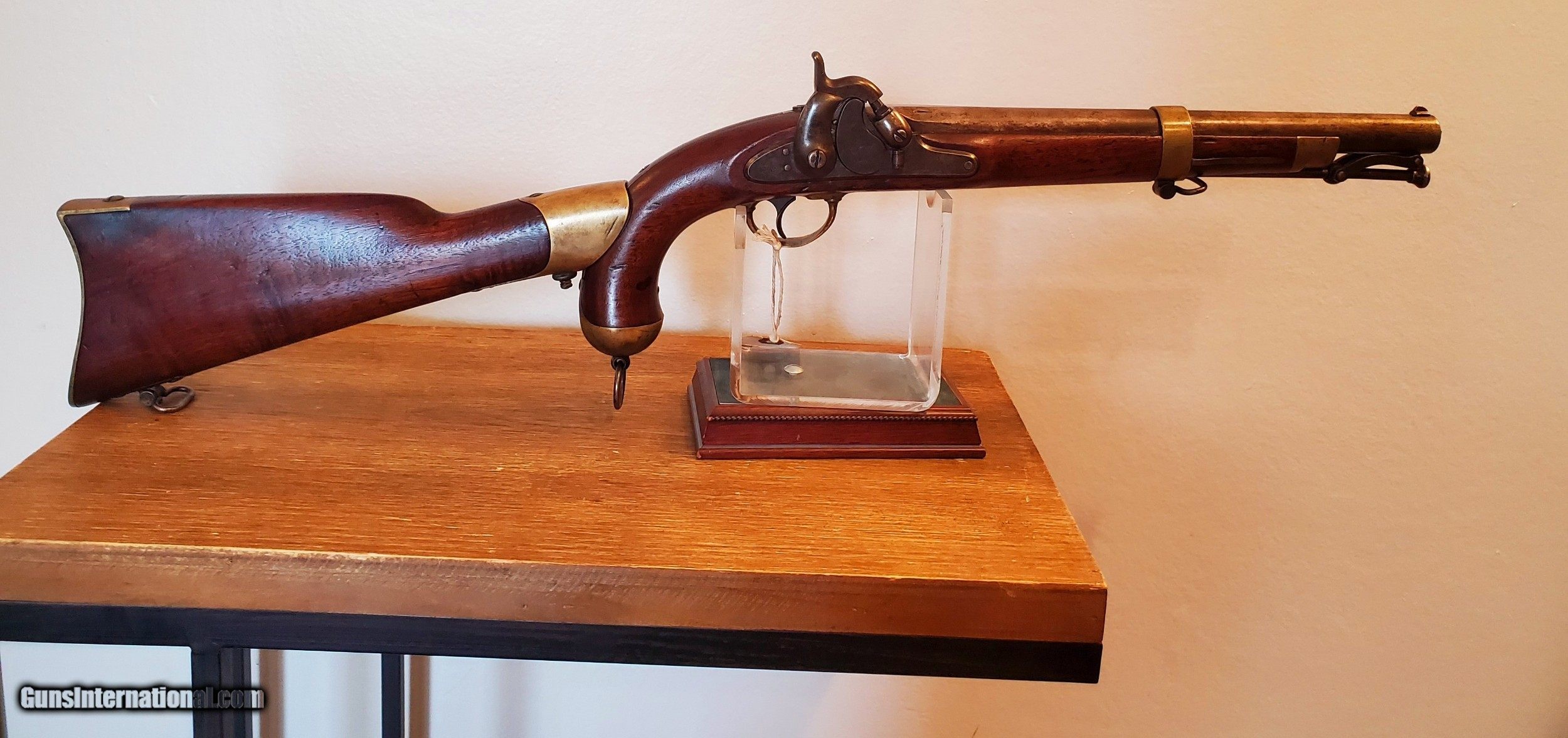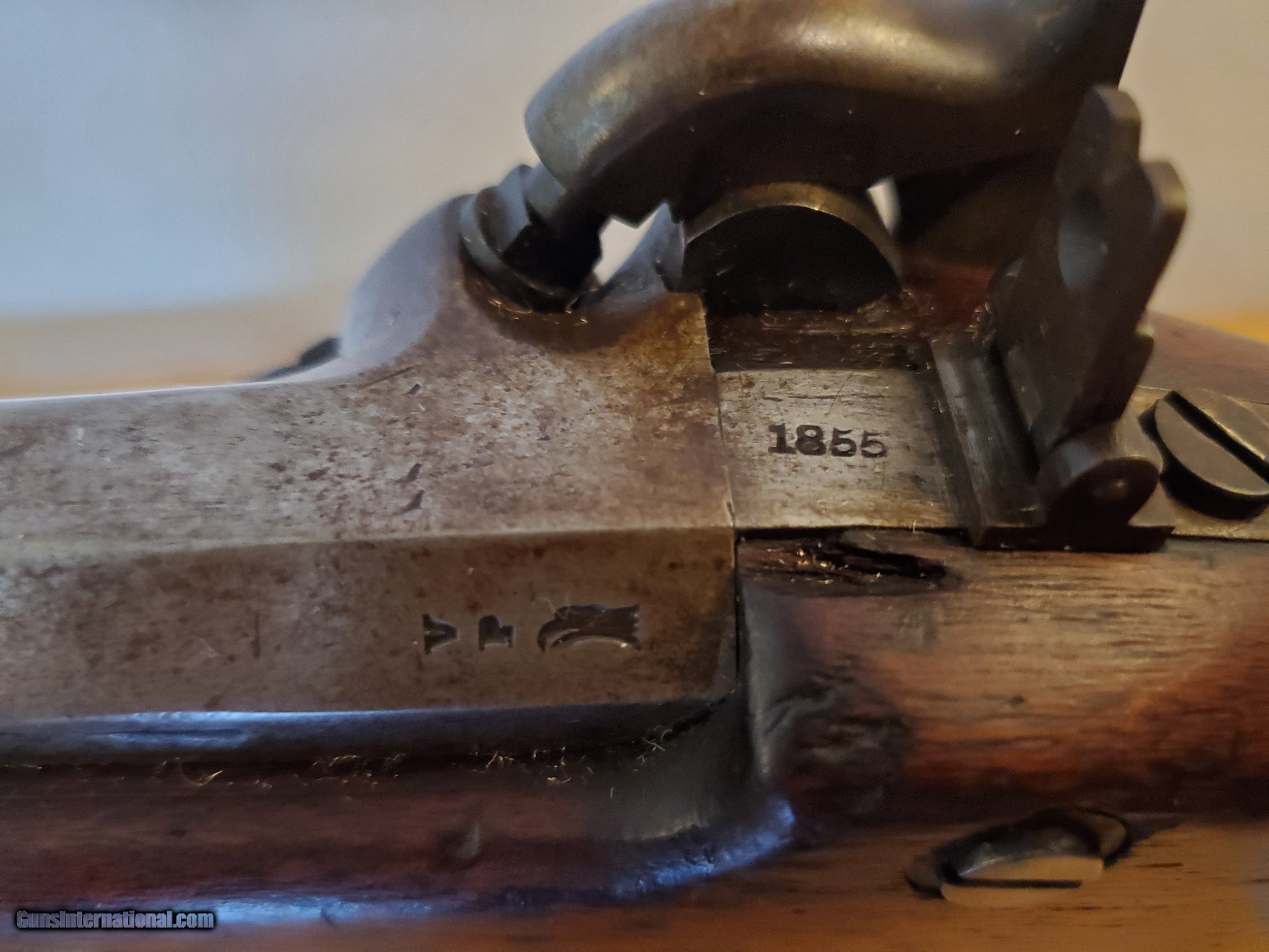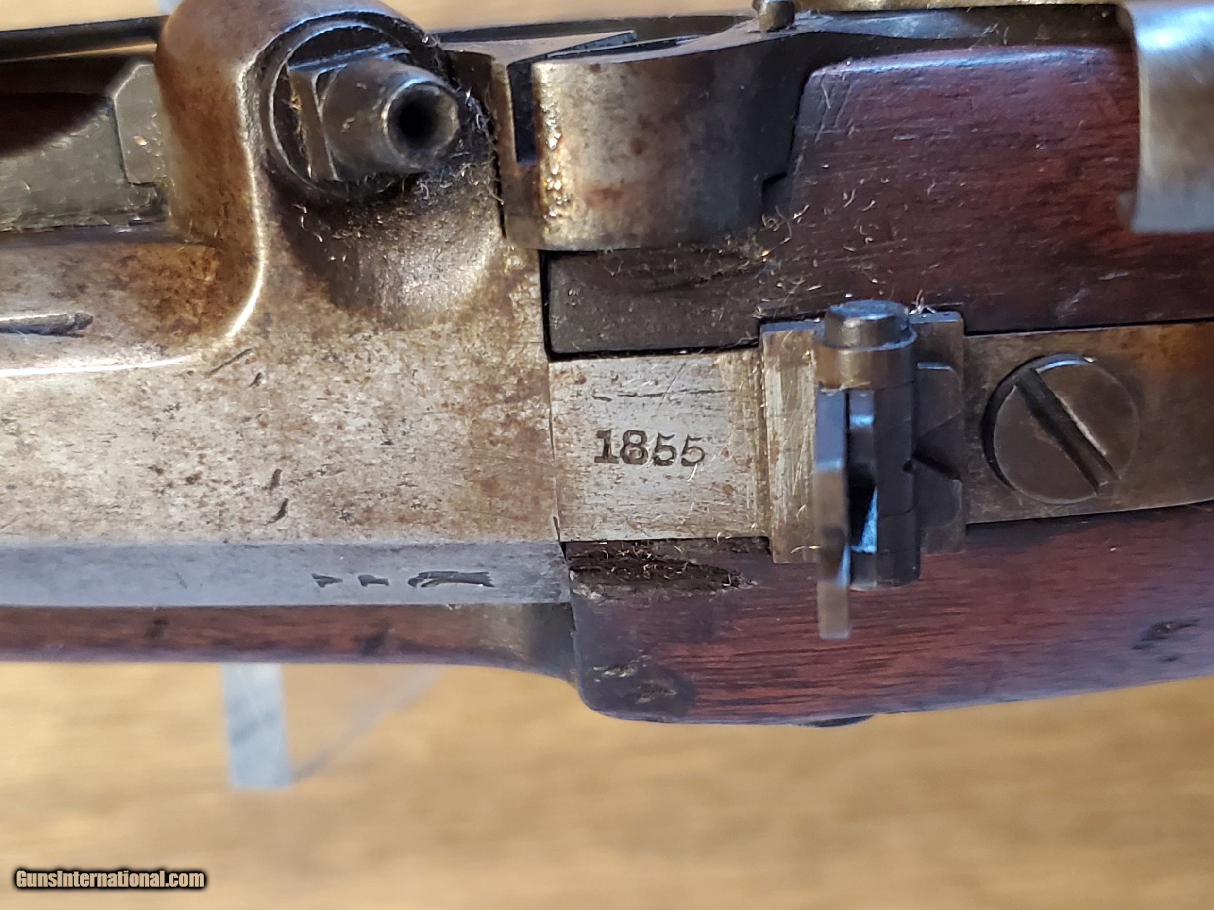 Description: This US Model 1855 Pistol is one of only 4021 made by the Springfield Armory from 1855-1857. The lock has Maynard's self-priming device, 2 rear leaf sight, lanyard ring on grip cap and sling swivels on the front band and should stock. 12" barrel w/captive ramrod in .58 Caliber and three groove rifling. A good many of these found their way into bot the Union and Confederacy during the Civil War. The original design concept was so that a cavalryman could work with the pistol on horseback but be able to convert it to the carbine configuration for dismounted fighting by attaching the shoulder stock. However, reports from the field were not too favorable. Despite the drawbacks, many 1855's were still in service going into the year 1863. According to "Cavalry Carbines of the U.S. Cavalry 1861-1905", the Union Army's quarterly field report taken on December 31, 1862, reports 400 Springfield Pistol Carbines were still in service. Given some evidence from surviving photographs taken during the war, we also know that the 1855 did find its way into Confederate Cavalry regiments as well. Condition fine plus nice cartouche, medal excellent with great marking, the wood stock is nice but has a hairline crack which, 100% original no repro parts, nice bore. works great very crisp action. SOLD Antique: Yes Manufacturer: Springfield Model: 1855 Wood Condition: very good Bore Condition: very good |