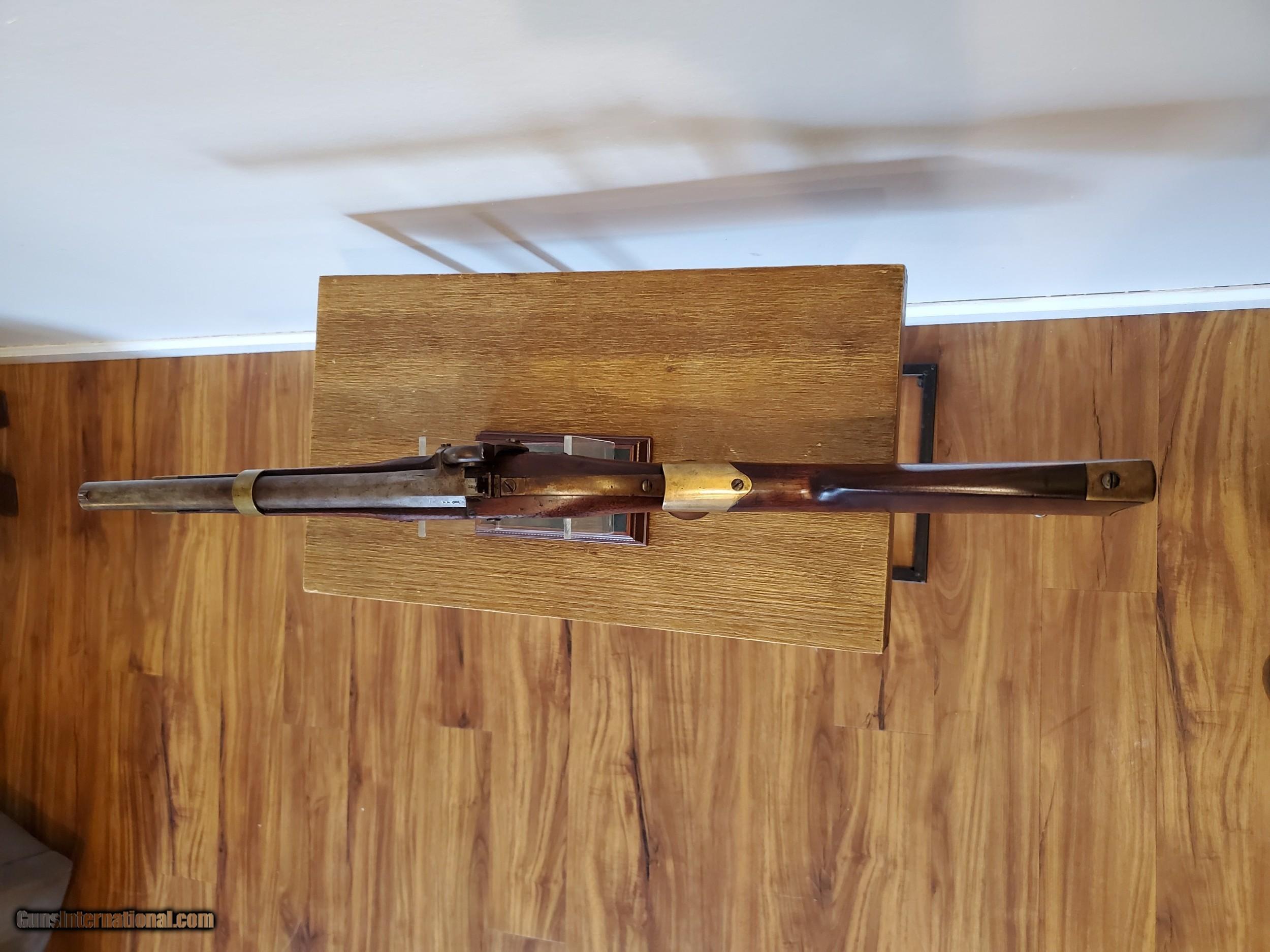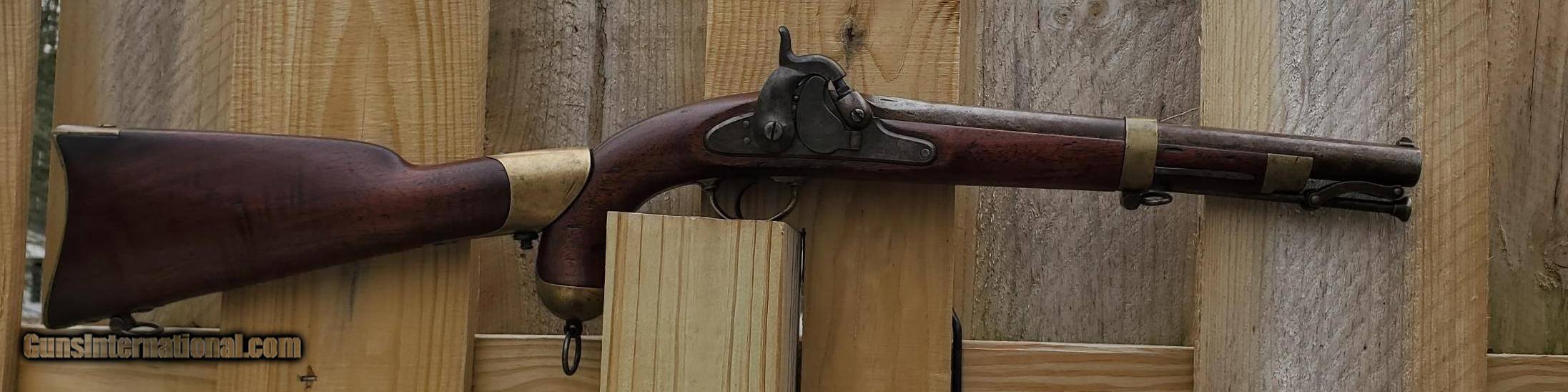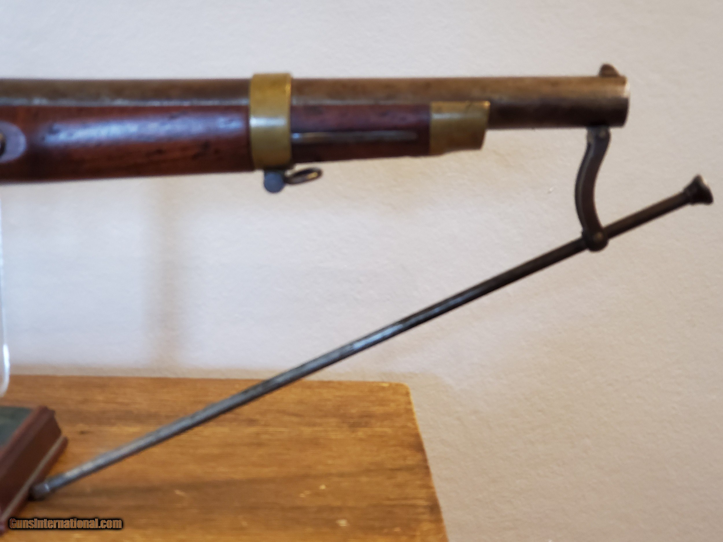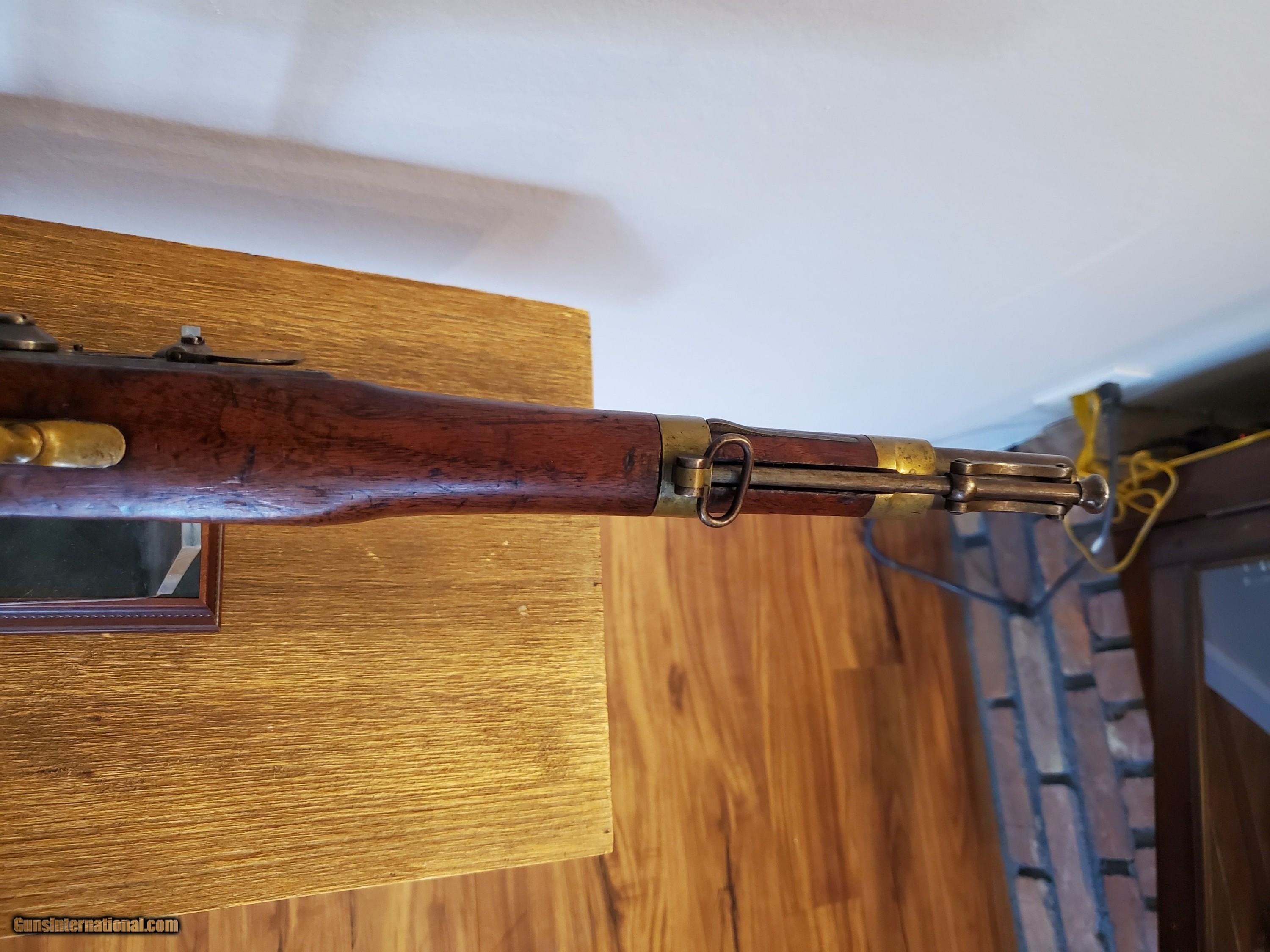 Description: This US Model 1855 Pistol is one of only 4021 made by the Springfield Armory from 1855-1857. The lock has Maynard's self-priming device, 2 rear leaf sight, lanyard ring on grip cap and sling swivels on the front band and should stock. 12" barrel w/captive ramrod in .58 Caliber and three groove rifling. A good many of these found their way into bot the Union and Confederacy during the Civil War. The original design concept was so that a cavalryman could work with the pistol on horseback but be able to convert it to the carbine configuration for dismounted fighting by attaching the shoulder stock. However, reports from the field were not too favorable. Despite the drawbacks, many 1855's were still in service going into the year 1863. According to "Cavalry Carbines of the U.S. Cavalry 1861-1905", the Union Army's quarterly field report taken on December 31, 1862, reports 400 Springfield Pistol Carbines were still in service. Given some evidence from surviving photographs taken during the war, we also know that the 1855 did find its way into Confederate Cavalry regiments as well. Condition fine plus nice cartouche, medal excellent with great marking, the wood stock is nice but has a hairline crack which, 100% original no repro parts, nice bore. works great very crisp action. SOLD Antique: Yes Manufacturer: Springfield Model: 1855 Wood Condition: very good Bore Condition: very good |