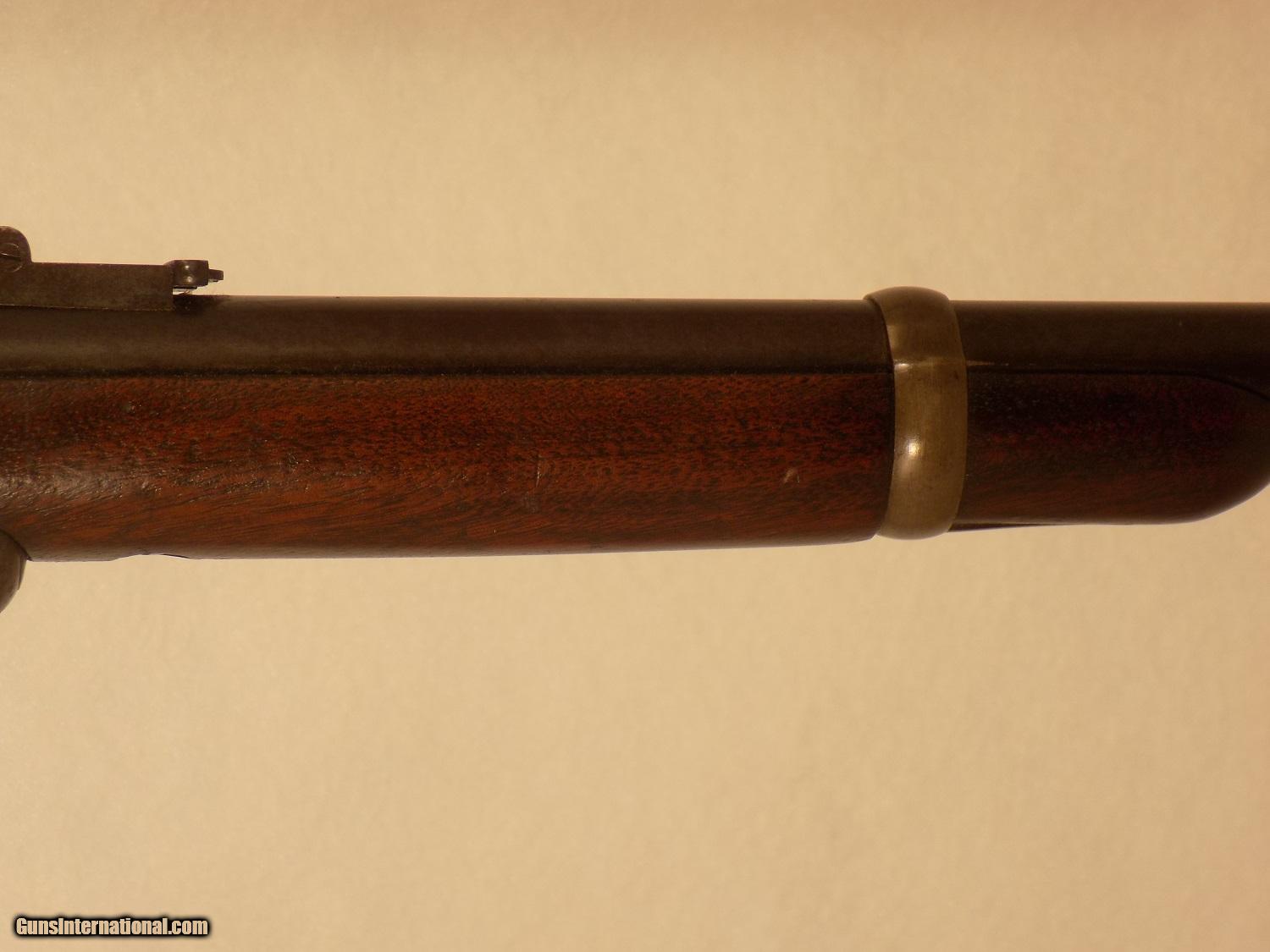 Description: #960A TRIPLETT & SCOTT CIVIL WAR CARBINE "REPEATER", 50 RF, 22" bbl., left side of bbl. marked "Kentucky", original sights, 90% casehardening, 98% blue, exc. to mint wood, VG bright bore, one sling swivel, magazine tube in butt. $3450 SOLD |