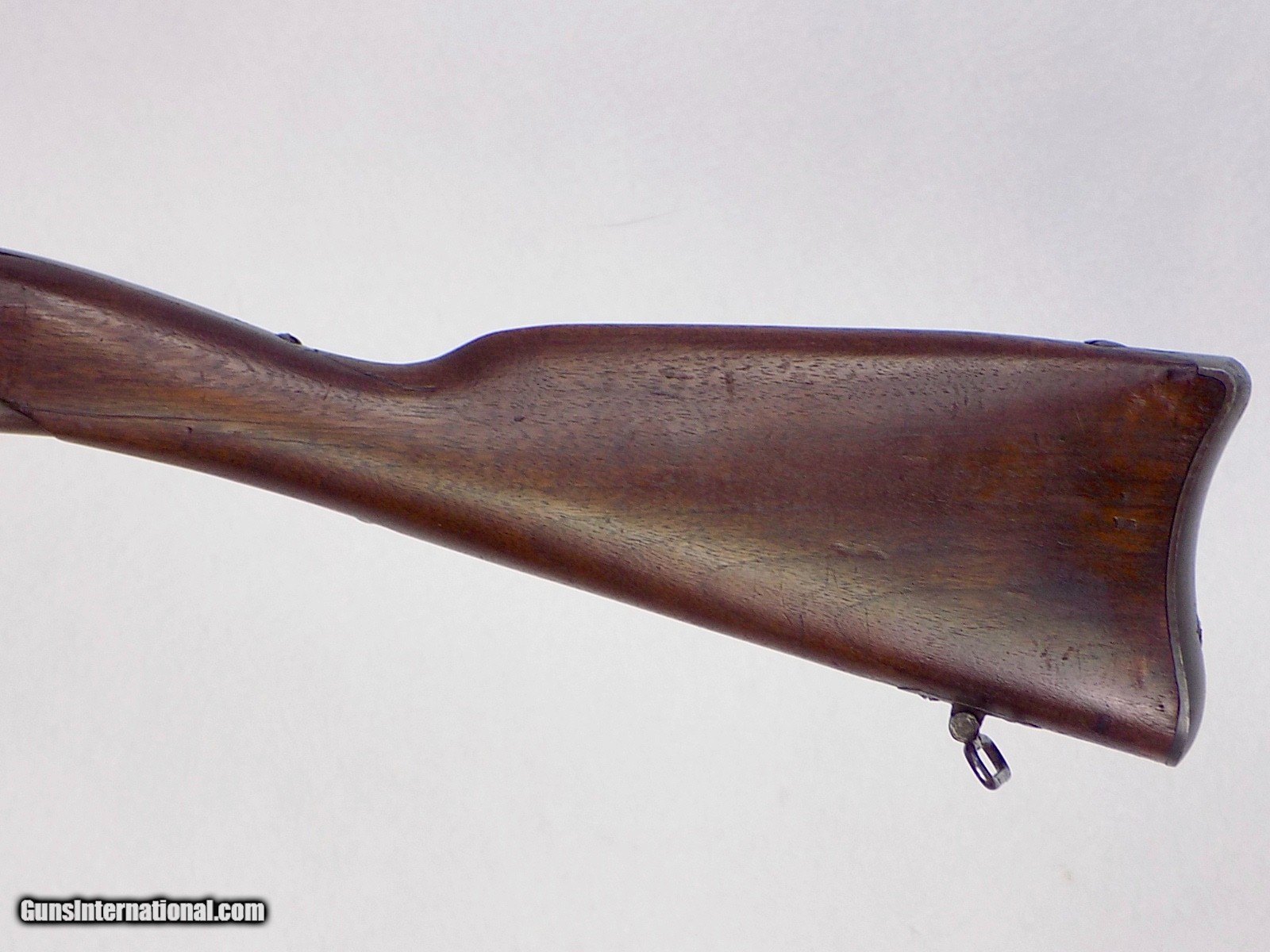 Description: #1185A TRIPLETT & SCOTT REPEATING CARBINE, 50 RF, SN 32XX, 22” bbl., sling swivels, original real sight, tubular magazine in stock, VG wood with usual light crack over magazine tube, 70% light blue on bbl., blue on action turning brown, marked “Kentucky” on action, locks up tight, scarce. $2500 SOLD Antique: Yes |
