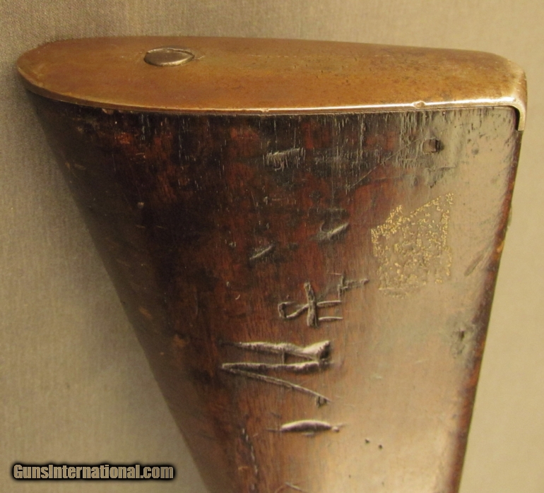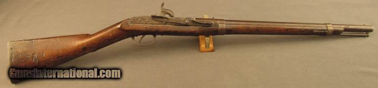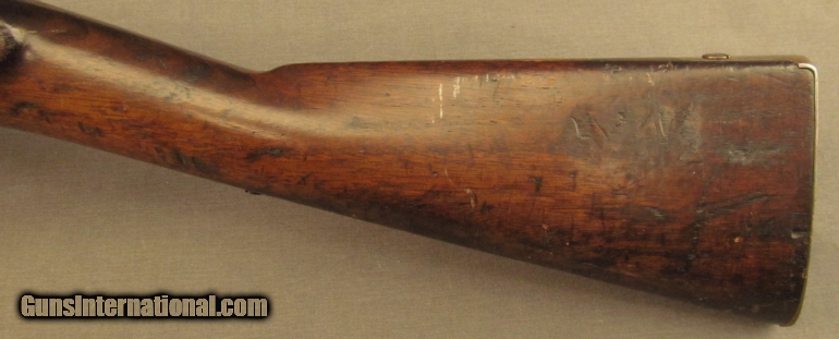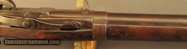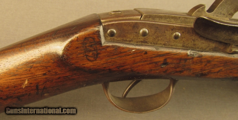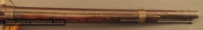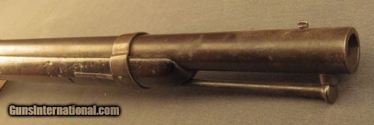 Description: NSN, .52 Caliber, 21" barrel with a very good, lightly freckled, rifled bore. This is a handsome example with a dark chocolate-brown patina along the barrel which mixes with spots of gray on the tilting breech piece. The original markings on the breech are no longer visible, save for the "C" in "CONN.", and there are traces of the original blue just visible along the side opening lever. The walnut stock has a fairly thick added varnish over numerous small handling marks and minor blemishes with still visible cartouches on the sides just ahead of the wrist and a carved marking on the right side of the butt which is difficult to make out; possibly, "11/5 N I (?)". The breech lifting mechanism is tight and fully functional as is the action itself. The carbine comes with an original metal ramrod and is in very good plus-near fine condition overall. Antique SOLD Antique: Yes Manufacturer: Hall Model: Carbine Caliber Info: .52 Cal Gauge Info: .52 Cal |