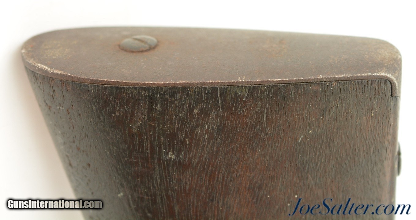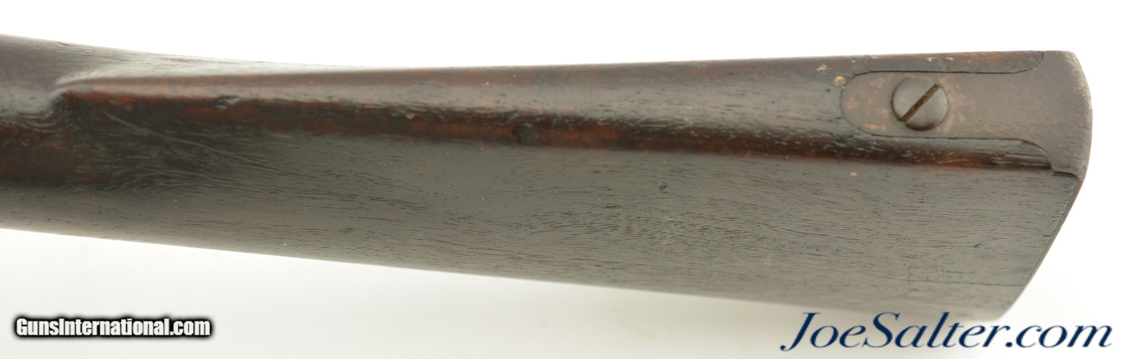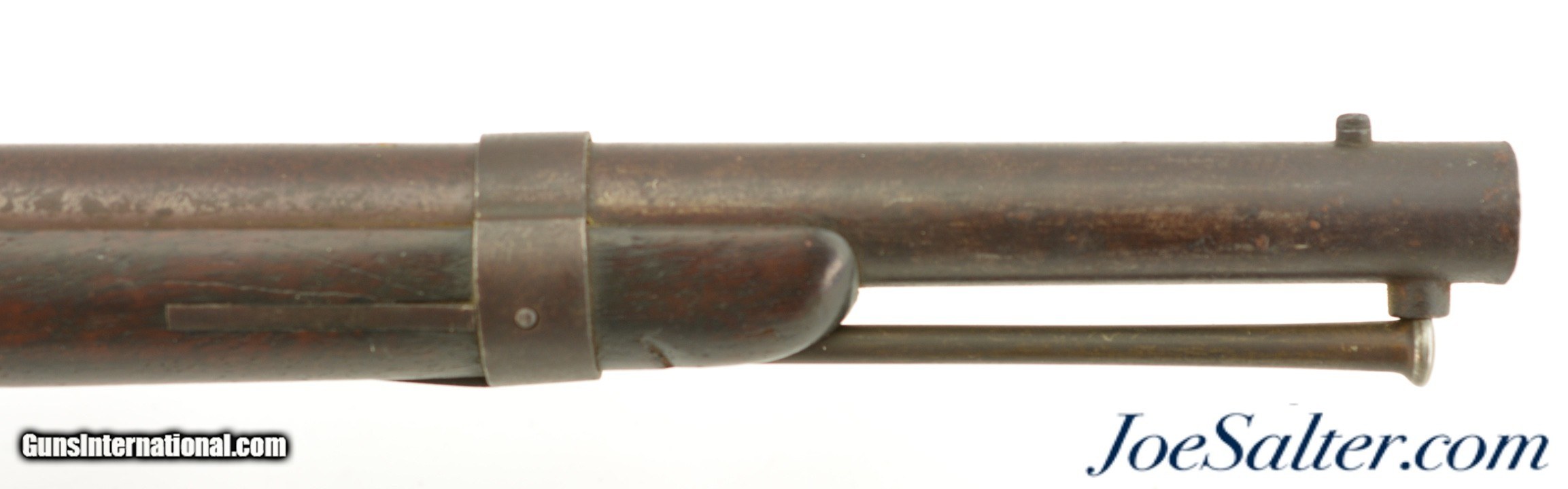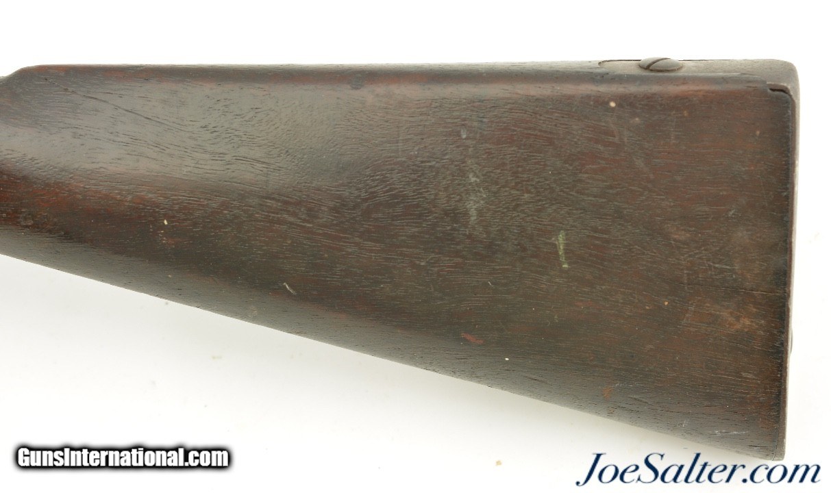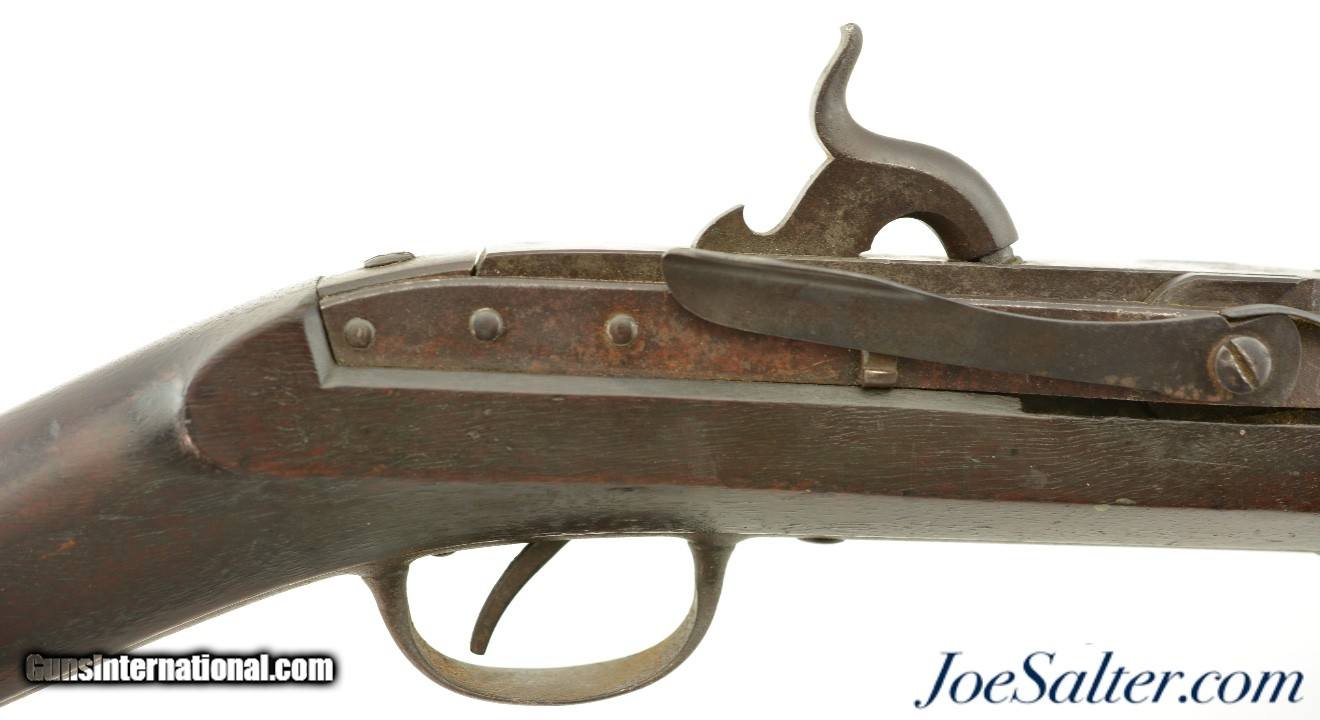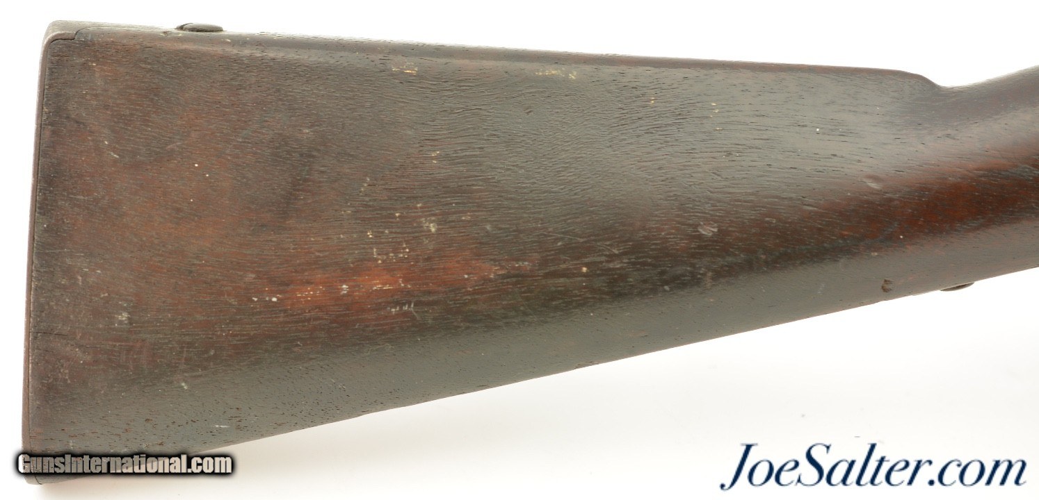 Description: NSN, .52 Caliber, 21" barrel with a good, lightly pitted bore. This is an 1848-dated carbine that has an overall plum-brown patina on the exposed metal, with some silvering at the muzzle as well as along the exposed edges and projections. There are patches of mild freckling and pinprick pitting scattered throughout, as well as some small impact marks on the barrel breech just ahead of the breechblock, on top of the breechblock around the "U.S. / S. NORTH / MIDDLTN / CONN / 1848" markings, and at the base of the percussion nipple. There are still traces of the original color case-hardening still visible on the protected flanks of the breechblock, visible on both sides when opened. The original walnut stock has an overall dark brown military oil finish with a soft, but still visible inspector cartouches on either side, just ahead of the wrist. The wood has numerous small handling marks and small blemishes scattered throughout with some straight line drying cracks on the left side running diagonally back from the action, and some further short drying cracks visible at the buttplate on the left side as well. The sling ring is still present, as is a correct iron ramrod. The action lock-up is still tight and the action functions flawlessly, catching firmly at both half and full-cock. This is a very good plus example of an unmodified Model 1843 Hall carbine, and would be a great addition to any collection of pre-Mexican War American military arms. Antique; SOLD Antique: Yes |