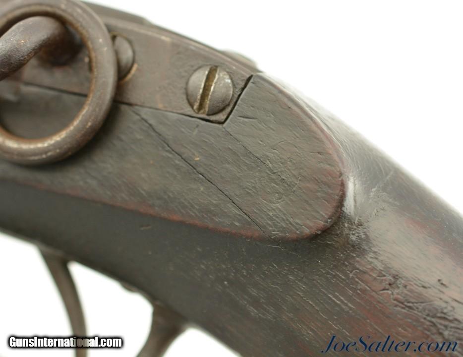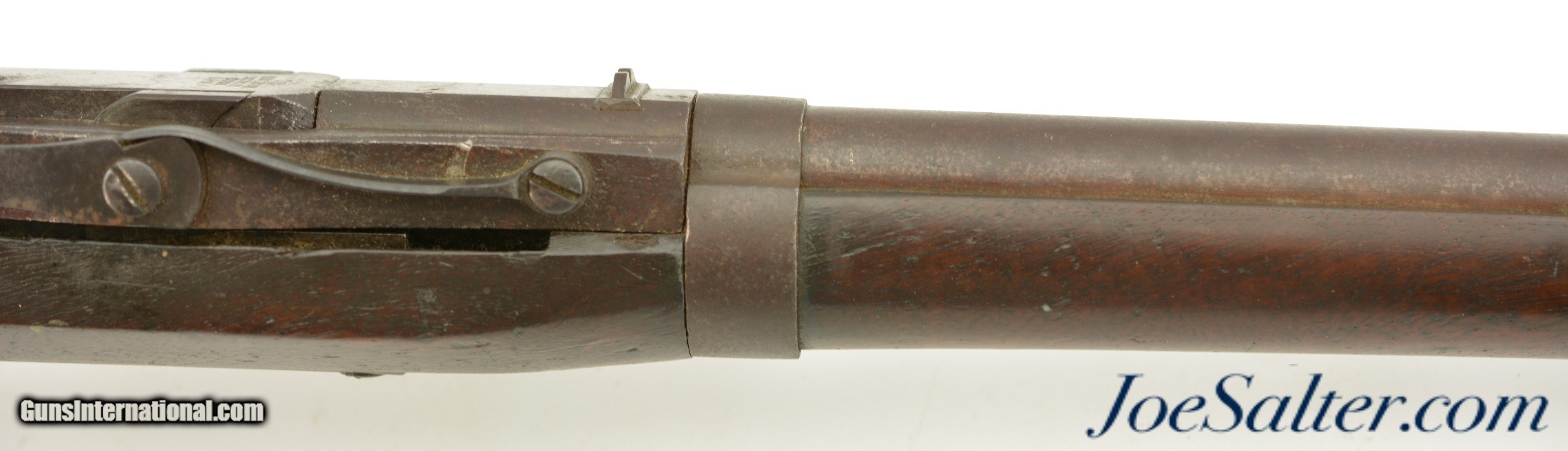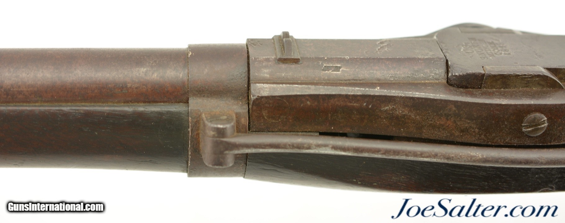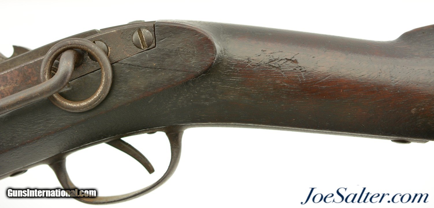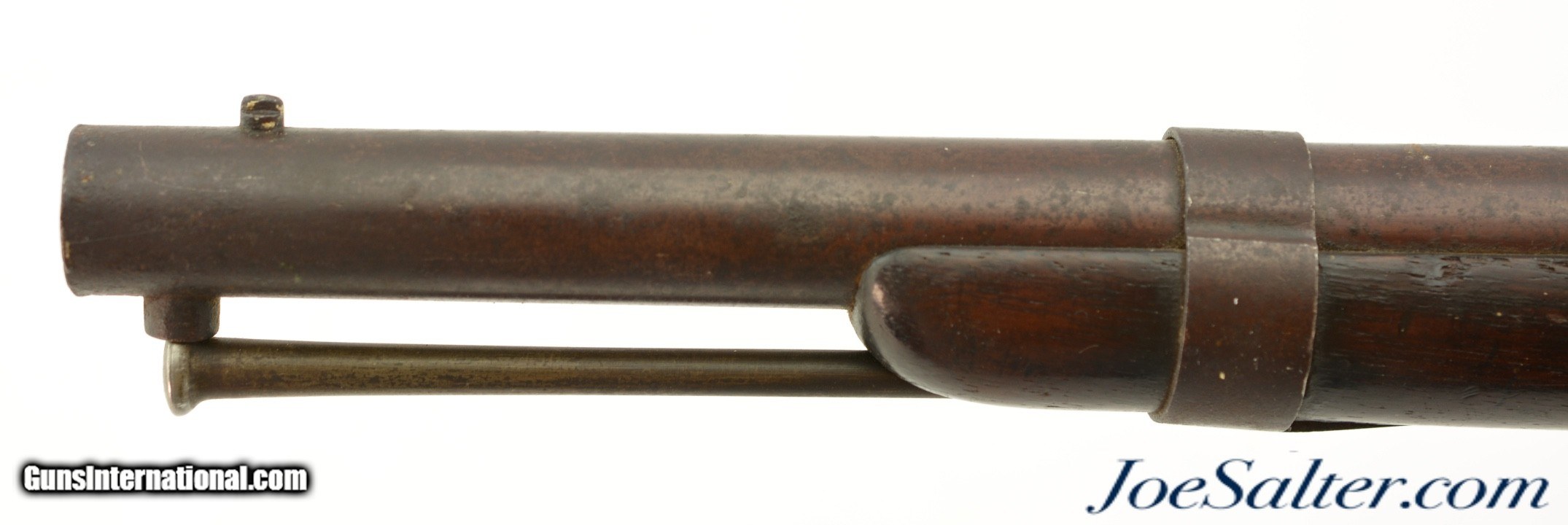 Description: NSN, .52 Caliber, 21" barrel with a good, lightly pitted bore. This is an 1848-dated carbine that has an overall plum-brown patina on the exposed metal, with some silvering at the muzzle as well as along the exposed edges and projections. There are patches of mild freckling and pinprick pitting scattered throughout, as well as some small impact marks on the barrel breech just ahead of the breechblock, on top of the breechblock around the "U.S. / S. NORTH / MIDDLTN / CONN / 1848" markings, and at the base of the percussion nipple. There are still traces of the original color case-hardening still visible on the protected flanks of the breechblock, visible on both sides when opened. The original walnut stock has an overall dark brown military oil finish with a soft, but still visible inspector cartouches on either side, just ahead of the wrist. The wood has numerous small handling marks and small blemishes scattered throughout with some straight line drying cracks on the left side running diagonally back from the action, and some further short drying cracks visible at the buttplate on the left side as well. The sling ring is still present, as is a correct iron ramrod. The action lock-up is still tight and the action functions flawlessly, catching firmly at both half and full-cock. This is a very good plus example of an unmodified Model 1843 Hall carbine, and would be a great addition to any collection of pre-Mexican War American military arms. Antique; SOLD Antique: Yes |