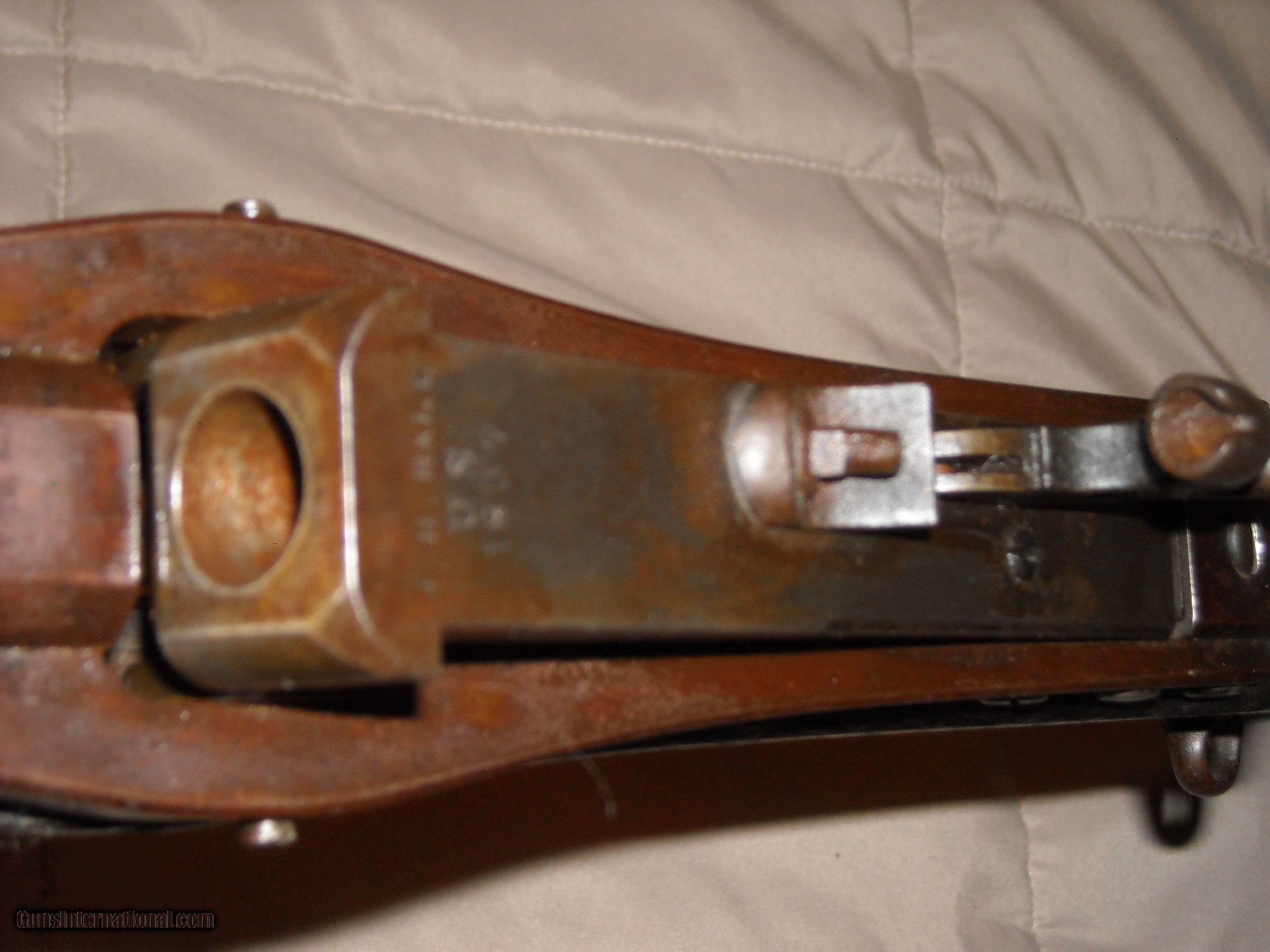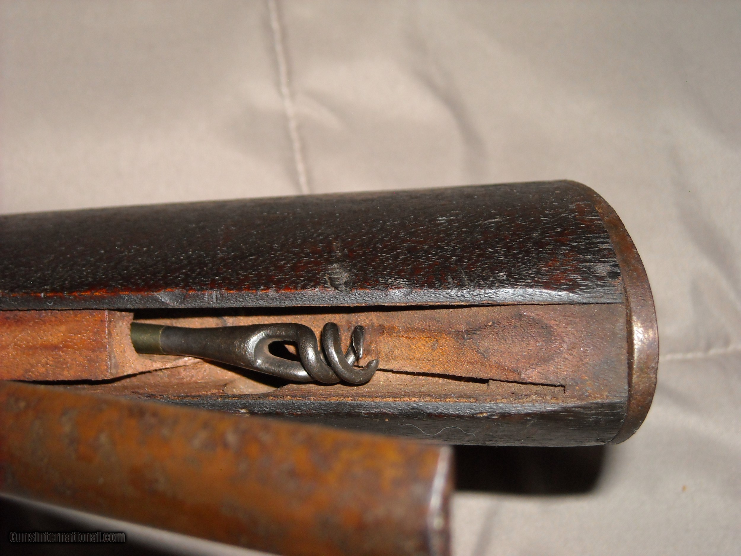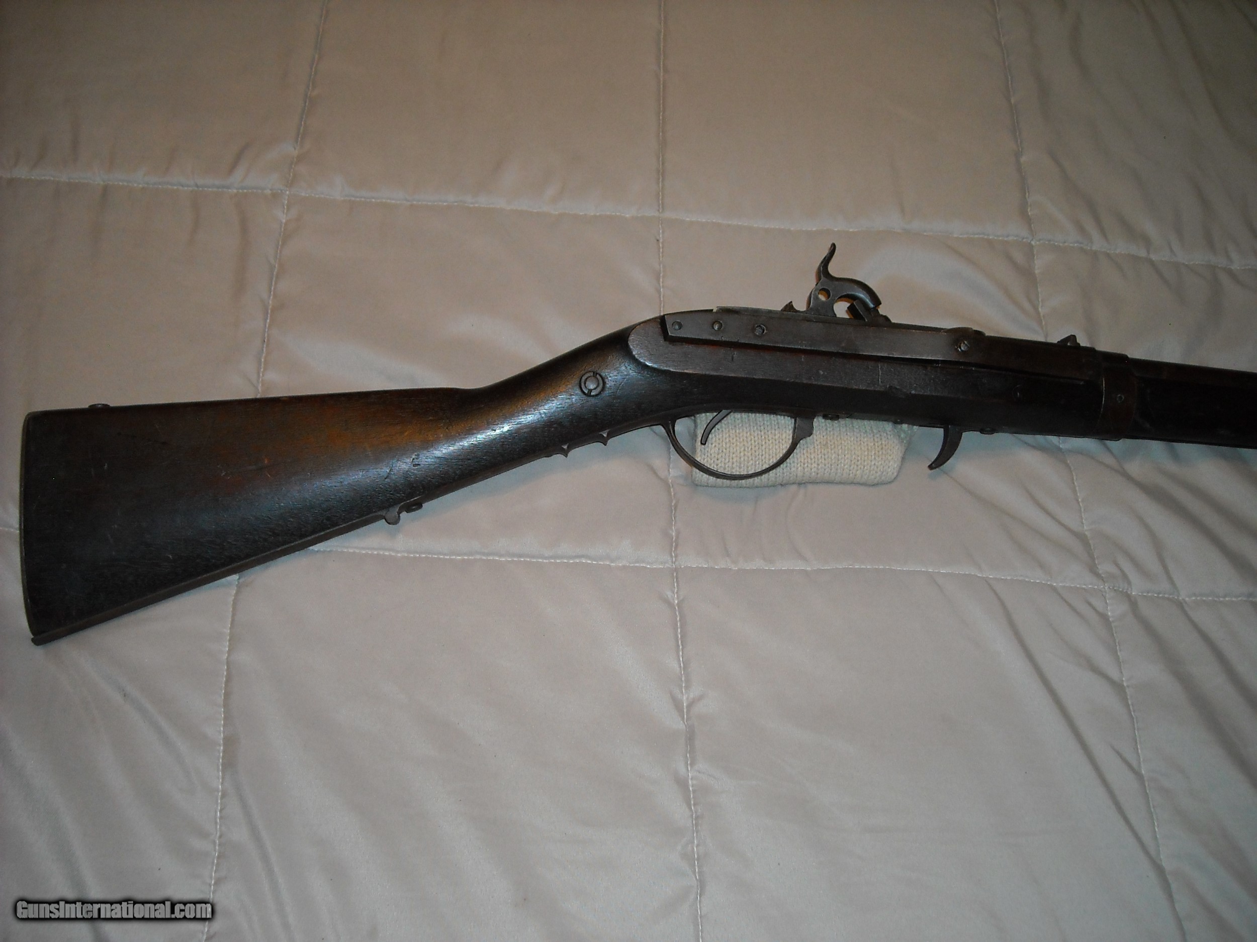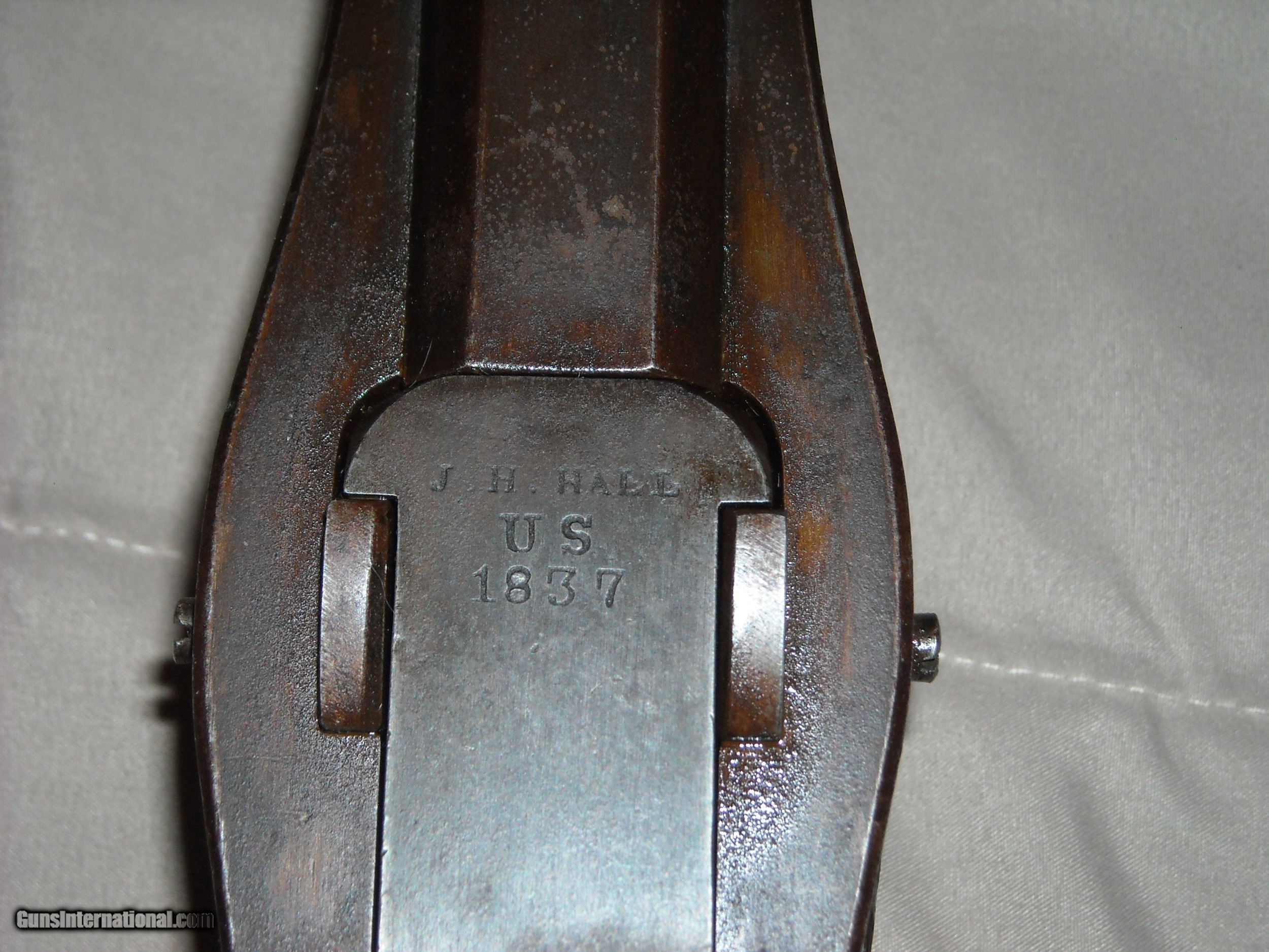 Description: This is a very fine condition John H. Hall patent breech loading Model 1836 breech loading carbine. A total 0f 2,020 of these carbines were manufctured in 1837-1838 at the Hall Rifle Works, Harper's Ferry Arsenal. The guns were finished in arsenal brown lacquer on the barrel and mounts with a case hardened action. The gun is fitted with a unique sliding ramrod/bayonet under the barrel held in place by a very strong spring. The bayonet was polished bright steel. Caliber is .64 smoothbore. The gun also features an eye bolt sling swivel attachment mounted through the wrist of the stock. This example is also the more desirable early type one fitted with an implement compartment on the underside of the stock. Amazingly, the gun still retains its original long shank cork screw ball puller/cleaning attachment tool in the compartment as shown in the photos. The only markings on these guns is "J.H. Hall, US, 1837" stamped in 3 lines at the front top of the breech block, the markings are extra crisp. These Model 1836 Hall carbines do not bear any inspection stamps in the metal or wood. This example is in very fine untouched uncleaned condition. The barrel and mounts retain 80% of the original fragile brown lacquer finish mixing with natural patina. Breech block is natural aged gun metal perfectly smooth steel, no pitting evident. Actions are very fine and tight and work smoothly. The .64 caliber smooth bore is excellent smooth bright and appears unfired. All original screws are very fine. The stock is totally untouched as well showing a deep blackish brown oilf finish and raised grain with sharp edges, no splits, cracks, or missing chips. The history of these guns is that they were issued to the 2nd U.S. Dragoons who at the time were fighting the Seminole and Creek Indians in Florida. These guns replaced the Model 1833 Hall Dragoon carbines these troops were previously issued. With only 2,020 guns produced and seeing hard use in the harsh Florida Everglades climate, surviving specimens in this exceptional condition ae fairly scarce. Here's your opportunity to add a very nice example of this scarce carbine to your collection. SOLD Antique: Yes |