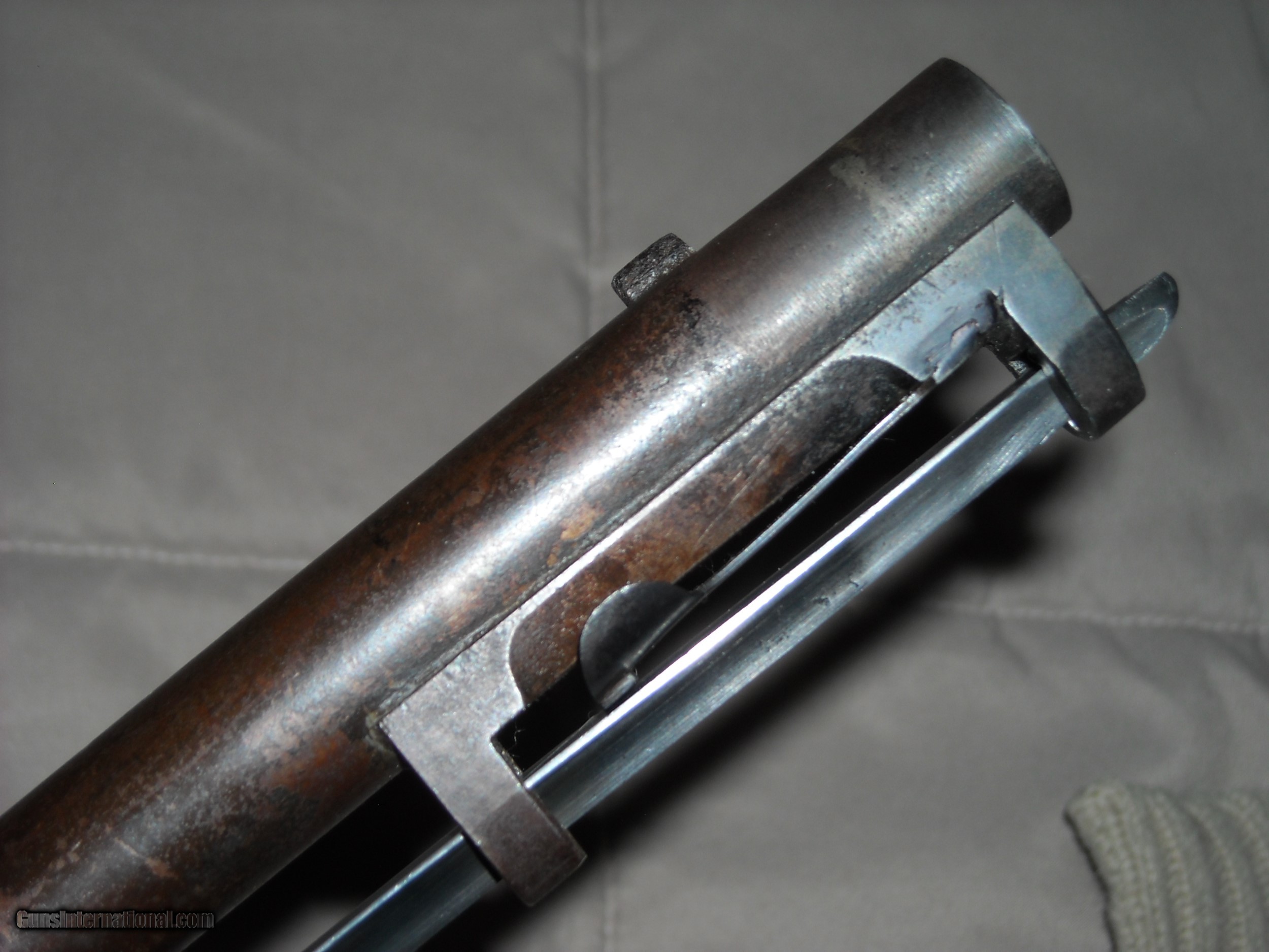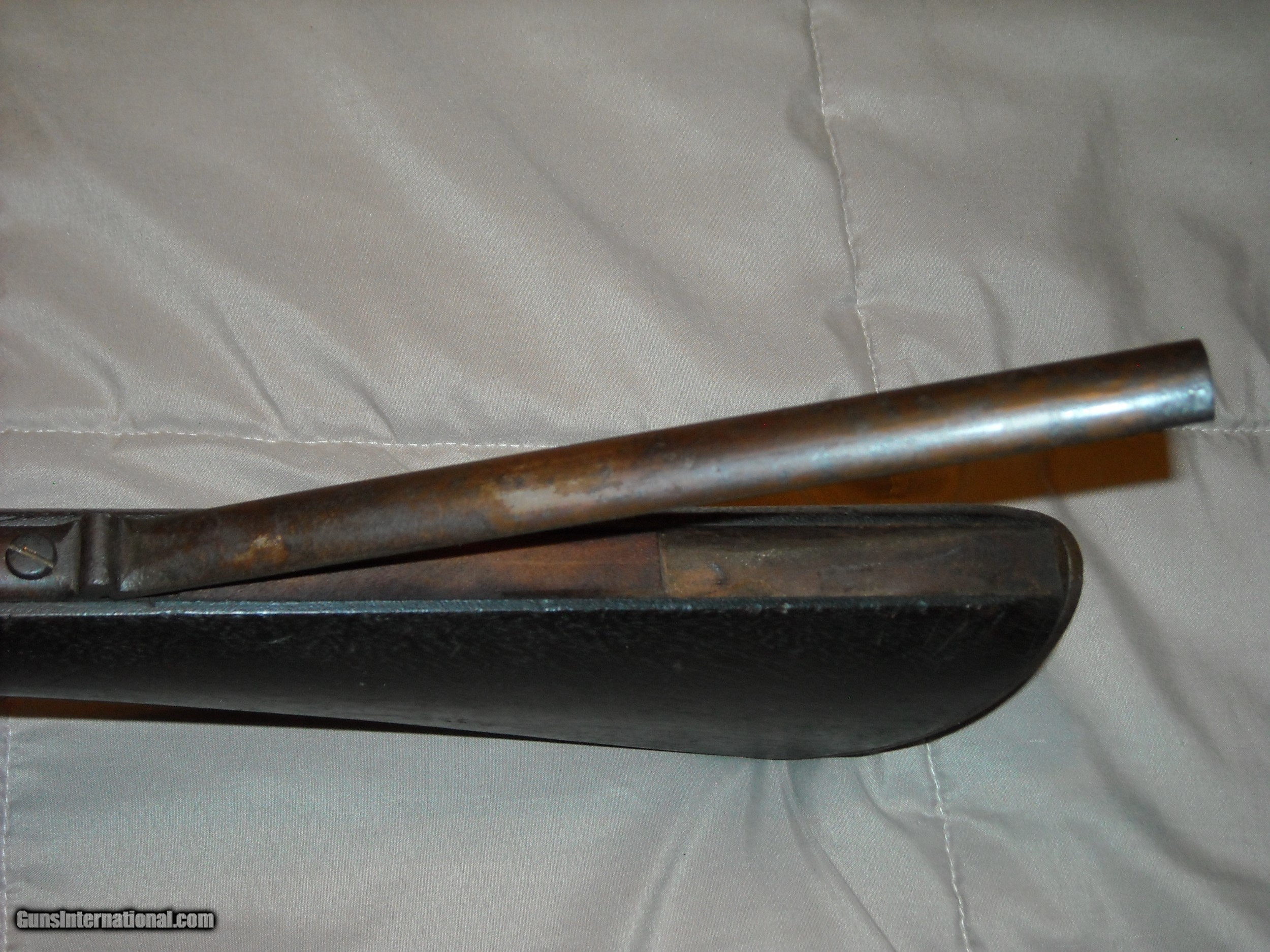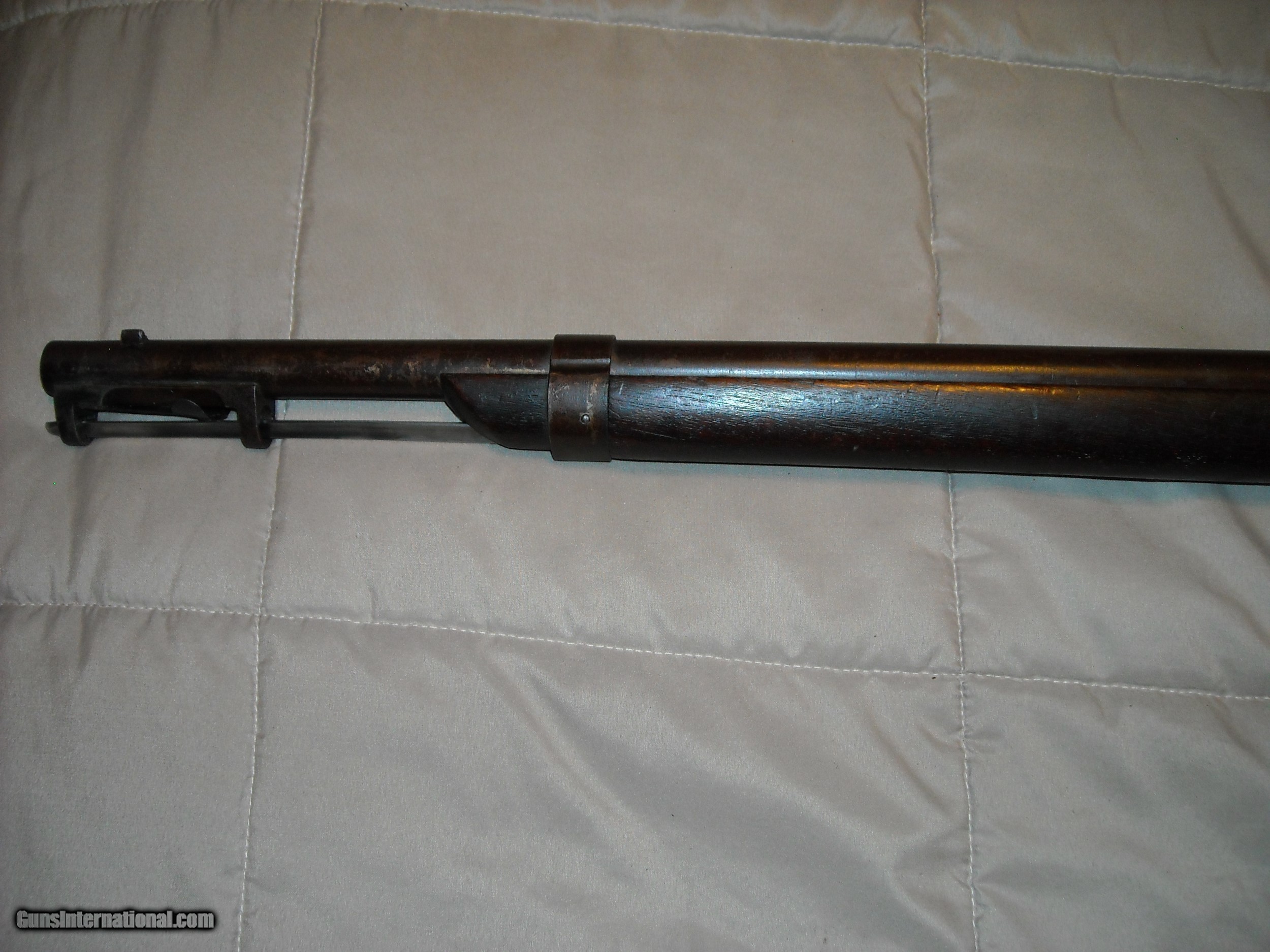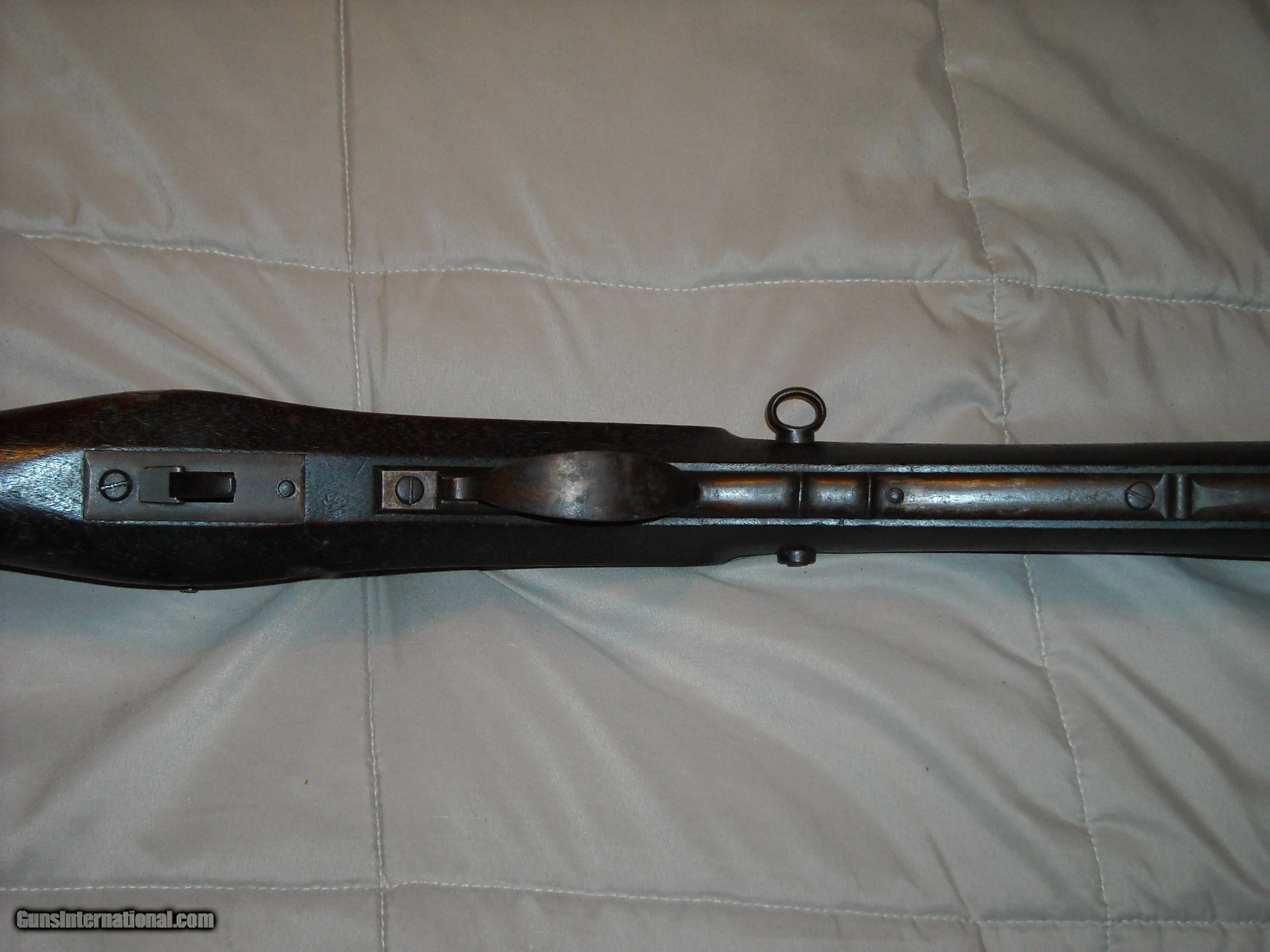 Description: This is a very fine condition John H. Hall patent breech loading Model 1836 breech loading carbine. A total 0f 2,020 of these carbines were manufctured in 1837-1838 at the Hall Rifle Works, Harper's Ferry Arsenal. The guns were finished in arsenal brown lacquer on the barrel and mounts with a case hardened action. The gun is fitted with a unique sliding ramrod/bayonet under the barrel held in place by a very strong spring. The bayonet was polished bright steel. Caliber is .64 smoothbore. The gun also features an eye bolt sling swivel attachment mounted through the wrist of the stock. This example is also the more desirable early type one fitted with an implement compartment on the underside of the stock. Amazingly, the gun still retains its original long shank cork screw ball puller/cleaning attachment tool in the compartment as shown in the photos. The only markings on these guns is "J.H. Hall, US, 1837" stamped in 3 lines at the front top of the breech block, the markings are extra crisp. These Model 1836 Hall carbines do not bear any inspection stamps in the metal or wood. This example is in very fine untouched uncleaned condition. The barrel and mounts retain 80% of the original fragile brown lacquer finish mixing with natural patina. Breech block is natural aged gun metal perfectly smooth steel, no pitting evident. Actions are very fine and tight and work smoothly. The .64 caliber smooth bore is excellent smooth bright and appears unfired. All original screws are very fine. The stock is totally untouched as well showing a deep blackish brown oilf finish and raised grain with sharp edges, no splits, cracks, or missing chips. The history of these guns is that they were issued to the 2nd U.S. Dragoons who at the time were fighting the Seminole and Creek Indians in Florida. These guns replaced the Model 1833 Hall Dragoon carbines these troops were previously issued. With only 2,020 guns produced and seeing hard use in the harsh Florida Everglades climate, surviving specimens in this exceptional condition ae fairly scarce. Here's your opportunity to add a very nice example of this scarce carbine to your collection. SOLD Antique: Yes |