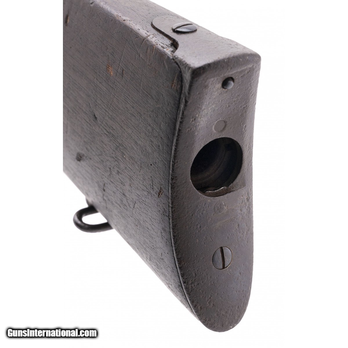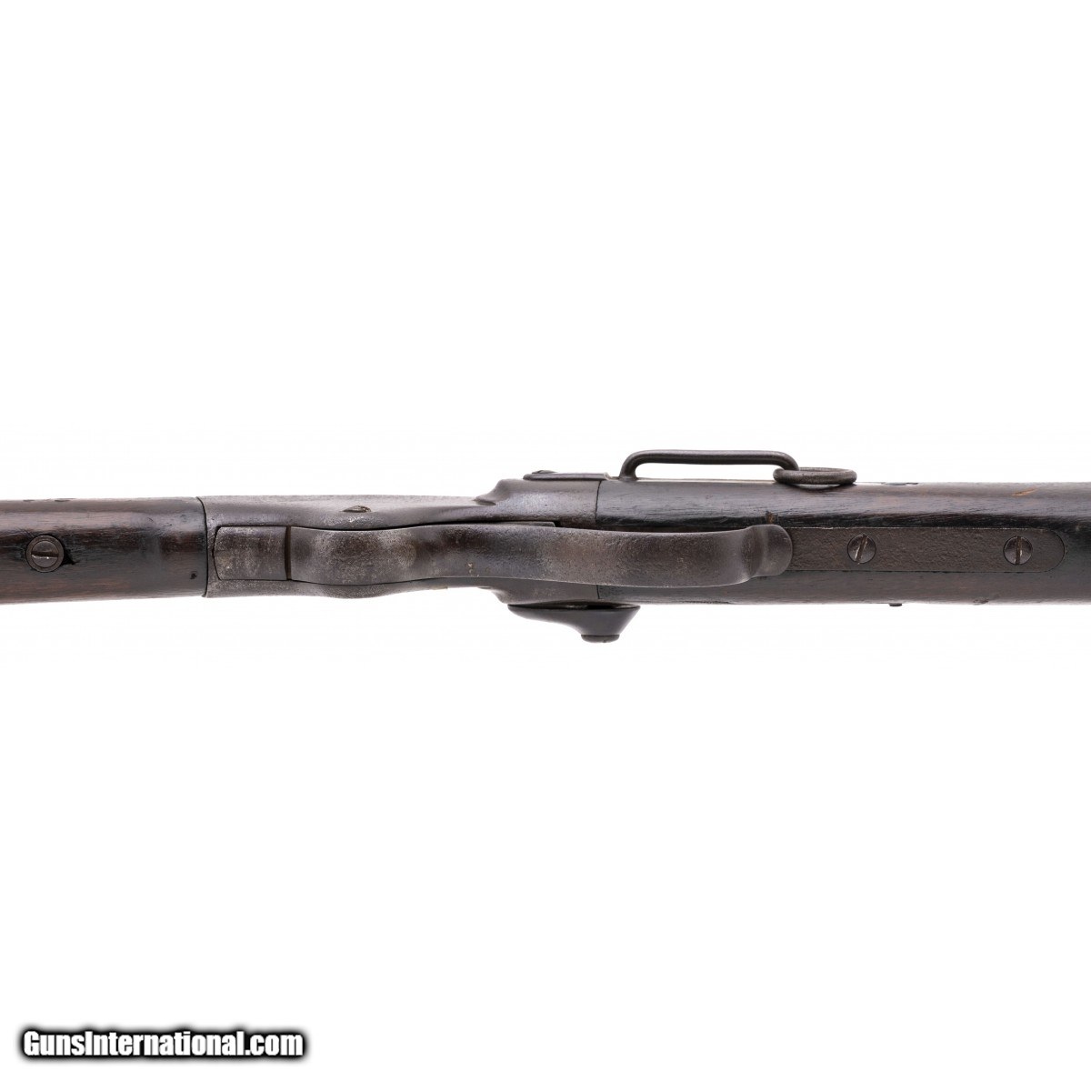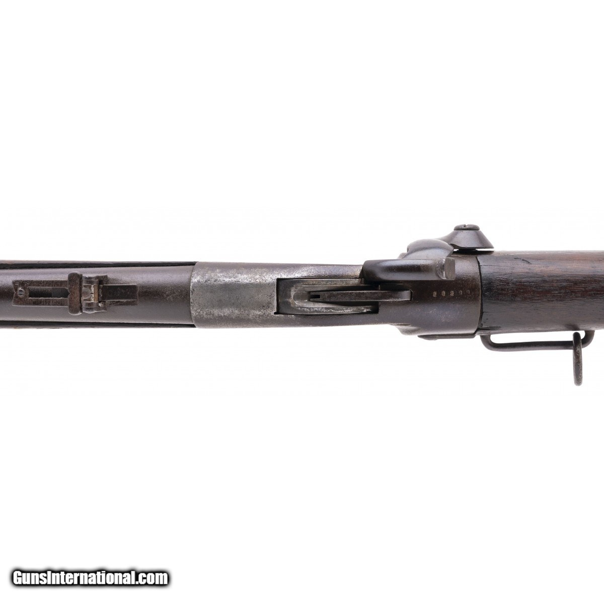Description: " Serial No. 56299, circa 1863-1865, .52 caliber, 22"" round barrel. Barrel and receiver are a dark brown/ grey patina with surface oxidation visible. Bore is dark with heavy pitting noted, 6 groove rifling is faint but present. Stock has expected nicks, dings, and scratches from handling and usage wear. Magazine tube is missing, action does not function correctly as breech does not close all the way. Consignment SOLD Antique: Yes |