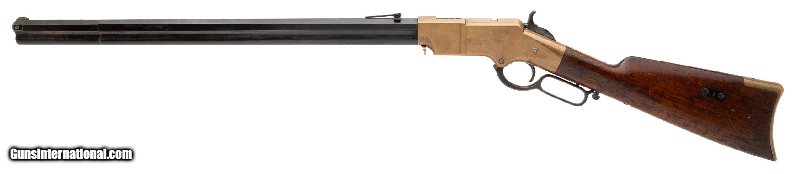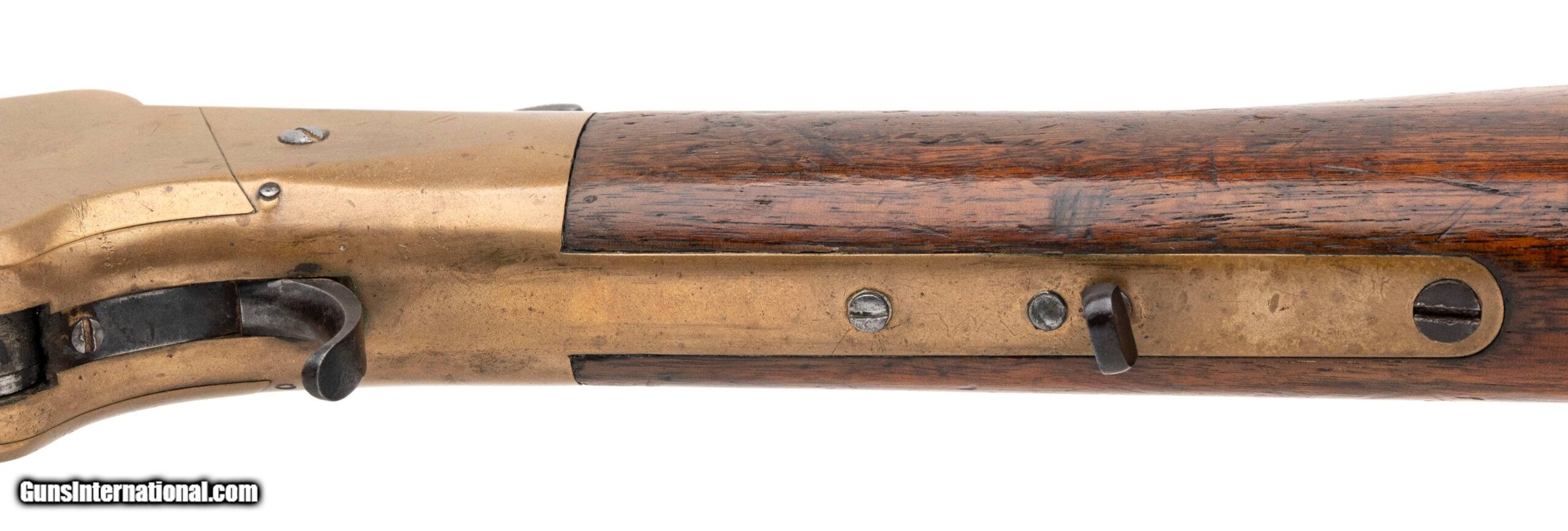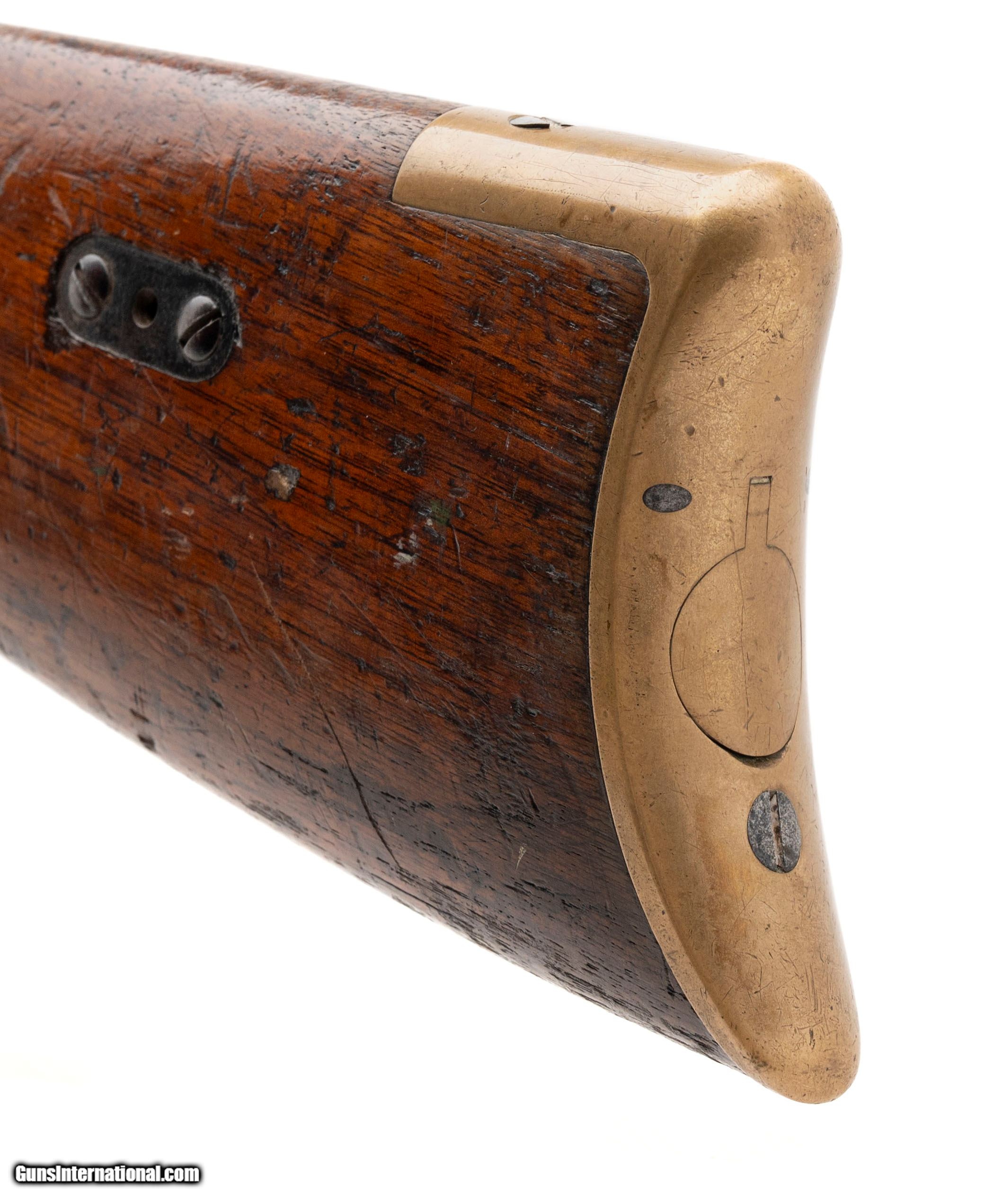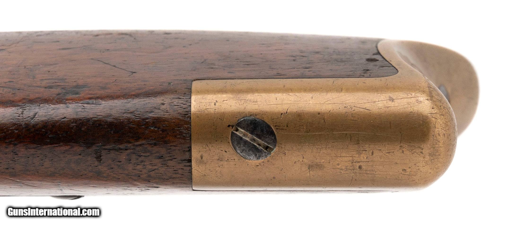 Description: "Serial number 2249. Made in 1863. 44 RF caliber with a 24.25" barrel. This gun has a later Henry barrel that is numbered 10317 to the frame which is all correctly matching with the serial number 2249. The frame, stock butt plate and all of the screws are matching. The only non matching part is the barrel. The barrel was made in 1865 after the civil war, so it is possible the original barrel was damaged and then replaced. It certainly matches the condition of the rest of the gun and appears to have been together since the time of use. The barrel has a dark brown patina and remains sharp. All markings are clear. The elevator on the rear sight is missing. The frame was cleaned at some time, but is now starting to age into a golden patina. The wood is original and just slightly undersized at the frame due to shrinkage. There has been no refinishing. This gun falls in the range of the 1st Washington D. C. cavalry guns which were used to protect the capital. All of these guns had sling swivels as this one does. All in all this is a very attractive Civil war Henry RifleĀ Antique: Yes Price: $21,500.00 Contact Seller |