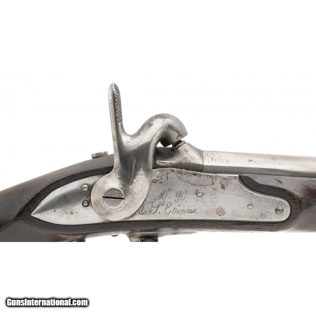 Description: " NSN, .71 caliber with a 41.5"" round barrel. Musket has been converted to percussion and imported for the American Civil War. Lock plate is marked St. Etienne, Barrel is dated 1862. Metal is in the bright with light surface oxidation noted. Stock is good with minor handling wear visible, action functions correctly. SOLD Antique: Yes |