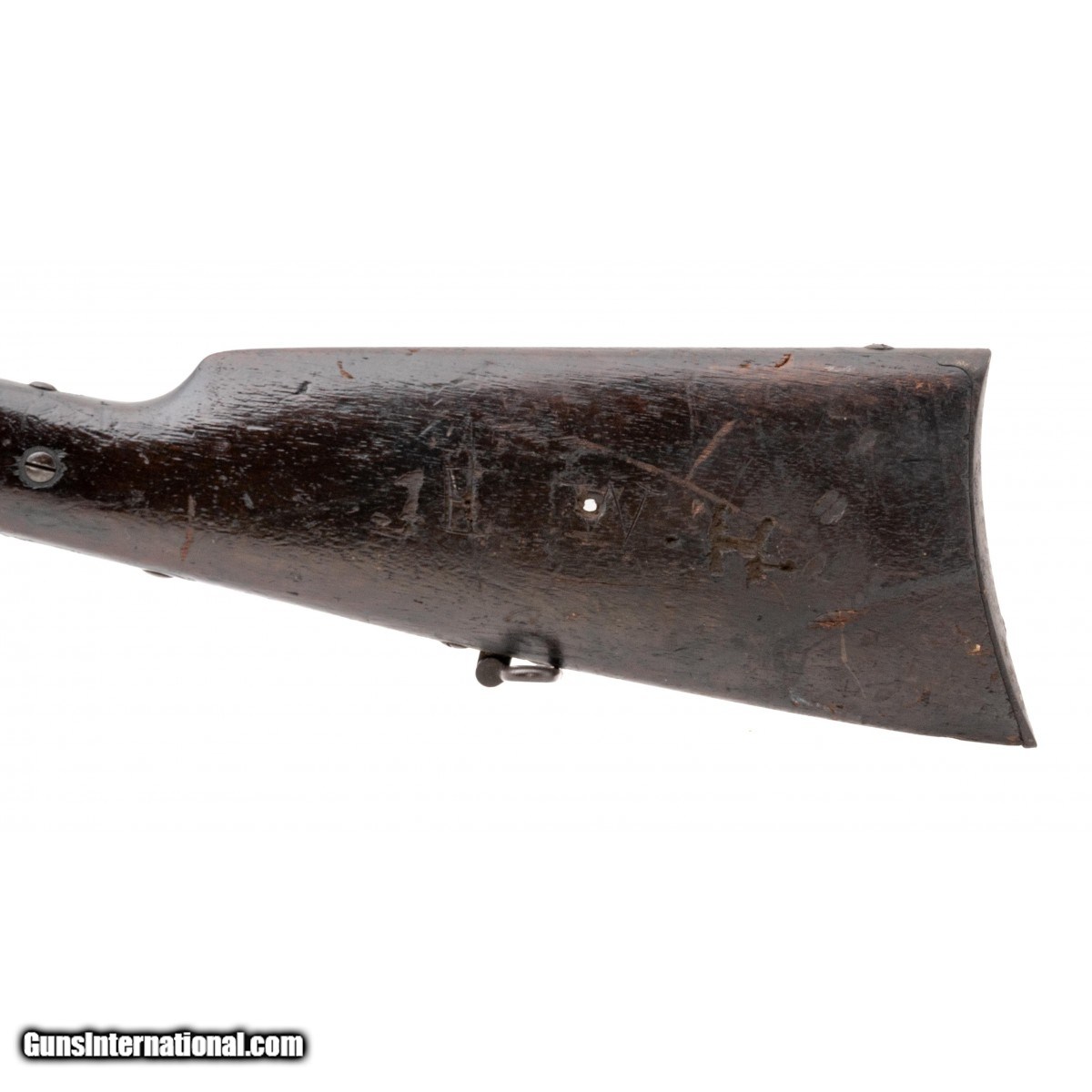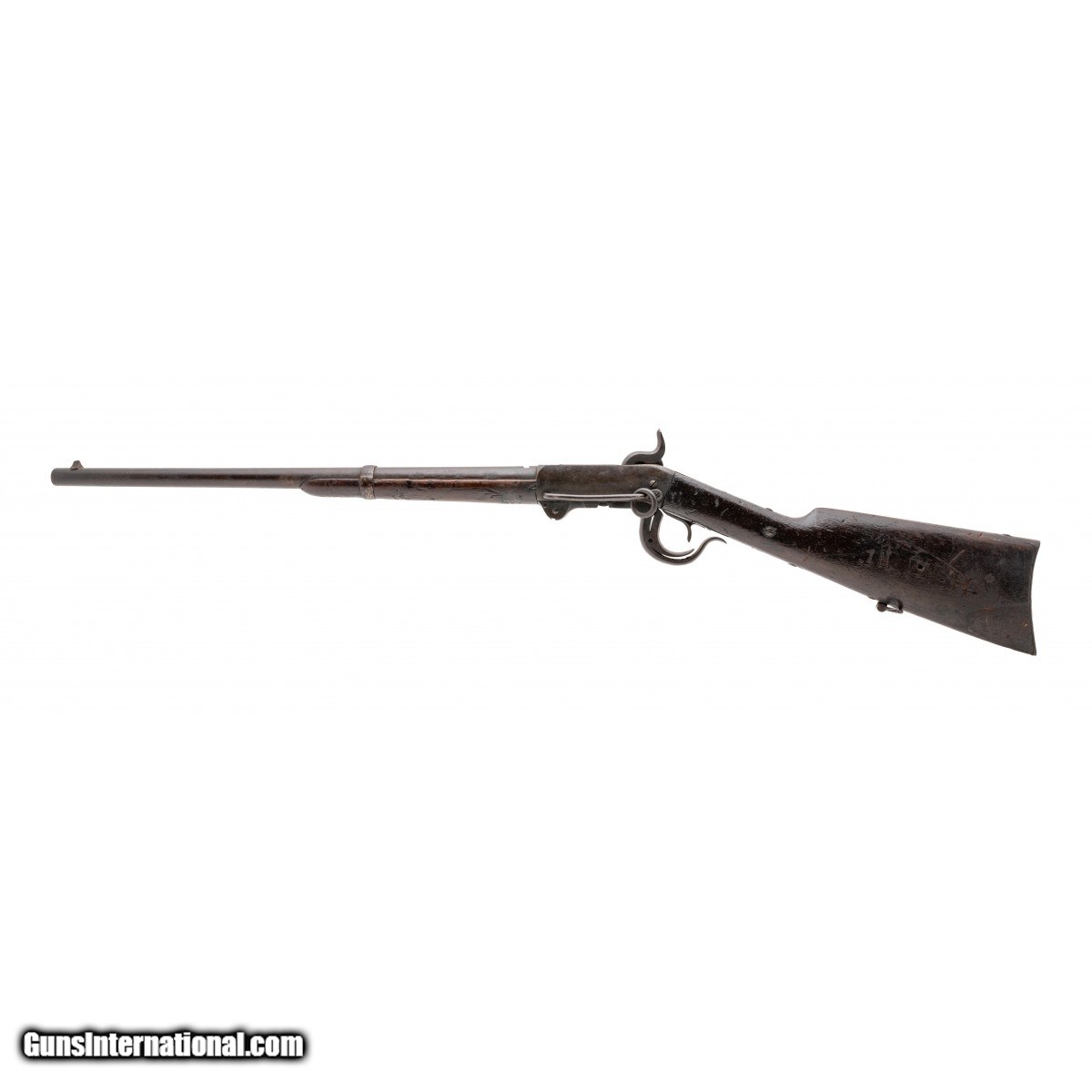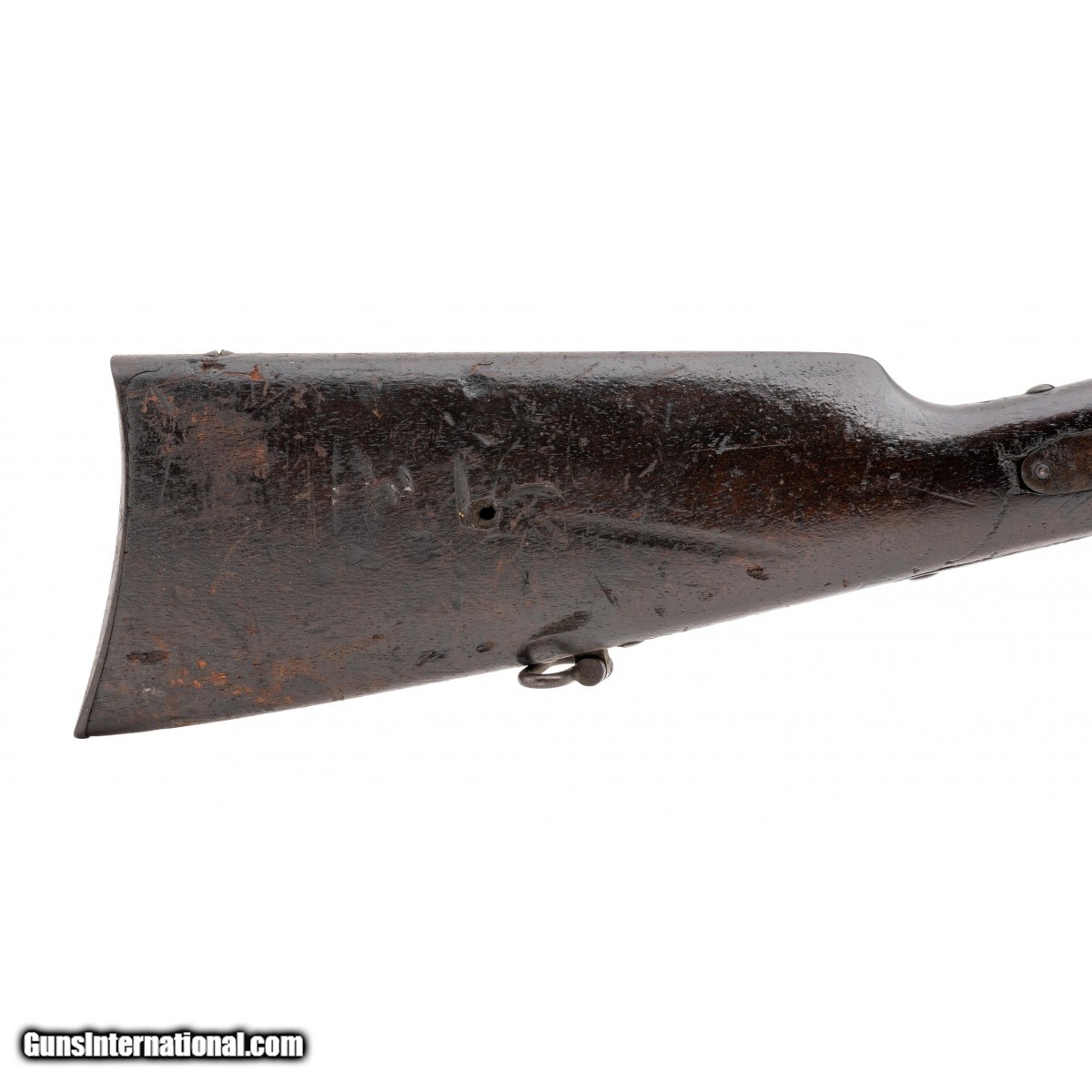 Serial No. 28806, circa 1863-1864, .54 caliber, 21"" round barrel. Overall condition is untouched, oxidation is noted on all metal parts and is a dark brown/grey patina. Bore is poor with heavy oxidation visible in the lands and grooves. Rear sight is missing, nipple and ignition system will detach from the breech. Factory markings are visible and legible. Stock shows heavy ""combat"" use with initials carved into the left side. Action does not hold at half or full cock. Carbine looks like its seen some action!