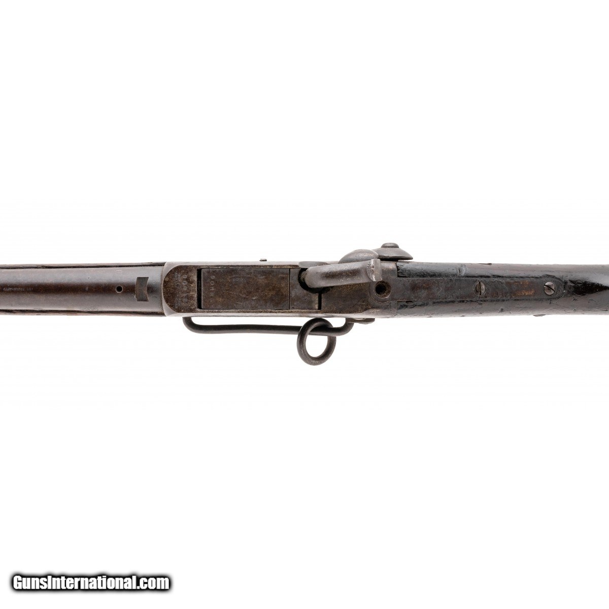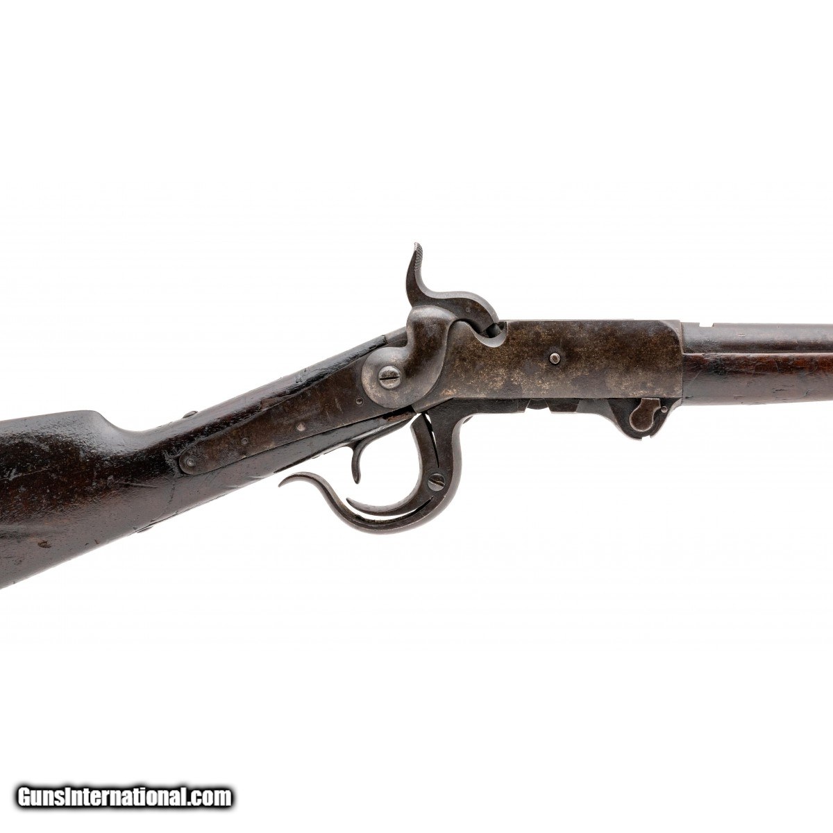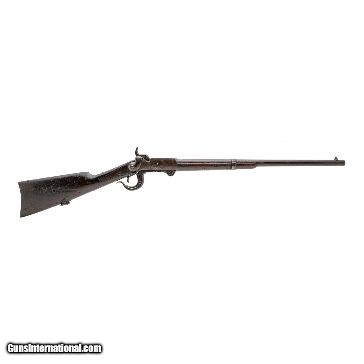 Serial No. 28806, circa 1863-1864, .54 caliber, 21"" round barrel. Overall condition is untouched, oxidation is noted on all metal parts and is a dark brown/grey patina. Bore is poor with heavy oxidation visible in the lands and grooves. Rear sight is missing, nipple and ignition system will detach from the breech. Factory markings are visible and legible. Stock shows heavy ""combat"" use with initials carved into the left side. Action does not hold at half or full cock. Carbine looks like its seen some action!